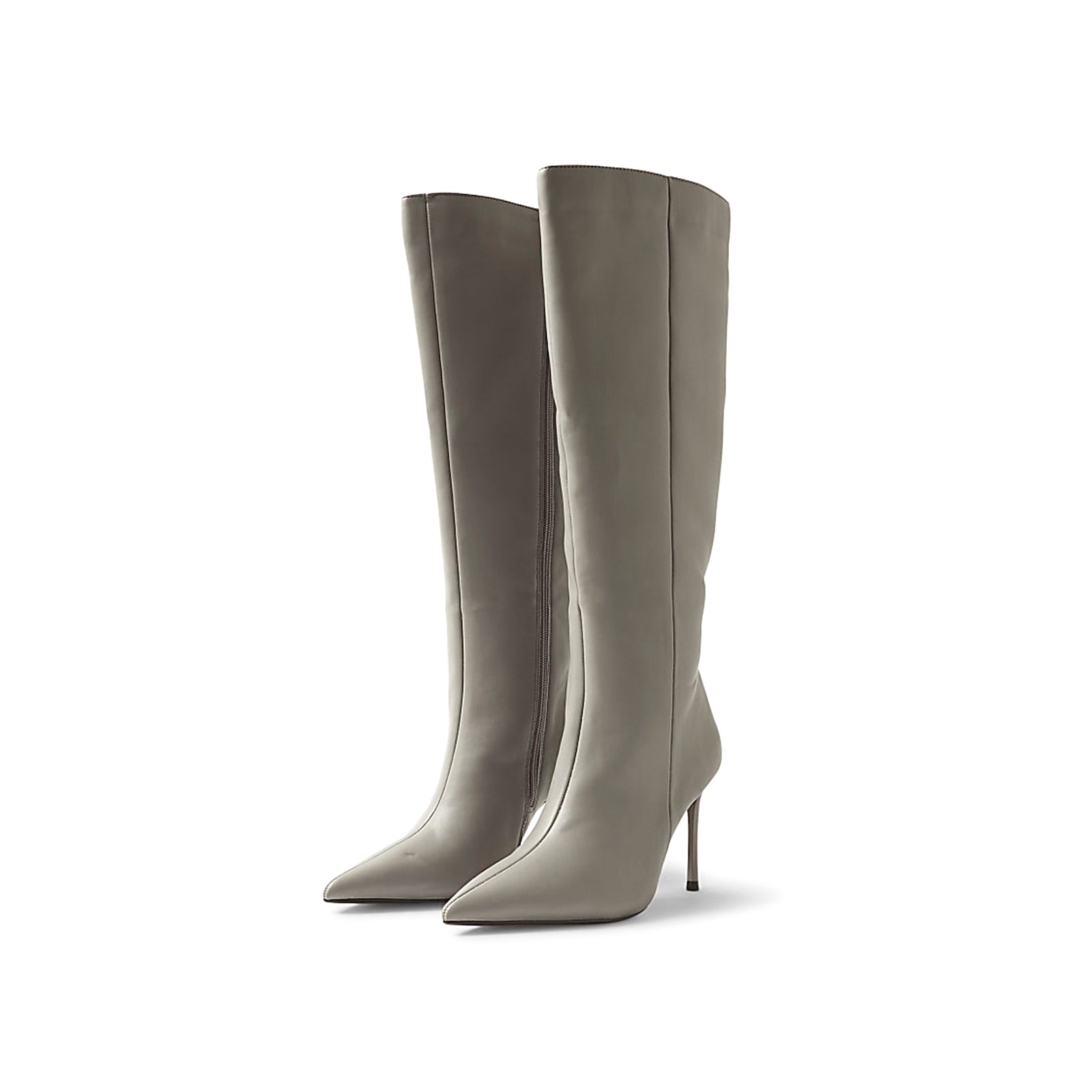 Gray Pointed-Toe Sleek Full-Zip Knee High Stiletto Boots.