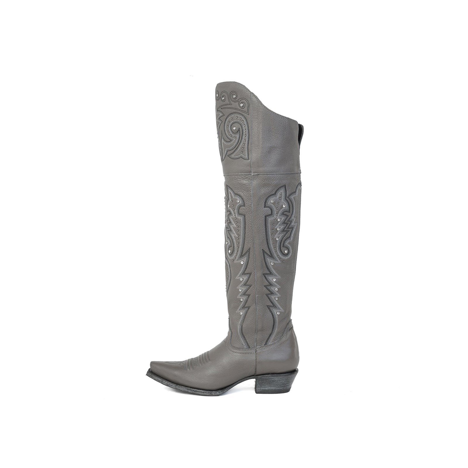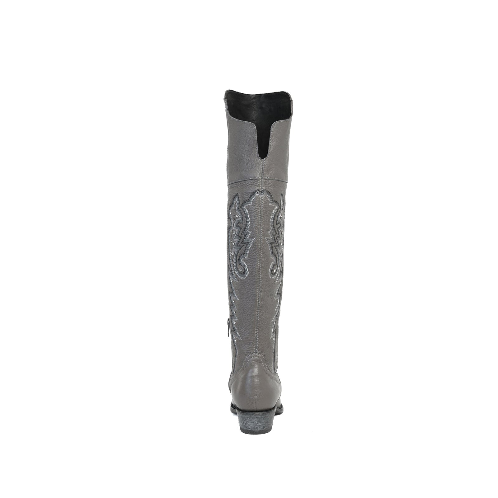 Gray Snip-Toe Embroidery Rhinestone Studs Half-Zip Knee High Cowgirl Boots.