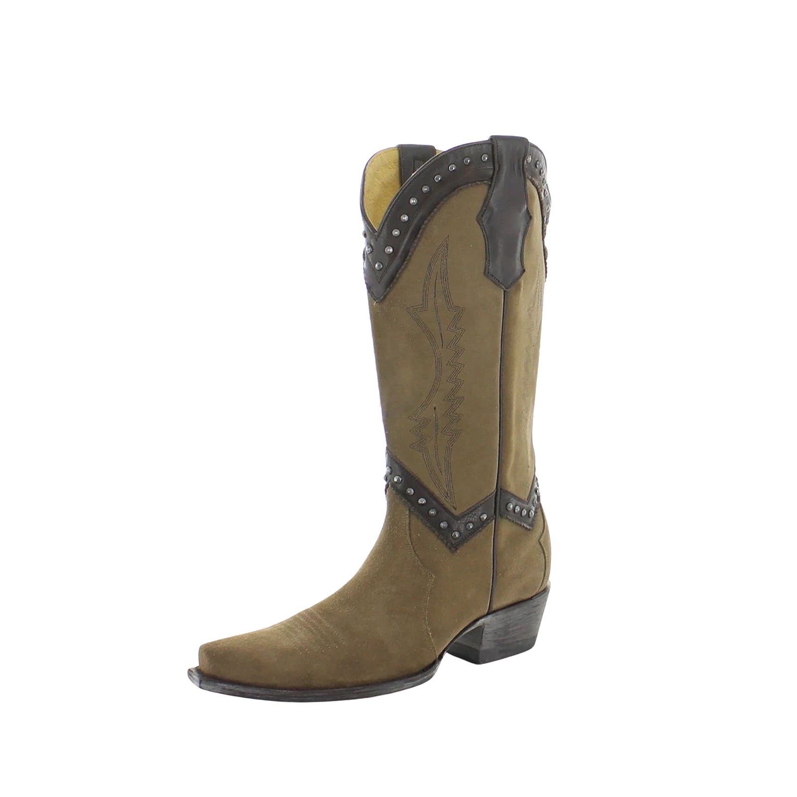 Khaki Faux Suede Snip-Toe Embroidery Studded Mid Calf Cowgirl Boots.