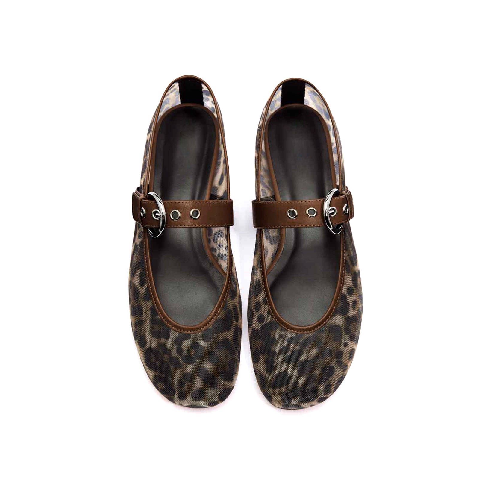 Leopard Mesh Square-Toe Classic Buckle Bridge Strap Ballet Flats.