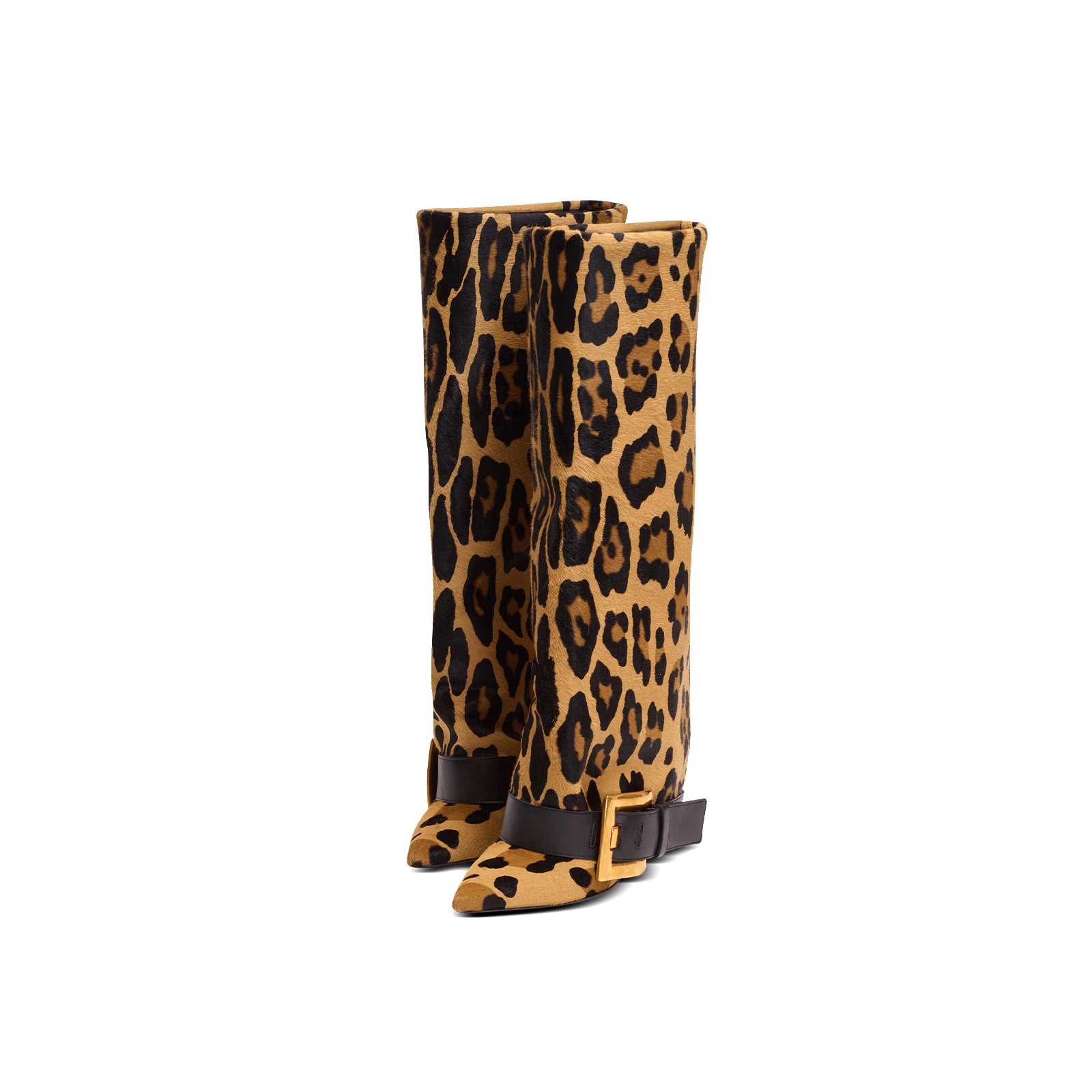 Leopard Pointed-Toe Bottom Buckle Fold-Over Wide Calf Knee High Stiletto Boots.