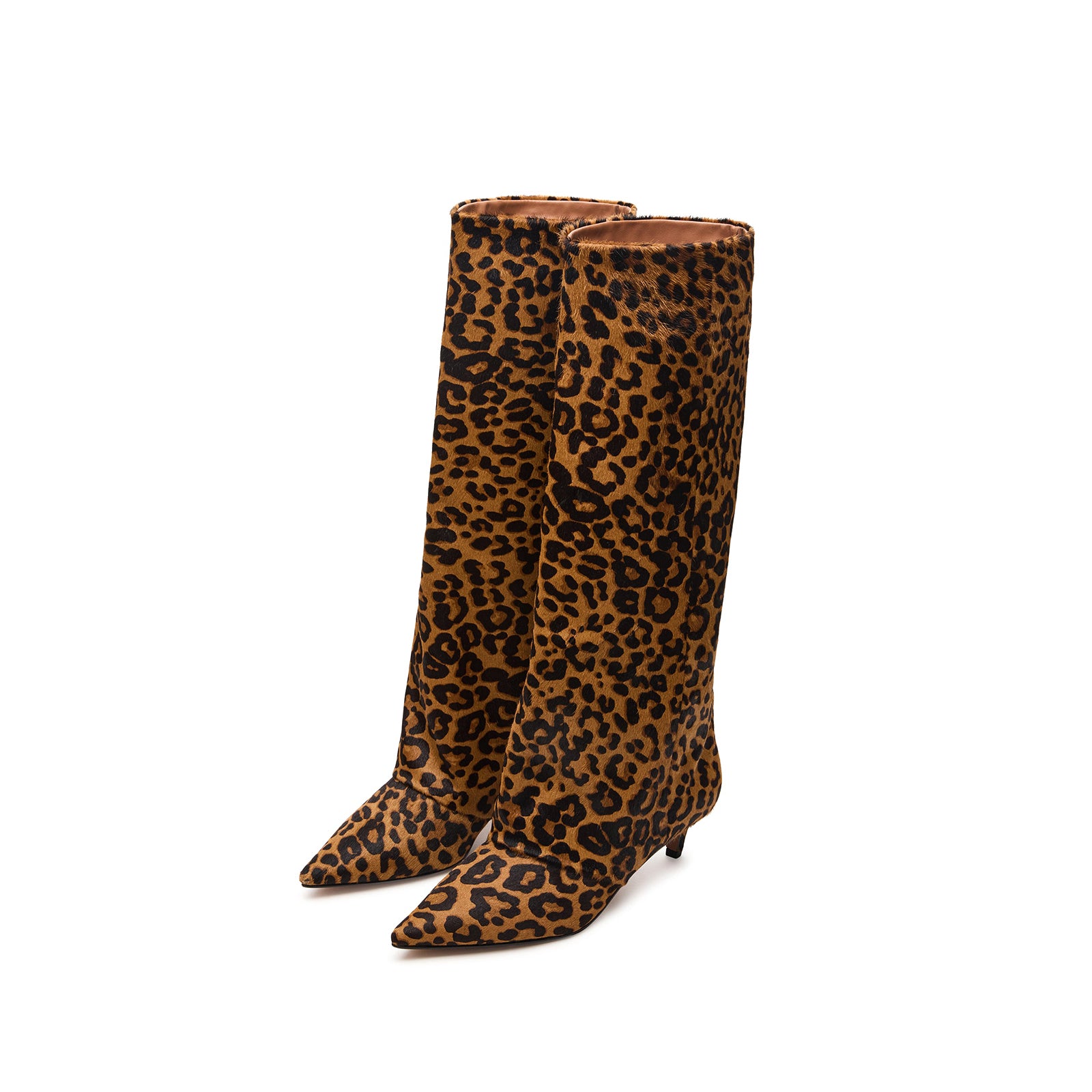 Leopard Pony Hair Pointed-Toe Sleek Wide Calf Knee High Stiletto Boots.