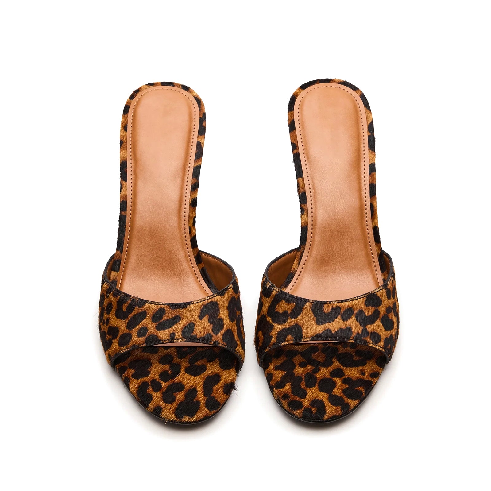 Chic and versatile, these mules blend sleek leopard pony hair with a timeless round-toe profile, perfect for both casual elegance and evening sophistication.