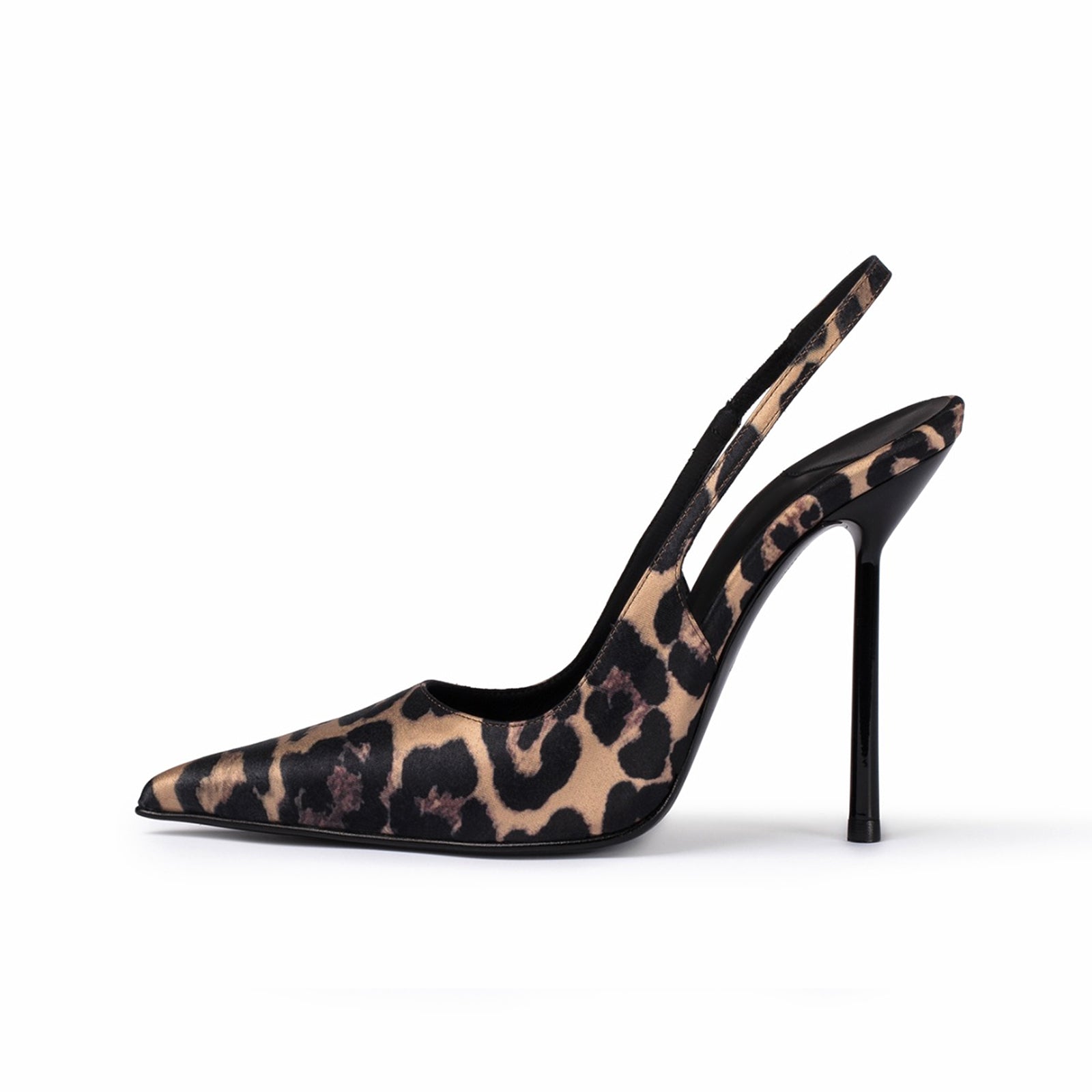 Leopard Satin Pointed-Toe Sleek Slingback High Heels.