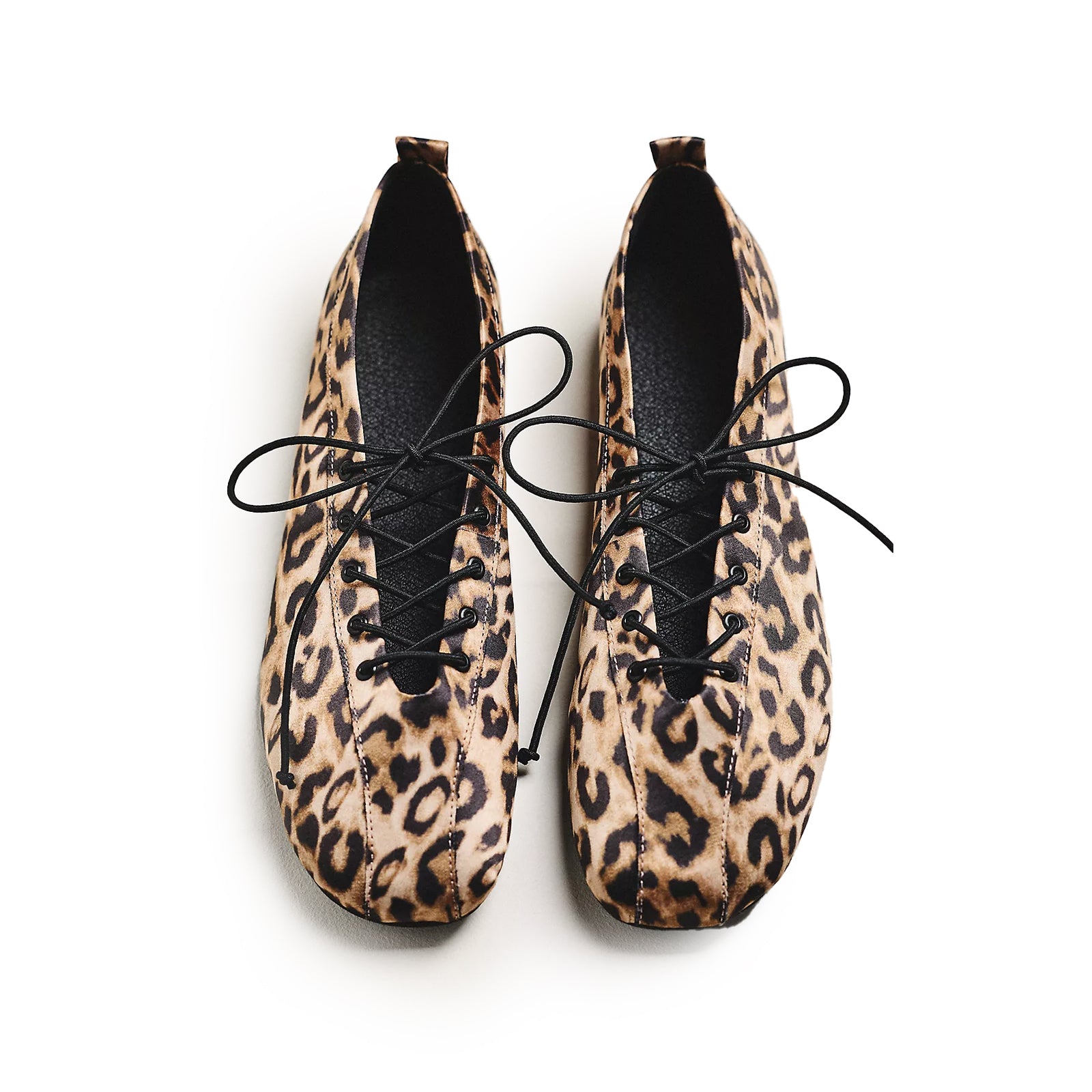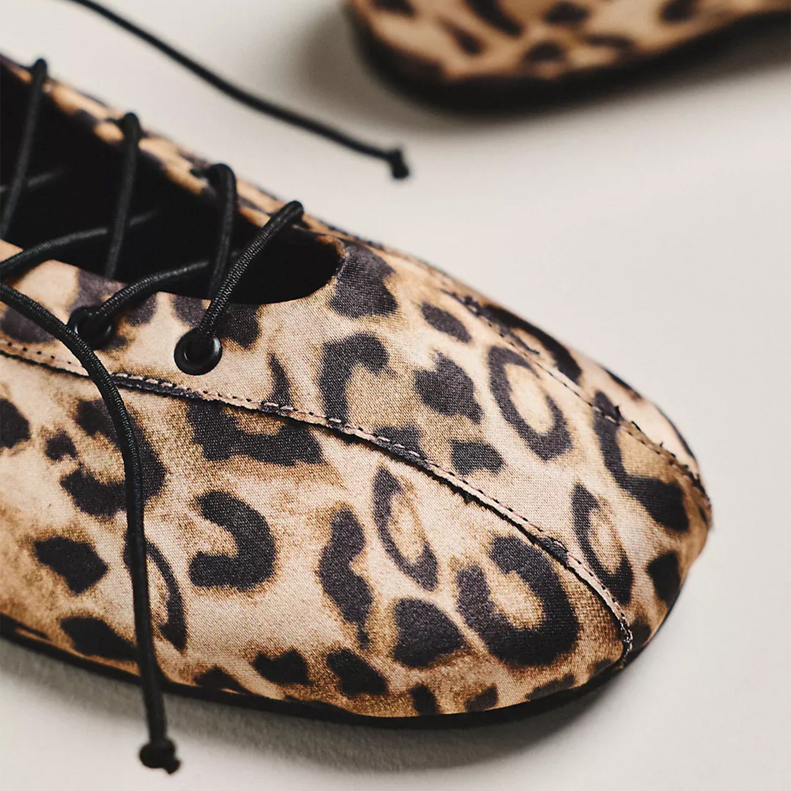 Fierce yet feminine, these ballet flats combine leopard-print satin with elegant lace-up details, adding a touch of wild sophistication to your everyday style.