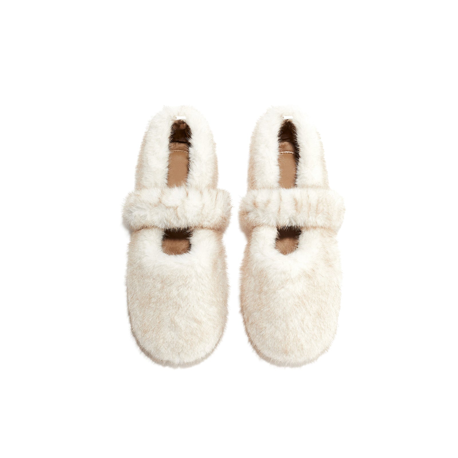 Light Beige Plush Round-Toe Bridge Strap Flats.