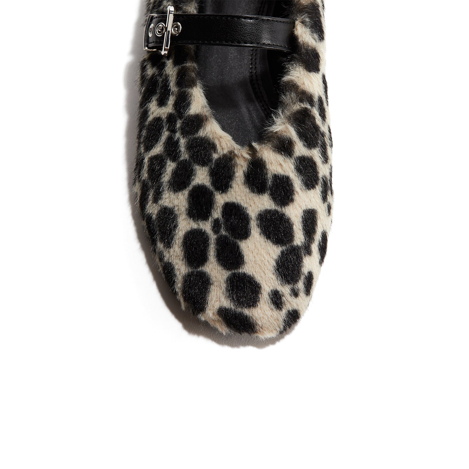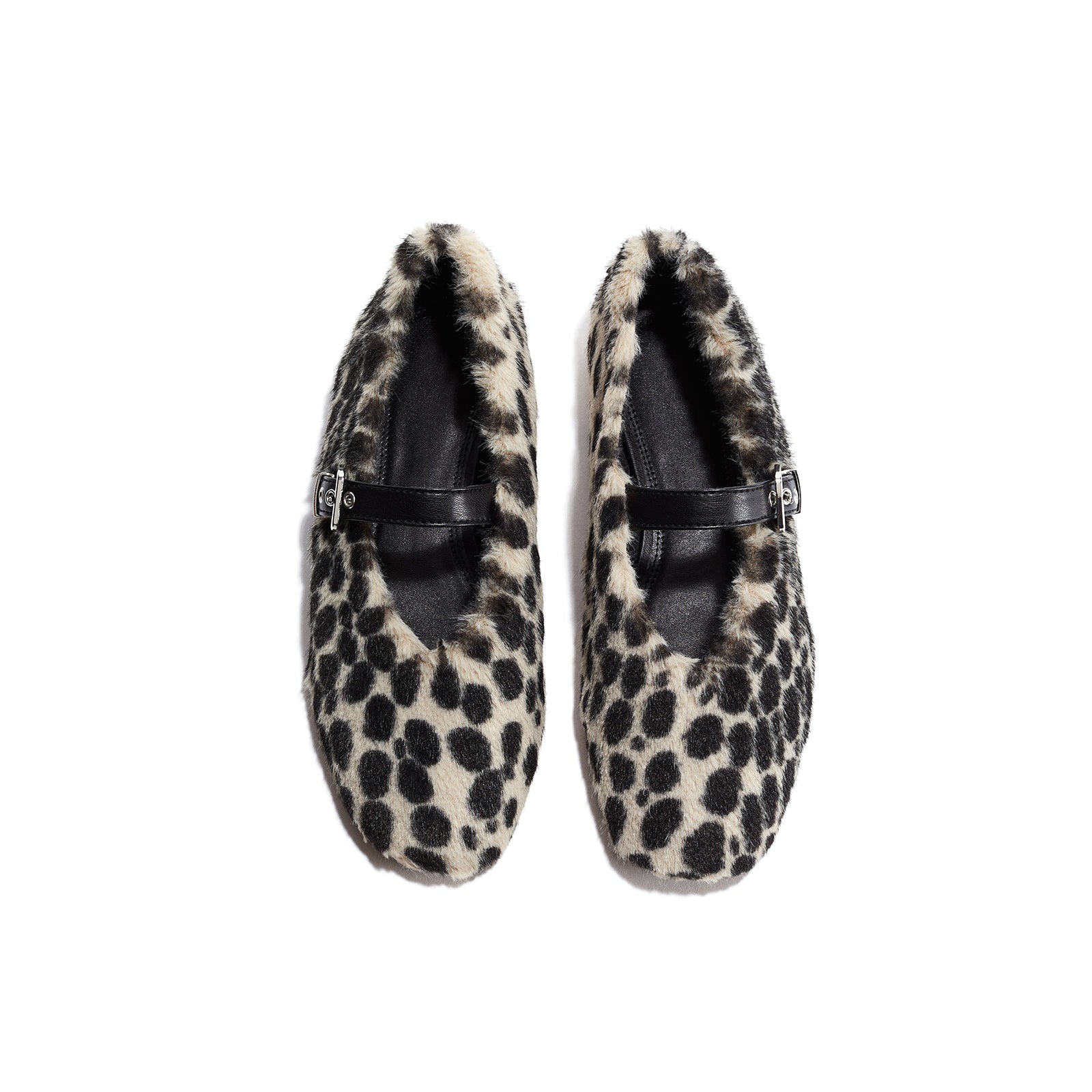 Light Beige Spotted Plush Round-Toe Bridge Strap Flats.