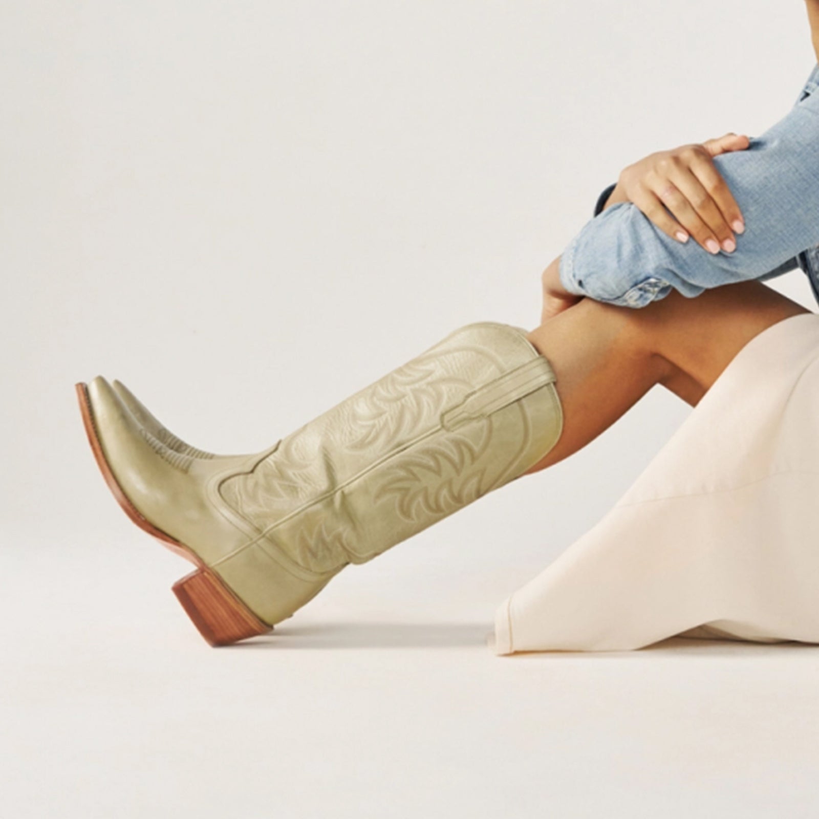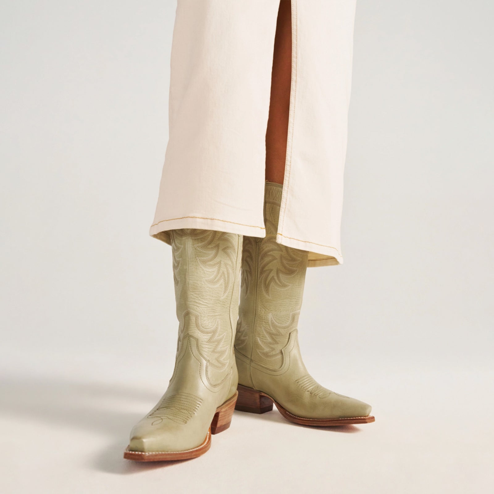 Light Olive Green Snip-Toe Embroidery Mid Calf Cowgirl Boots.