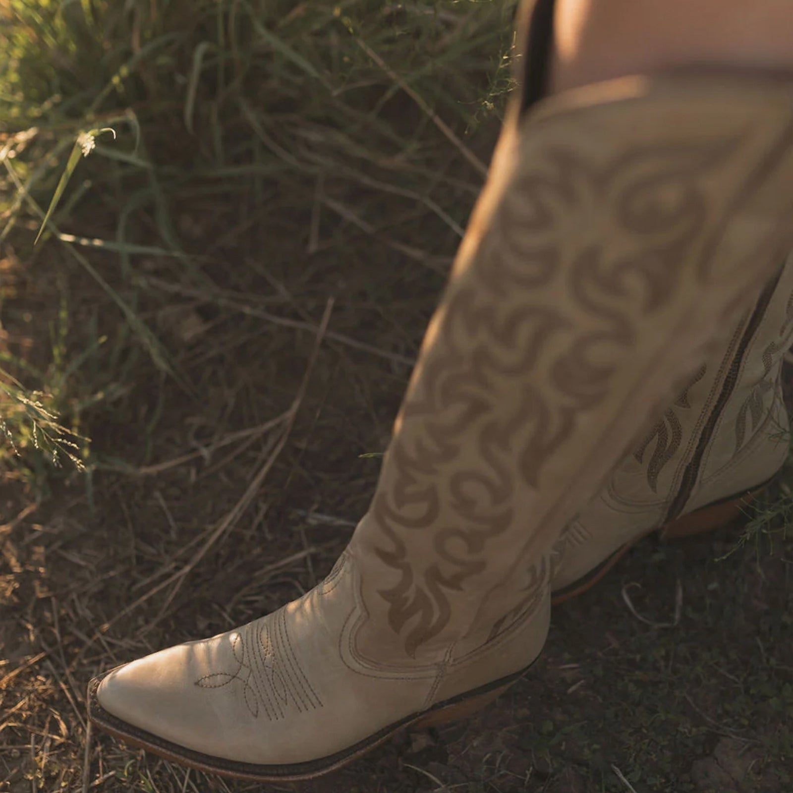 Light Tan Pointed-Toe Embroidery Full-Zip Knee High Cowgirl Boots.