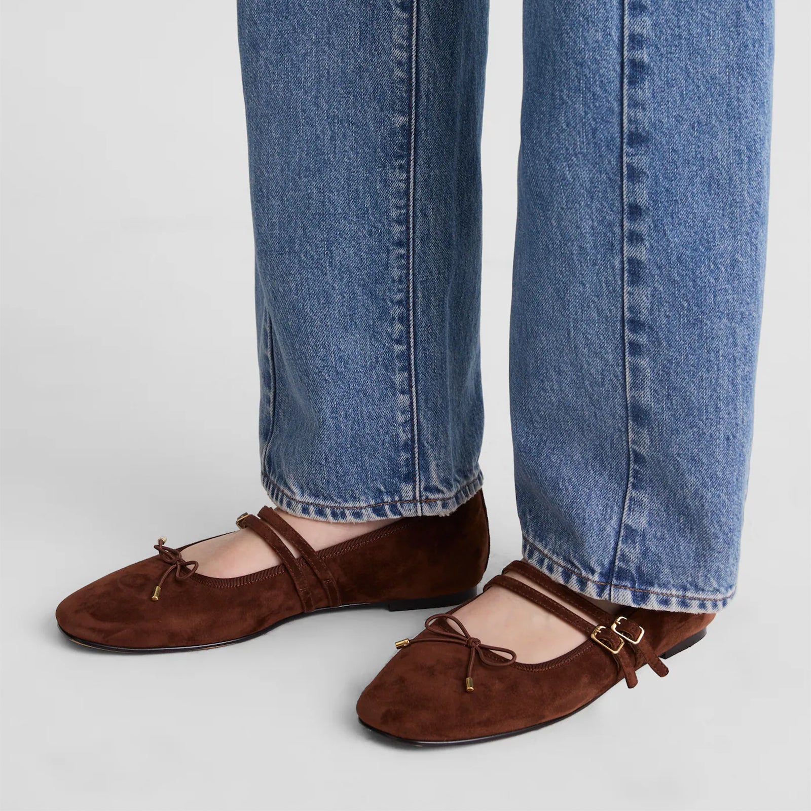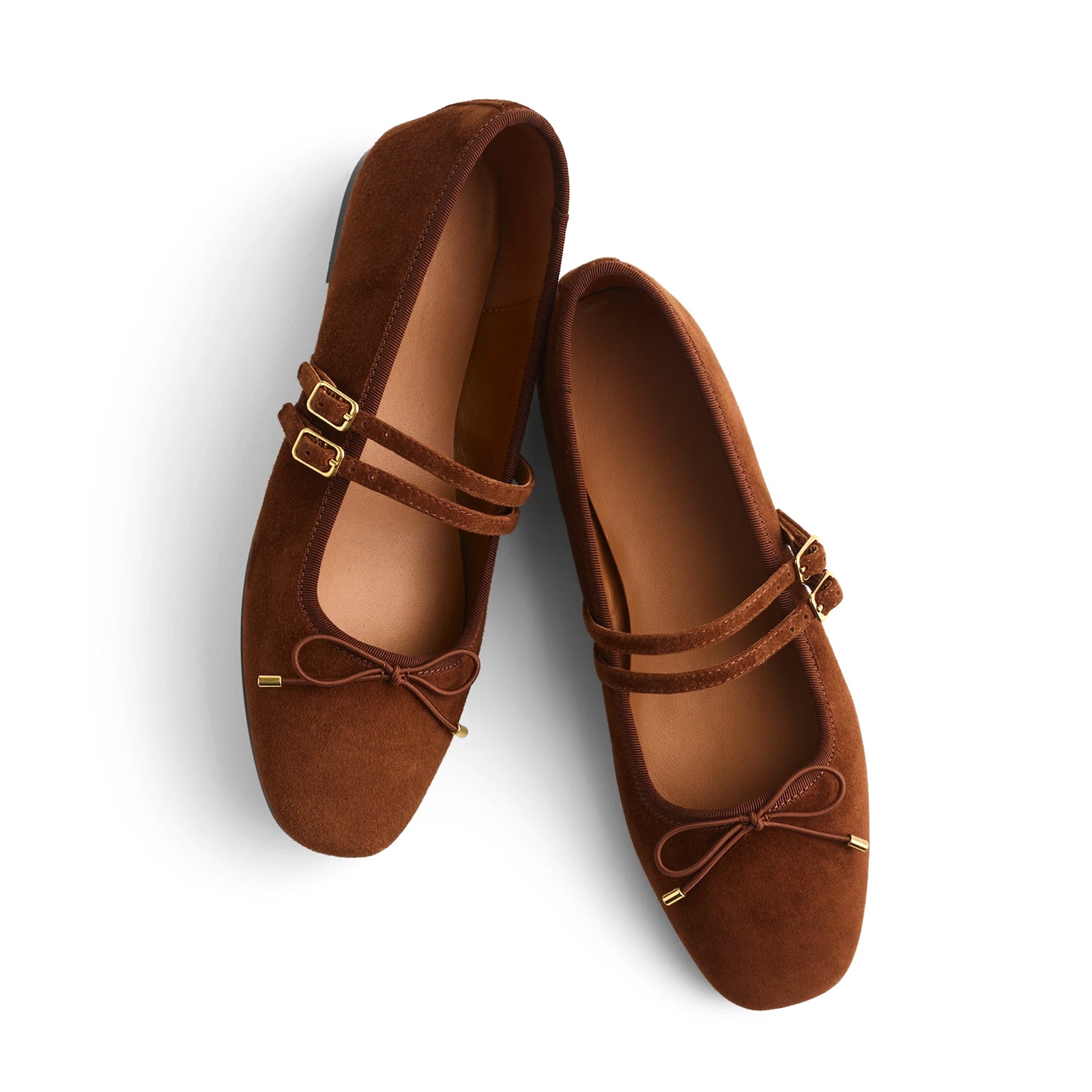 Mahogany Faux Suede Square-Toe Double Bridge Strap Front Bow Ballet Flats.