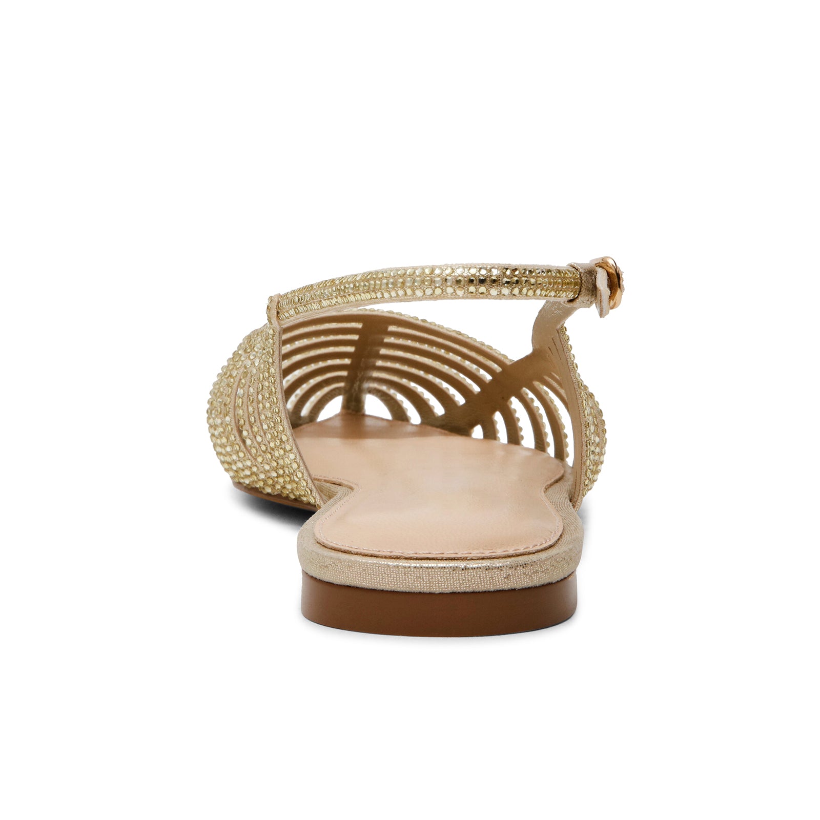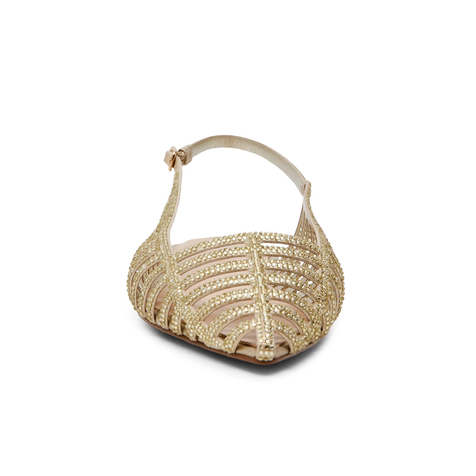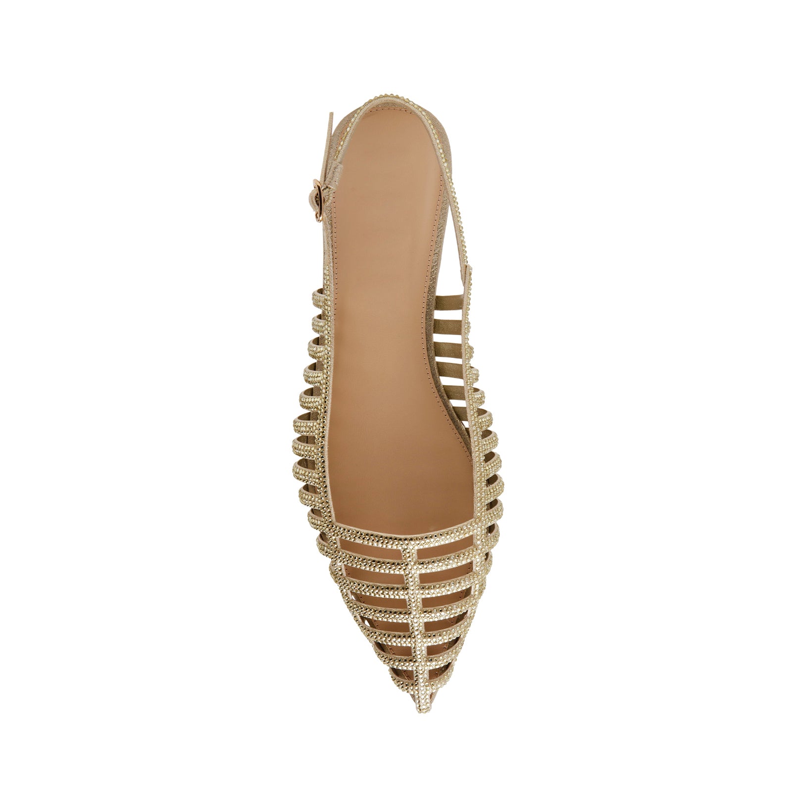 Metallic Gold Pointed-Toe Rhinestone Strappy Slingback Flats.