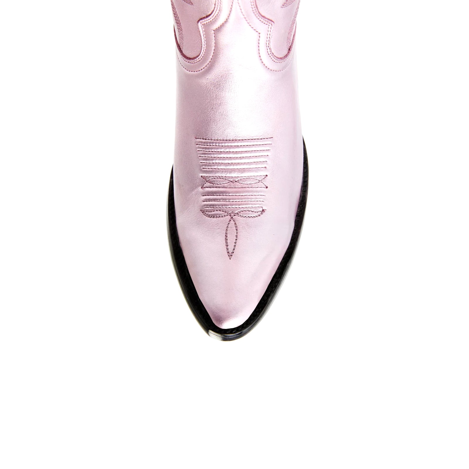 Metallic Pink Almond-Toe Embroidery Ankle Cowgirl Boots.
