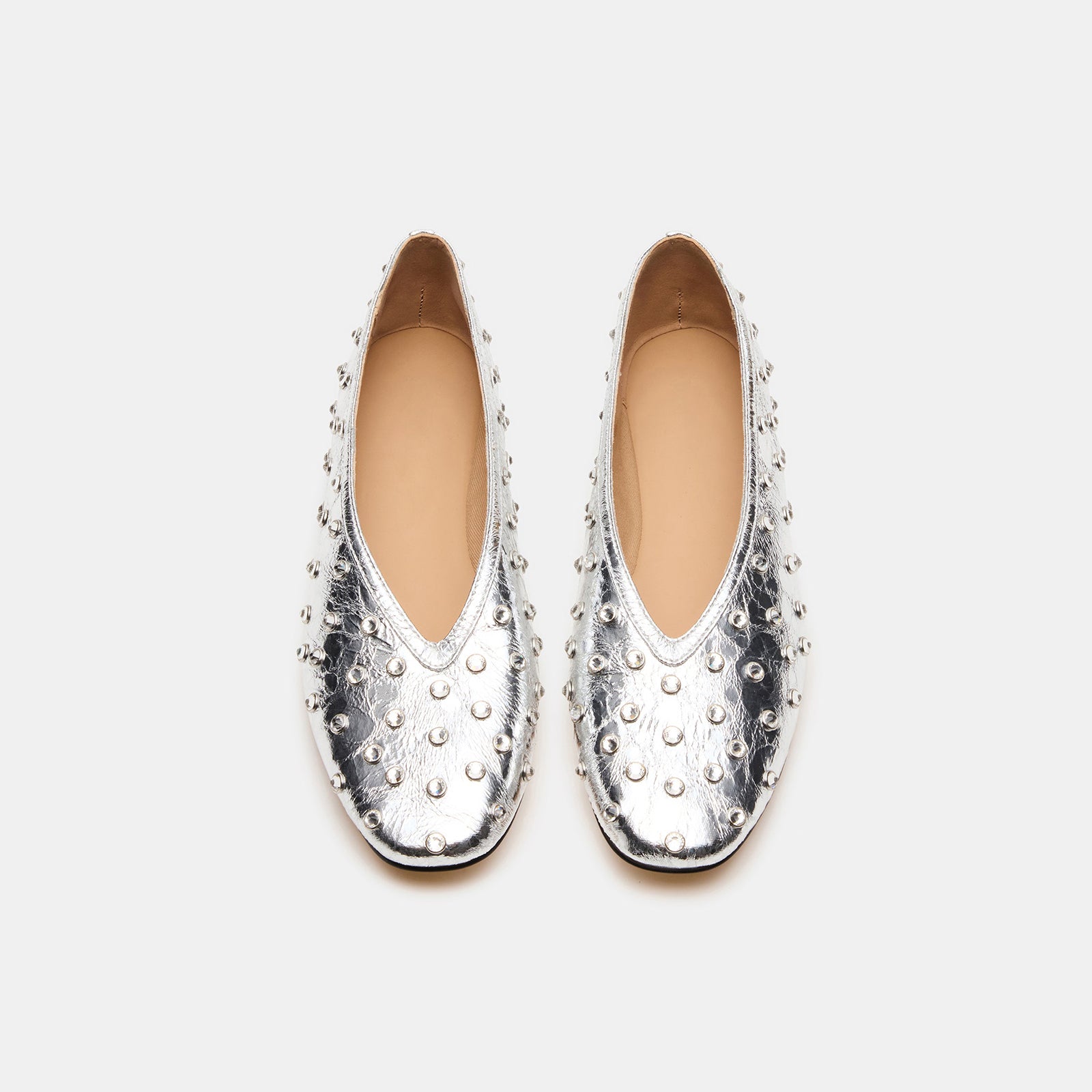 Metallic Silver Elegant Square-Toe Rhinestone Slip-On Flats.