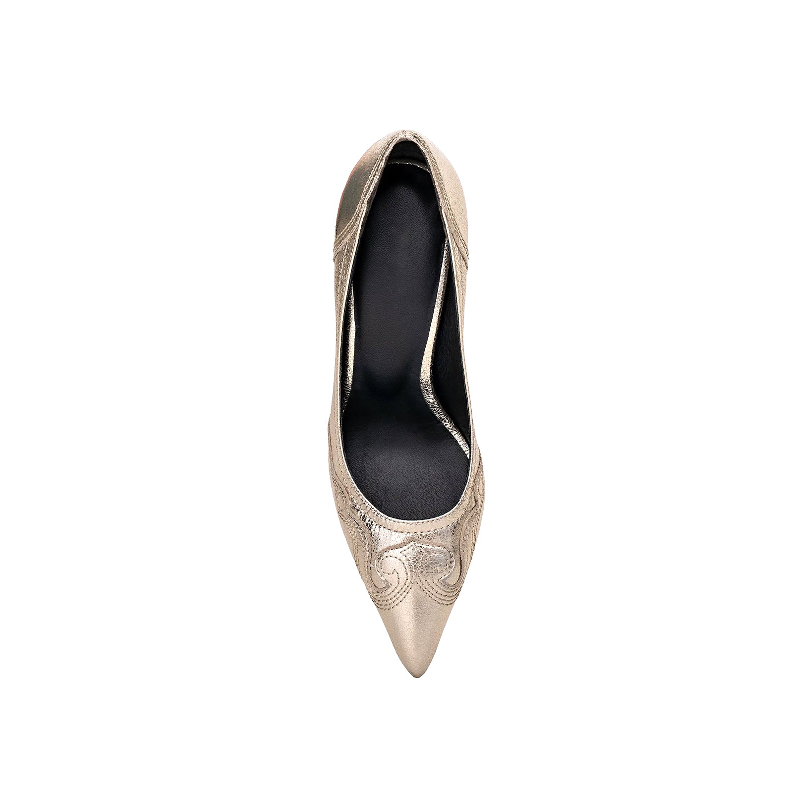 - Metallic vegan leather with delicate embroidery for a refined, Western-inspired touch.