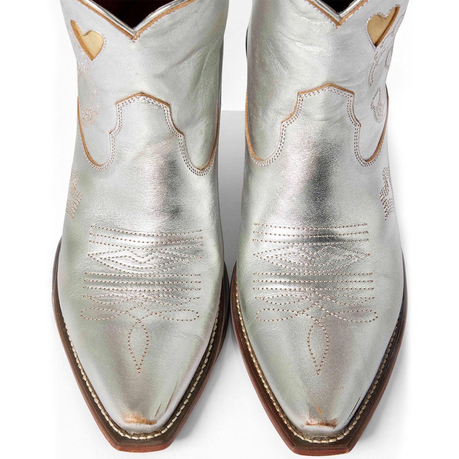 Metallic Silver Snip-Toe Embroidery Metallic Gold Heart Inlay Ankle Cowgirl Boots.
