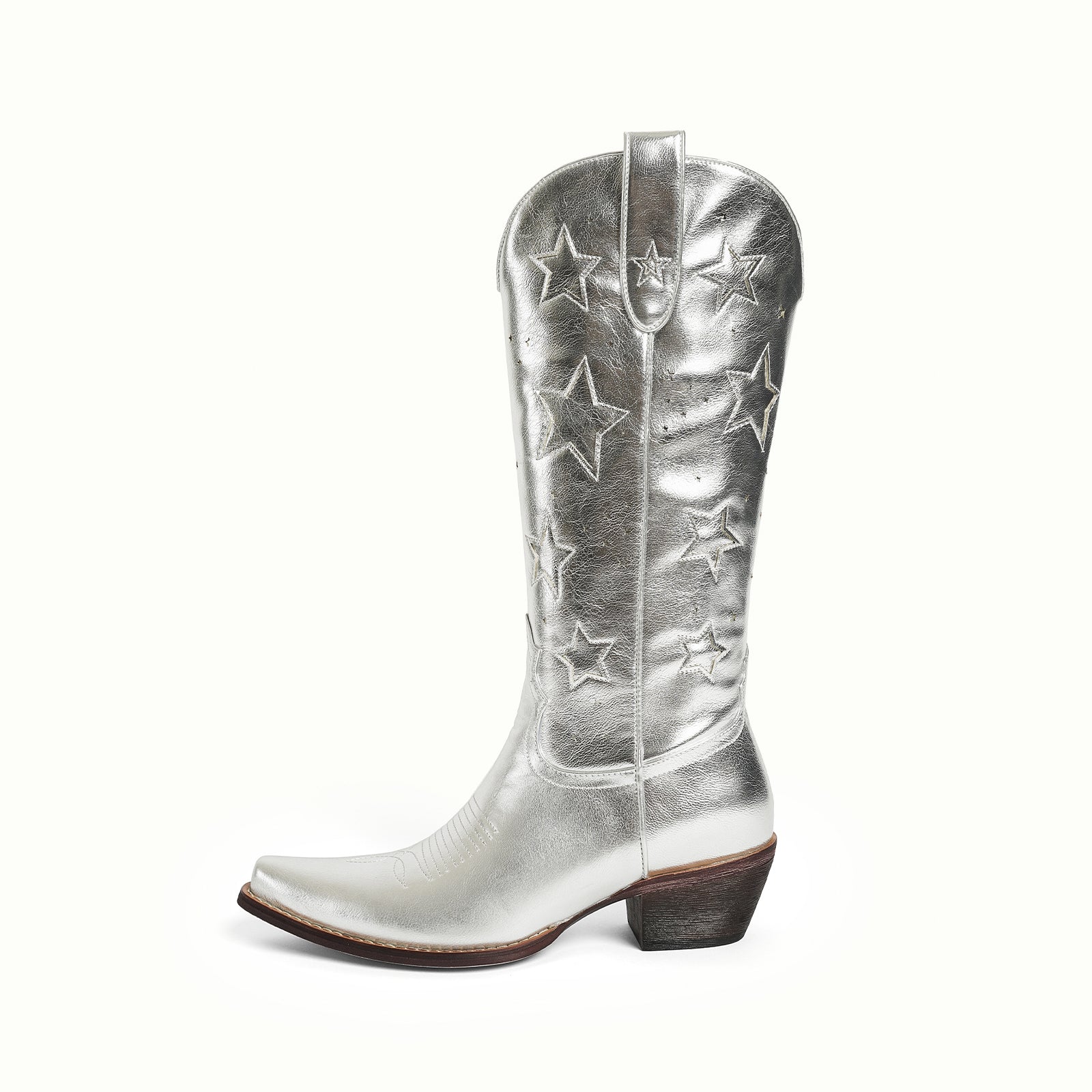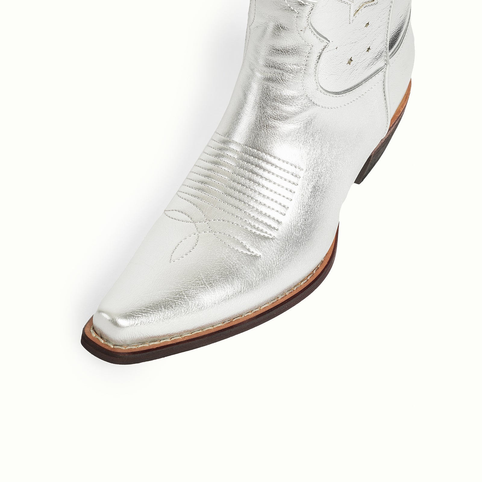 Western-inspired mid-calf star detail metallic vegan leather boots in silver.