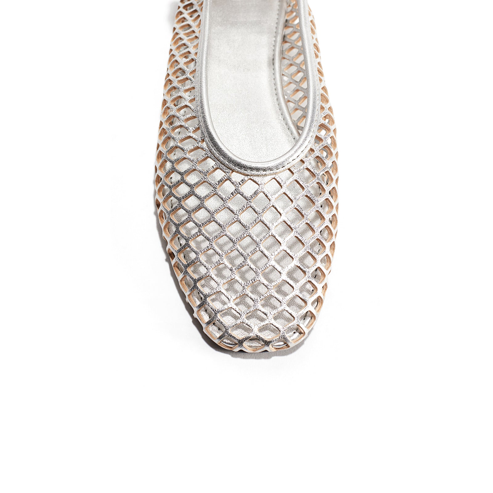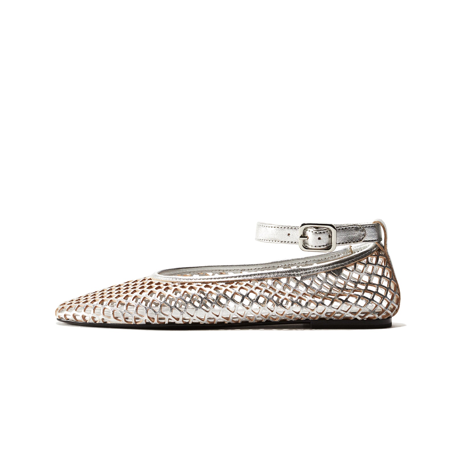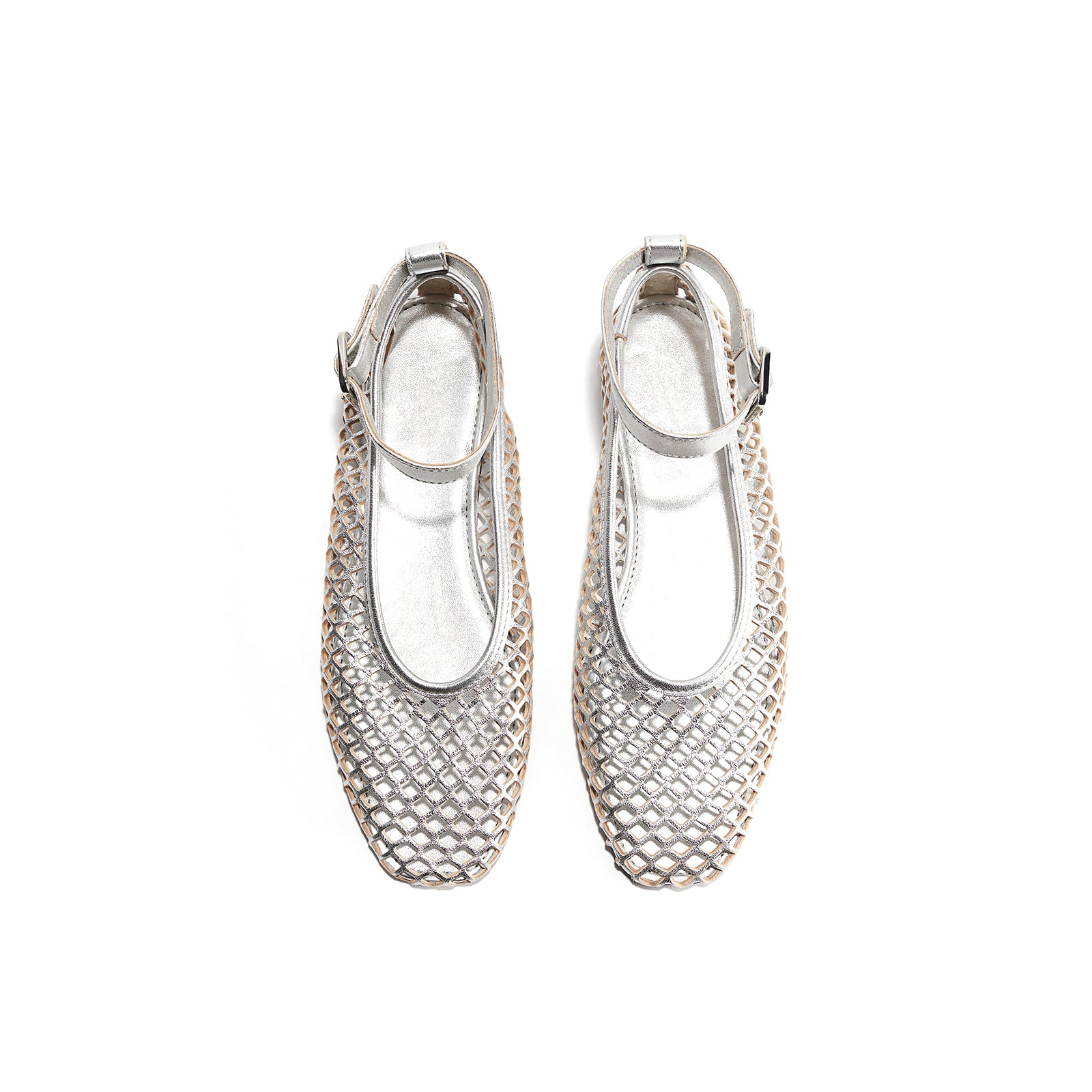 Metallic Silver Square-Toe Perforated Ballet Flats With Ankle Strap.