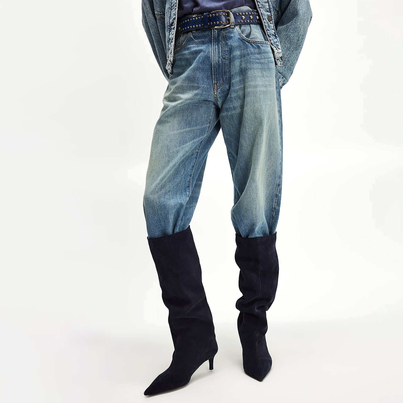 Navy Blue Faux Suede Pointed-Toe Wide Calf Knee High Stiletto Boots.