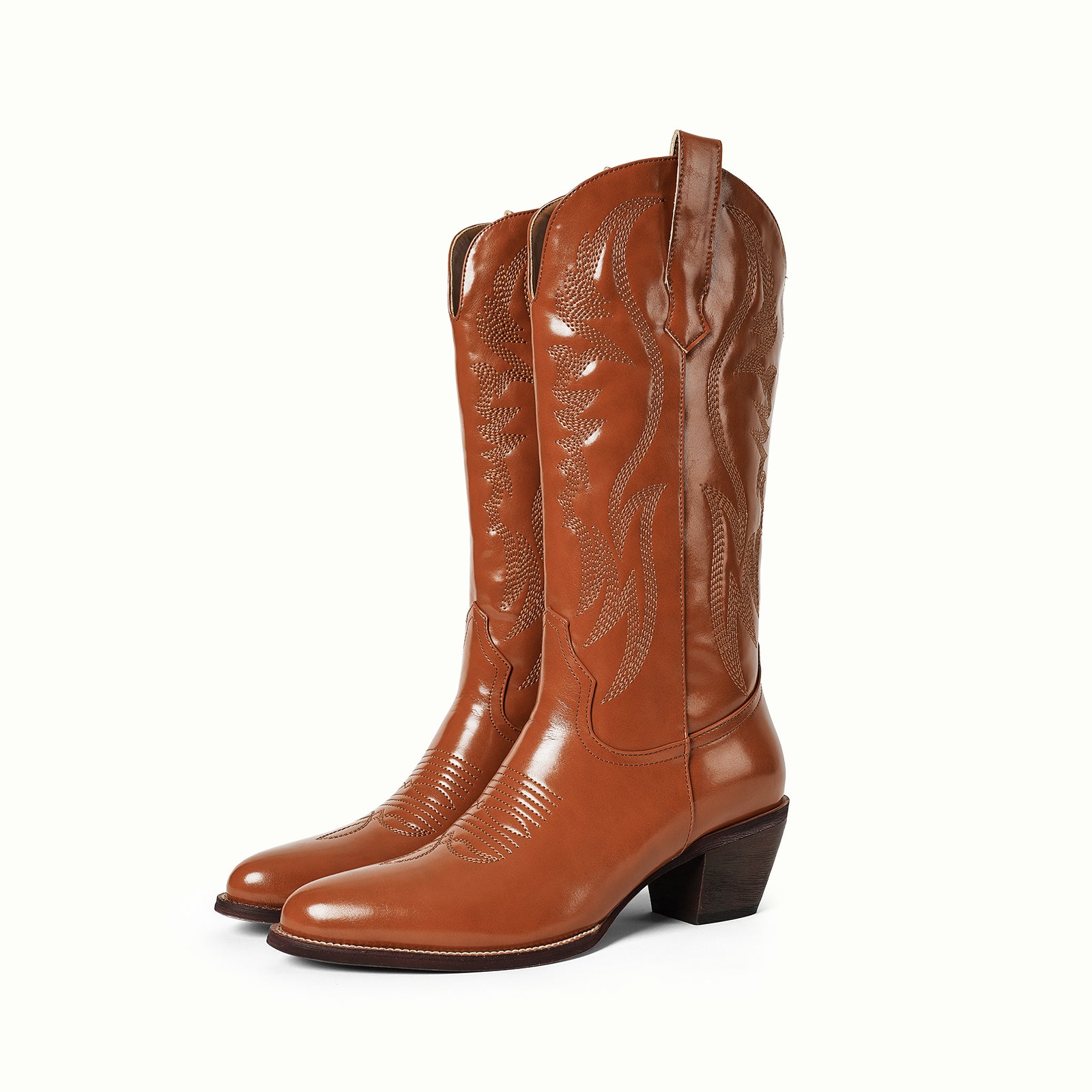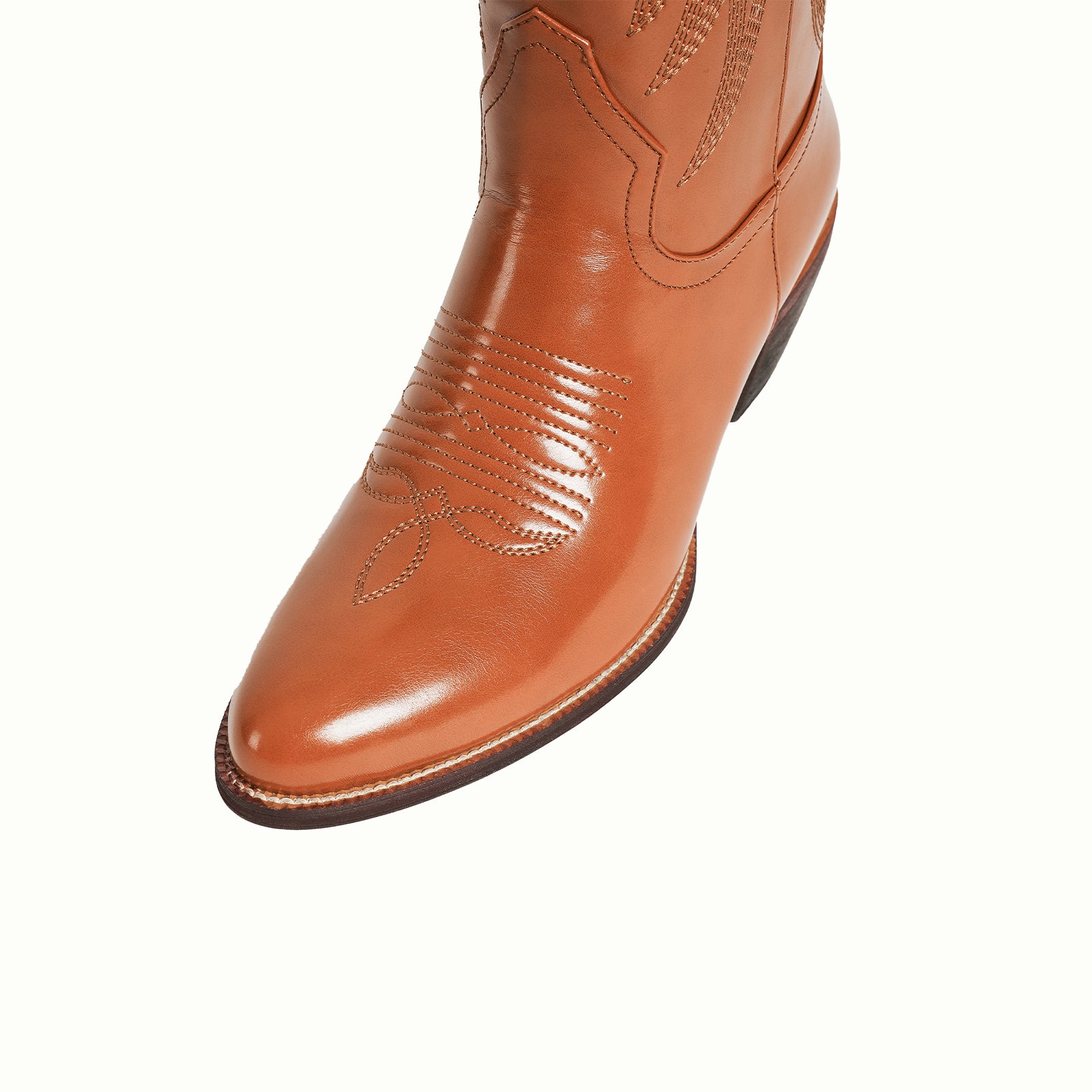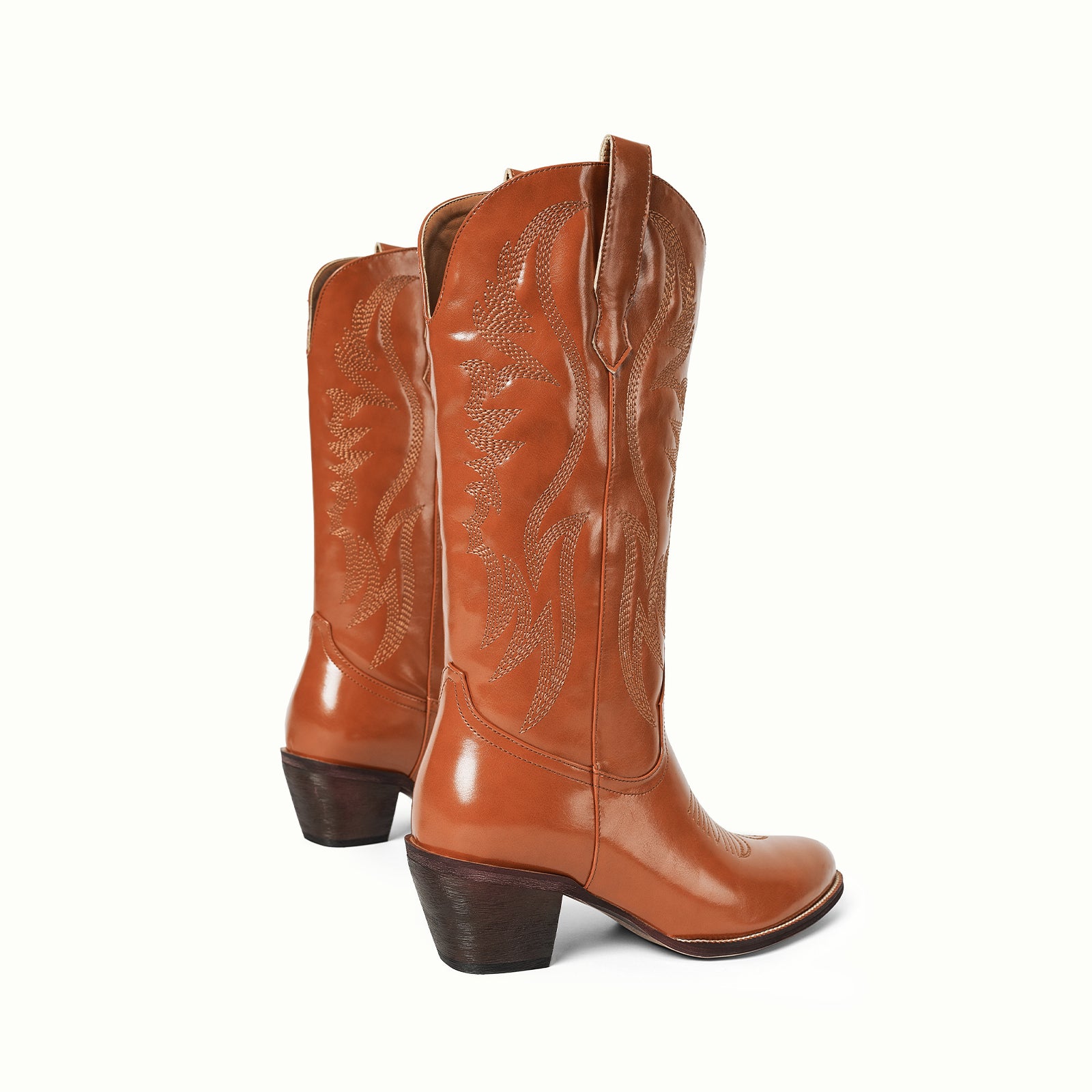 Mid-calf classic embroidery vegan leather Western boots in orange.