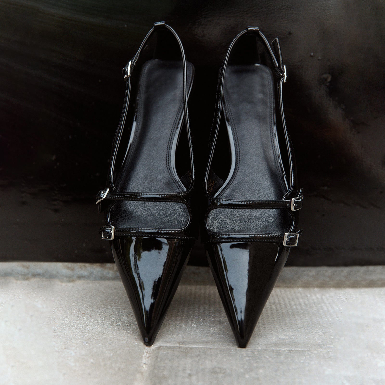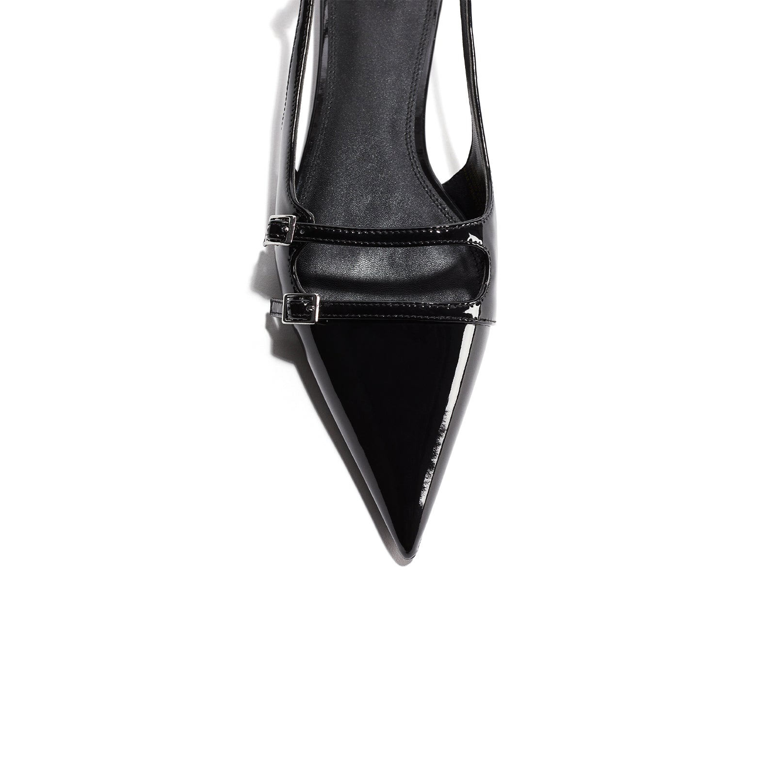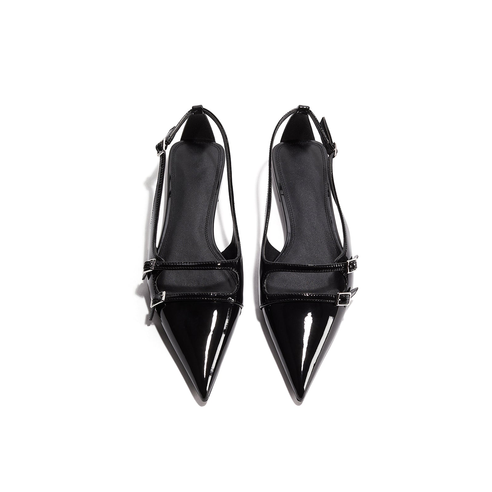 Patent Black Pointed-Toe Front Double Straps Slingback Flats.