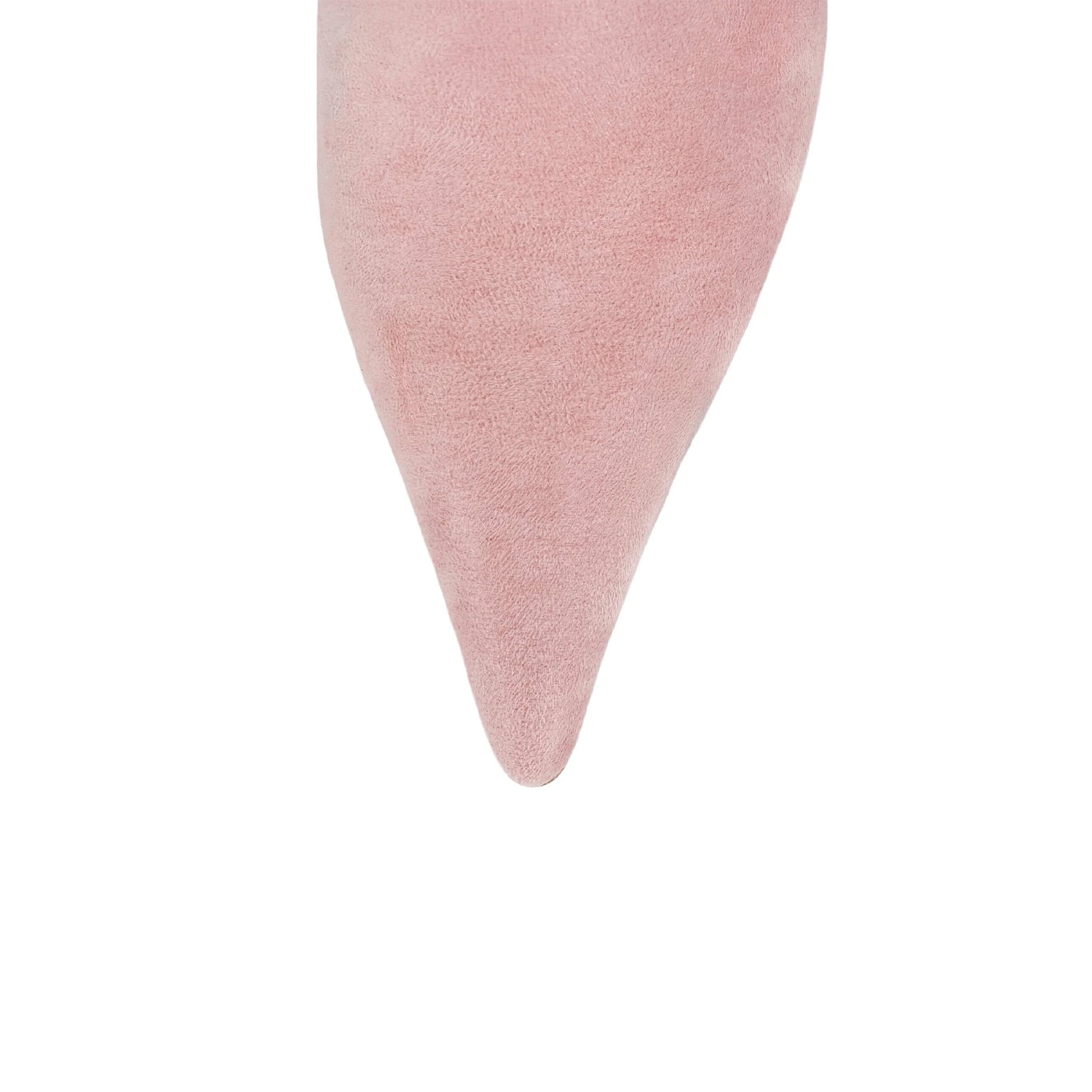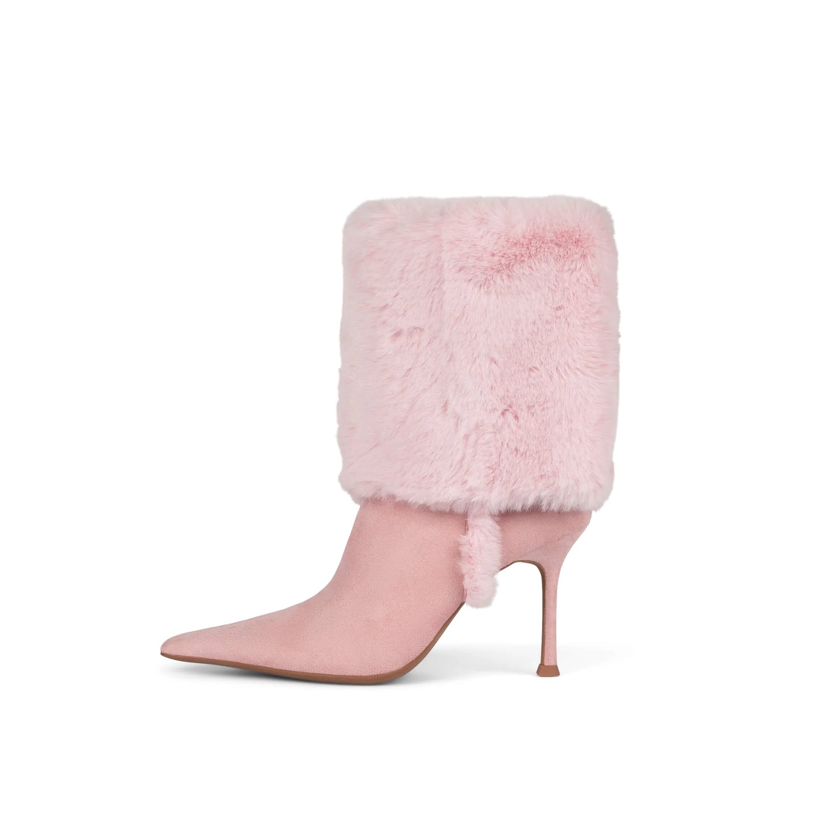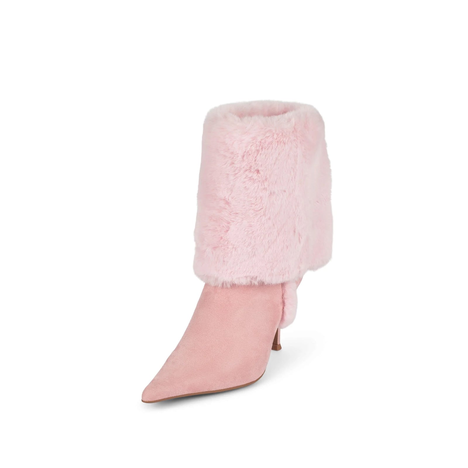 Pink Faux Suede Pointed-Toe Plush Fold-Over Knee High Stiletto Boots.