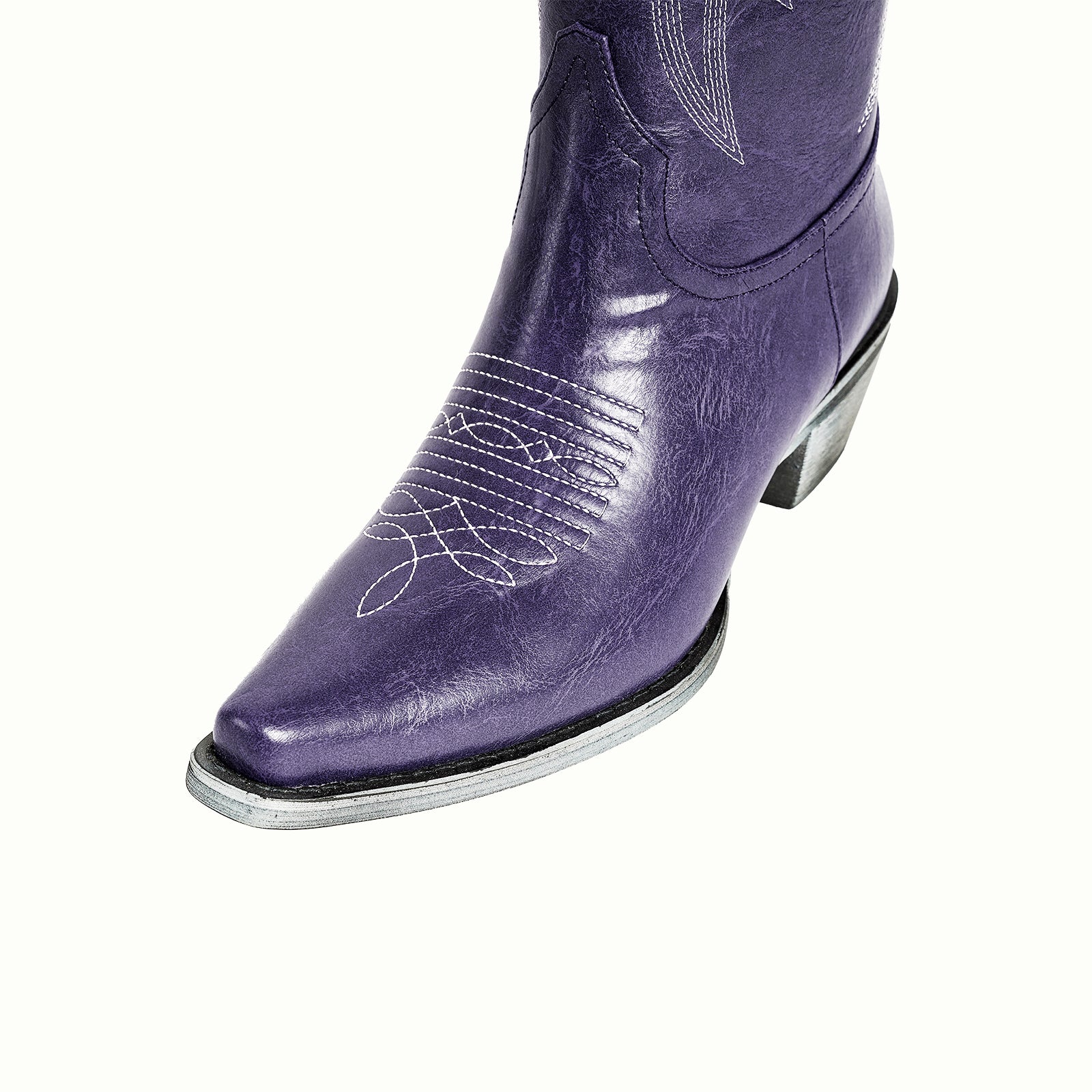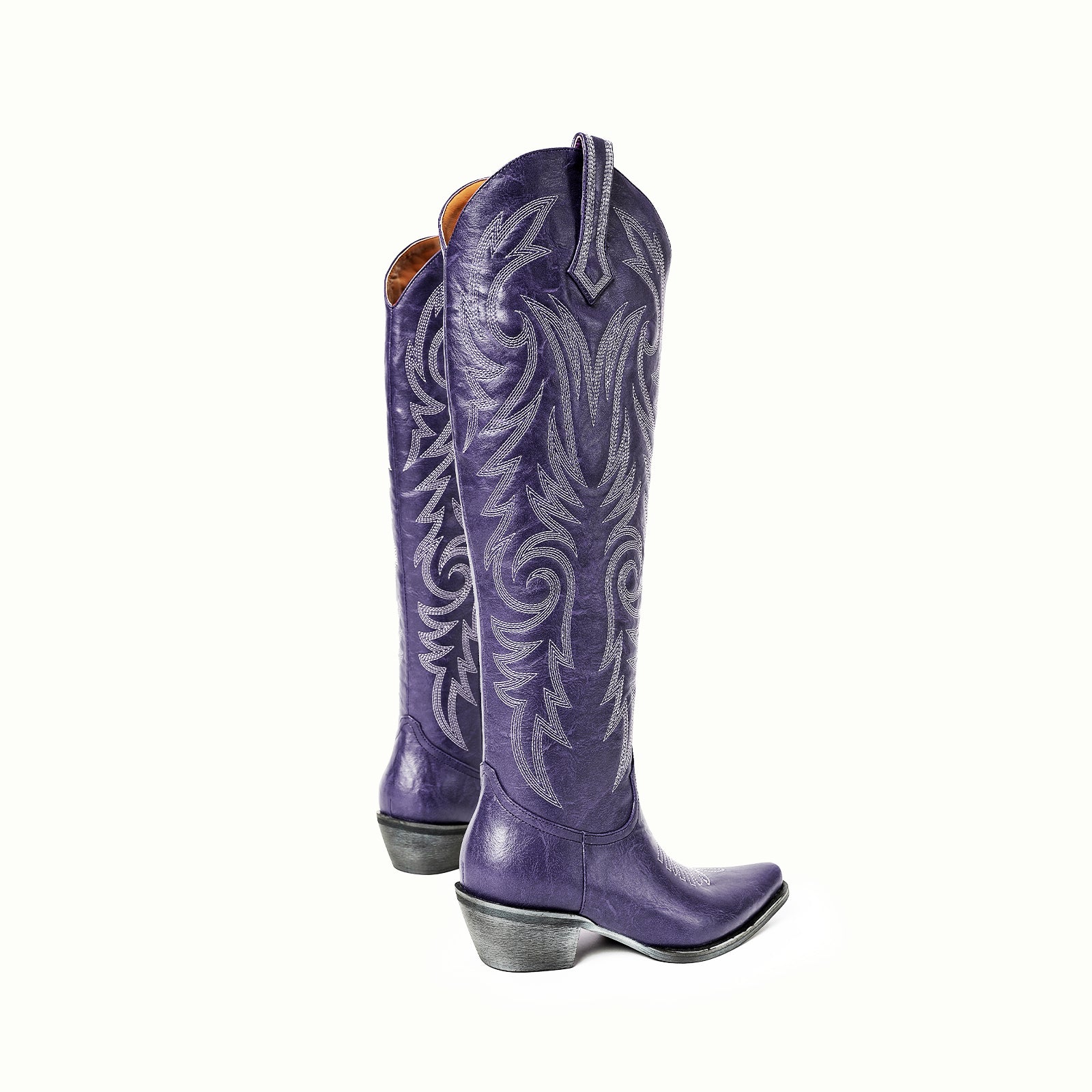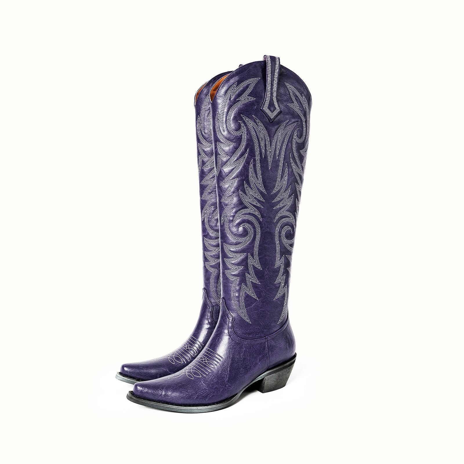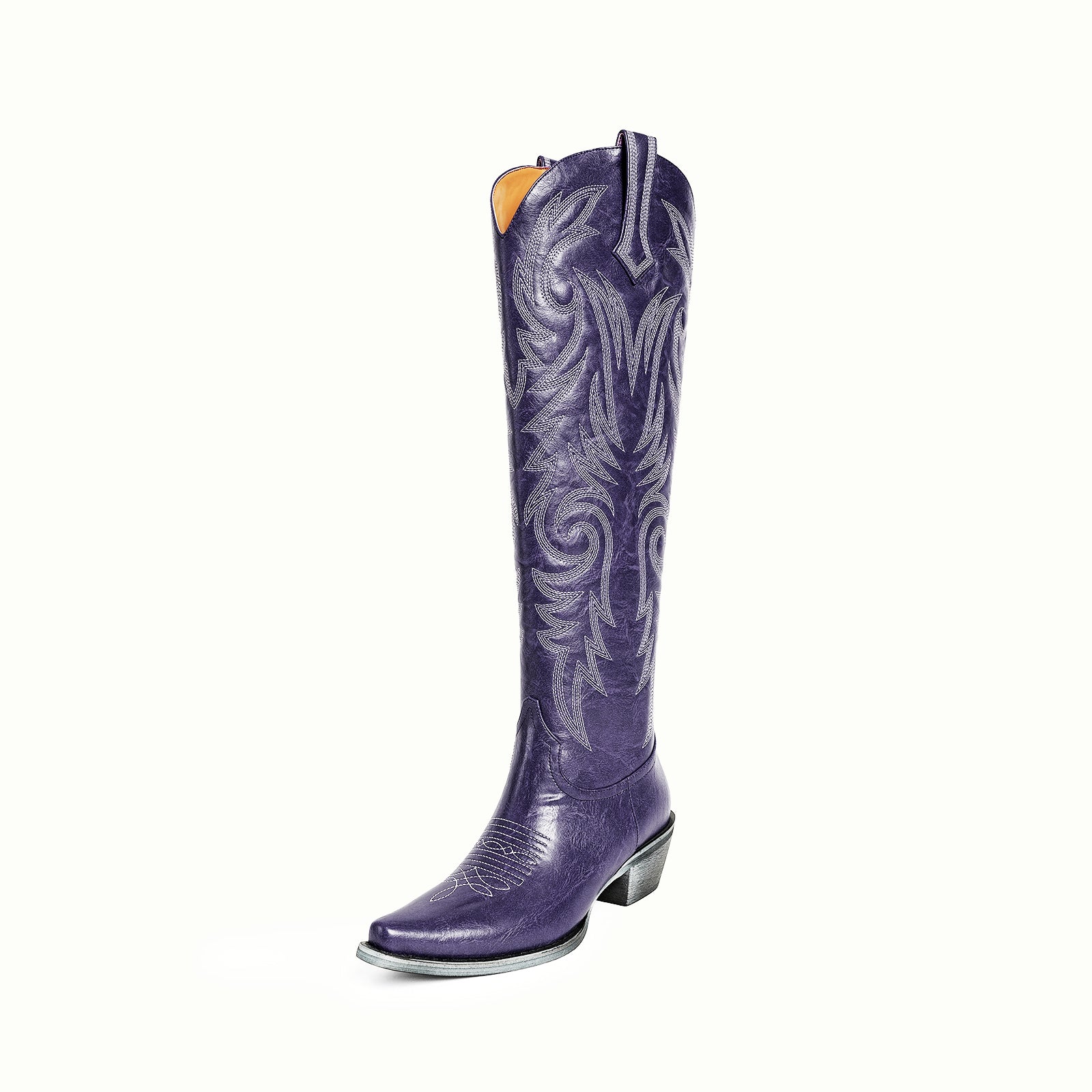 Knee high classic embroidery metallic vegan leather half-zip Western tall boots in purple.