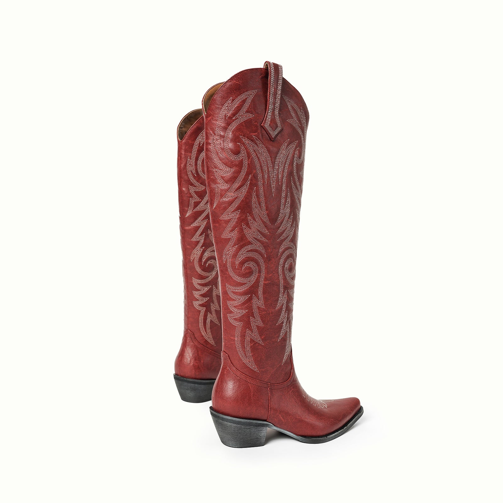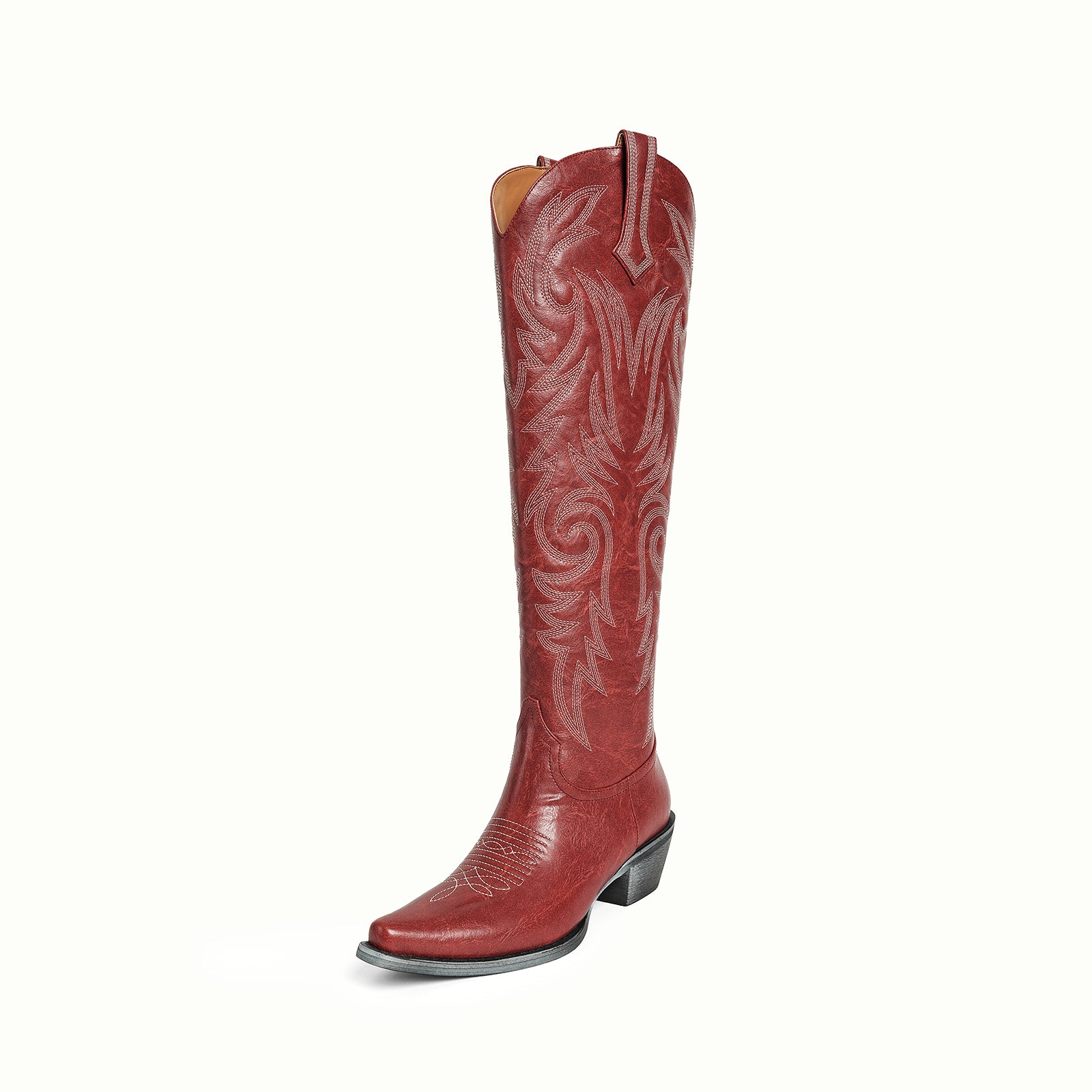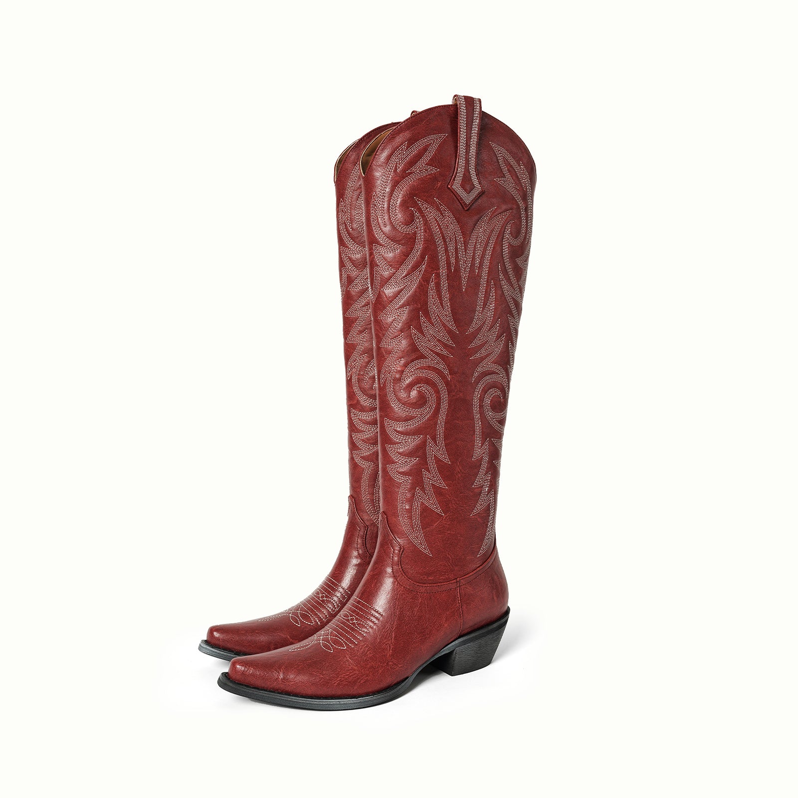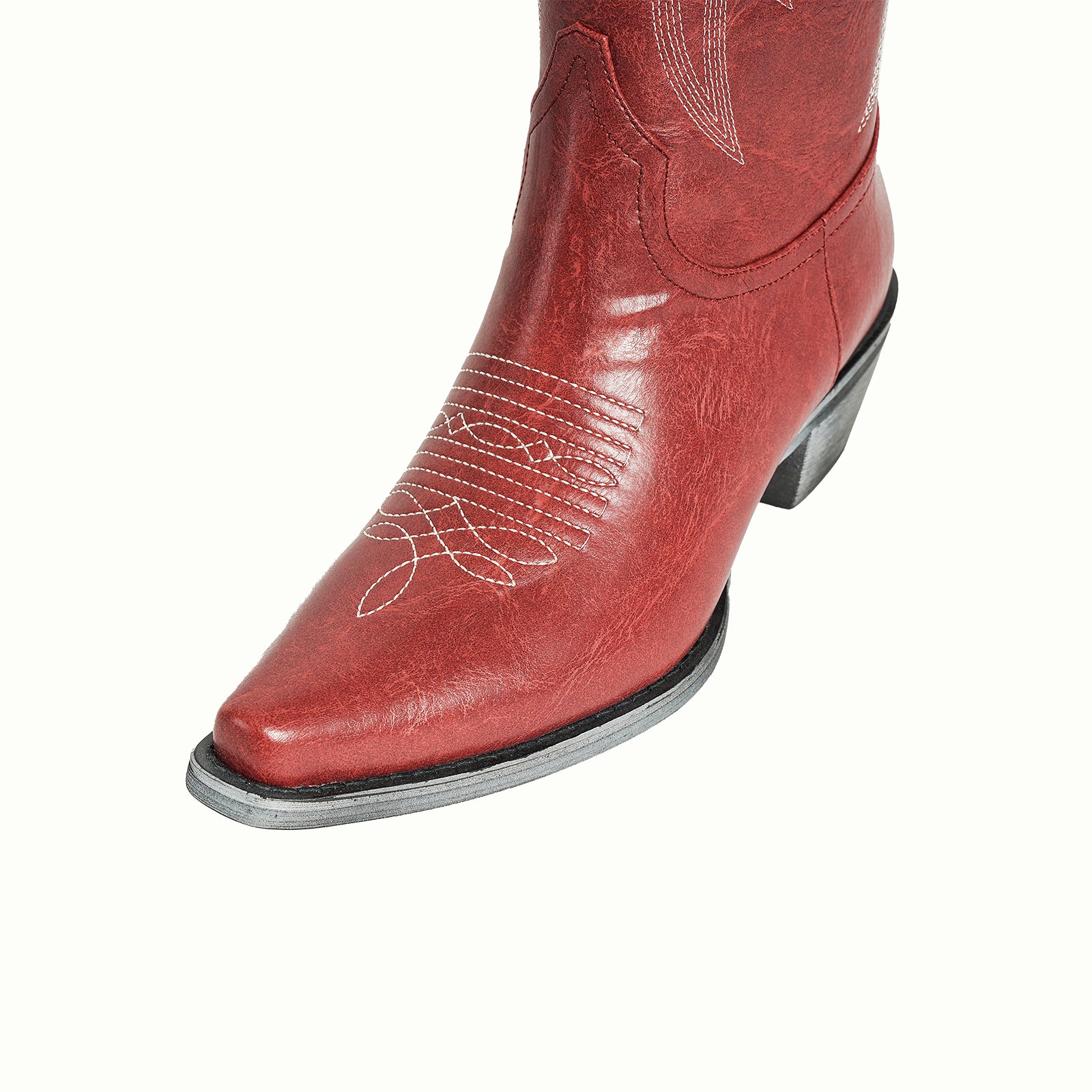 Knee high classic embroidery vegan leather half-zip Western tall boots in red.