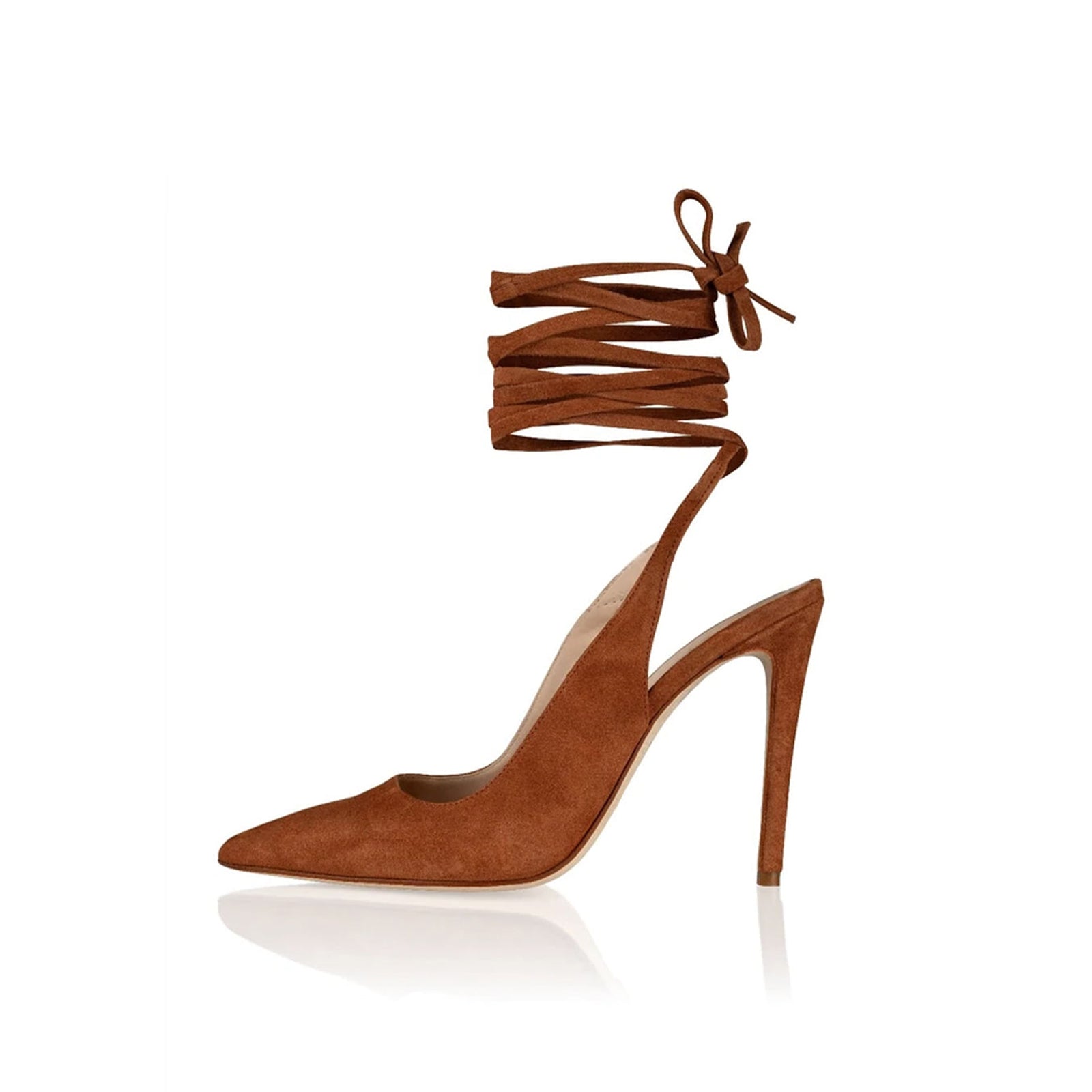 Red Faux Suede Pointed-Toe Slingback Ankle Laces High Heels.