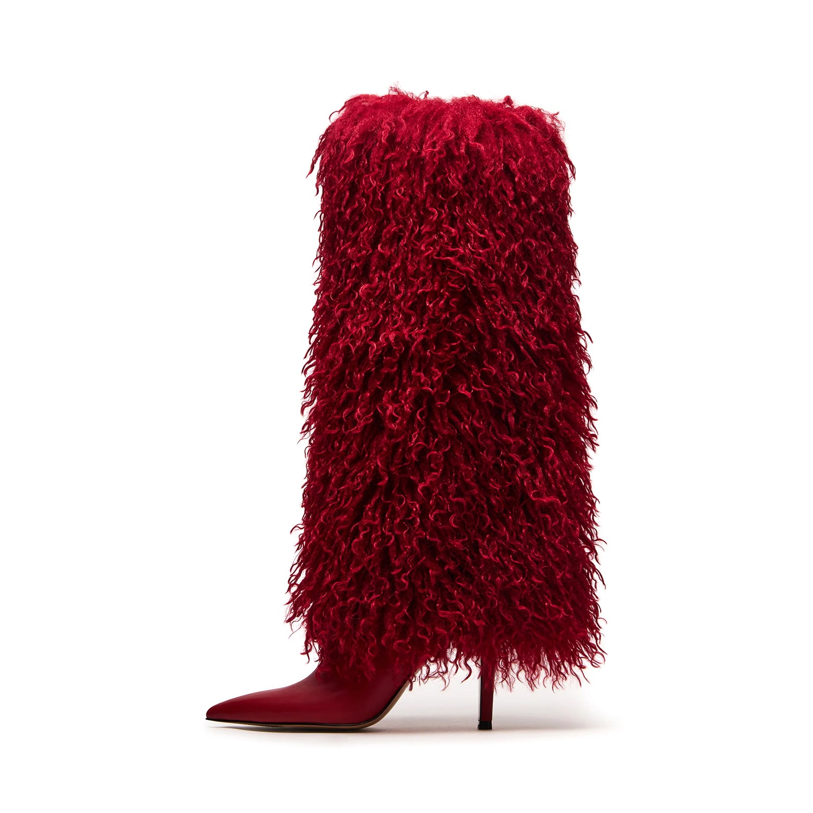 Red Pointed-Toe Full Plush Wide Calf Knee High Stiletto Boots.