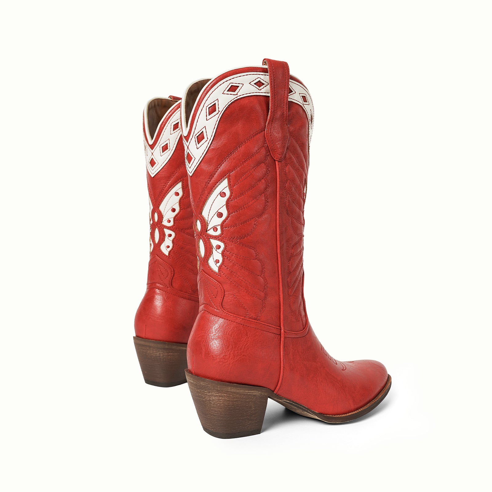 Mid-calf butterfly inlay embroidery vegan leather Western boots in red.