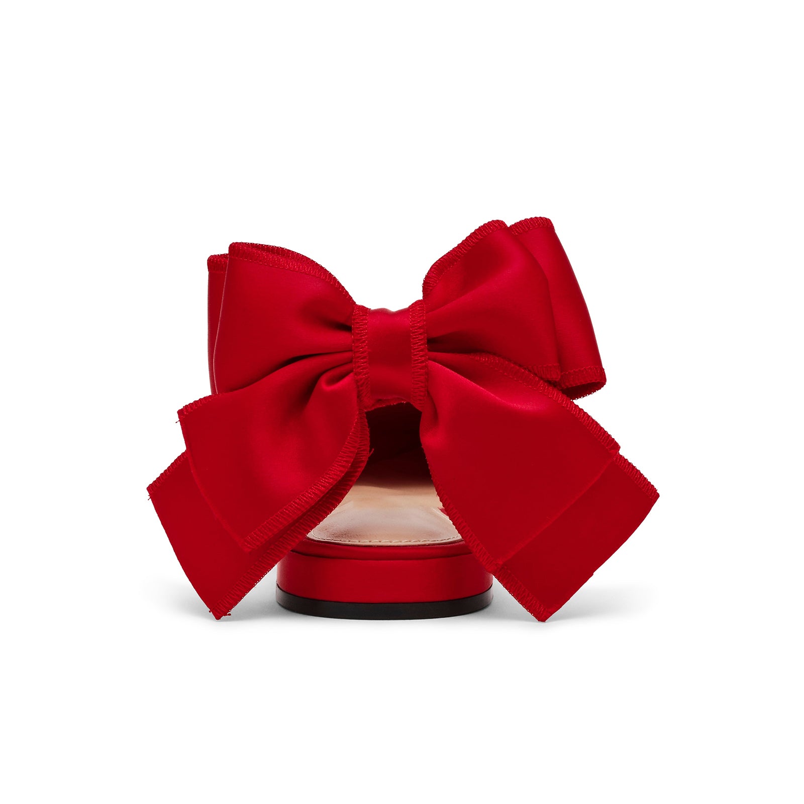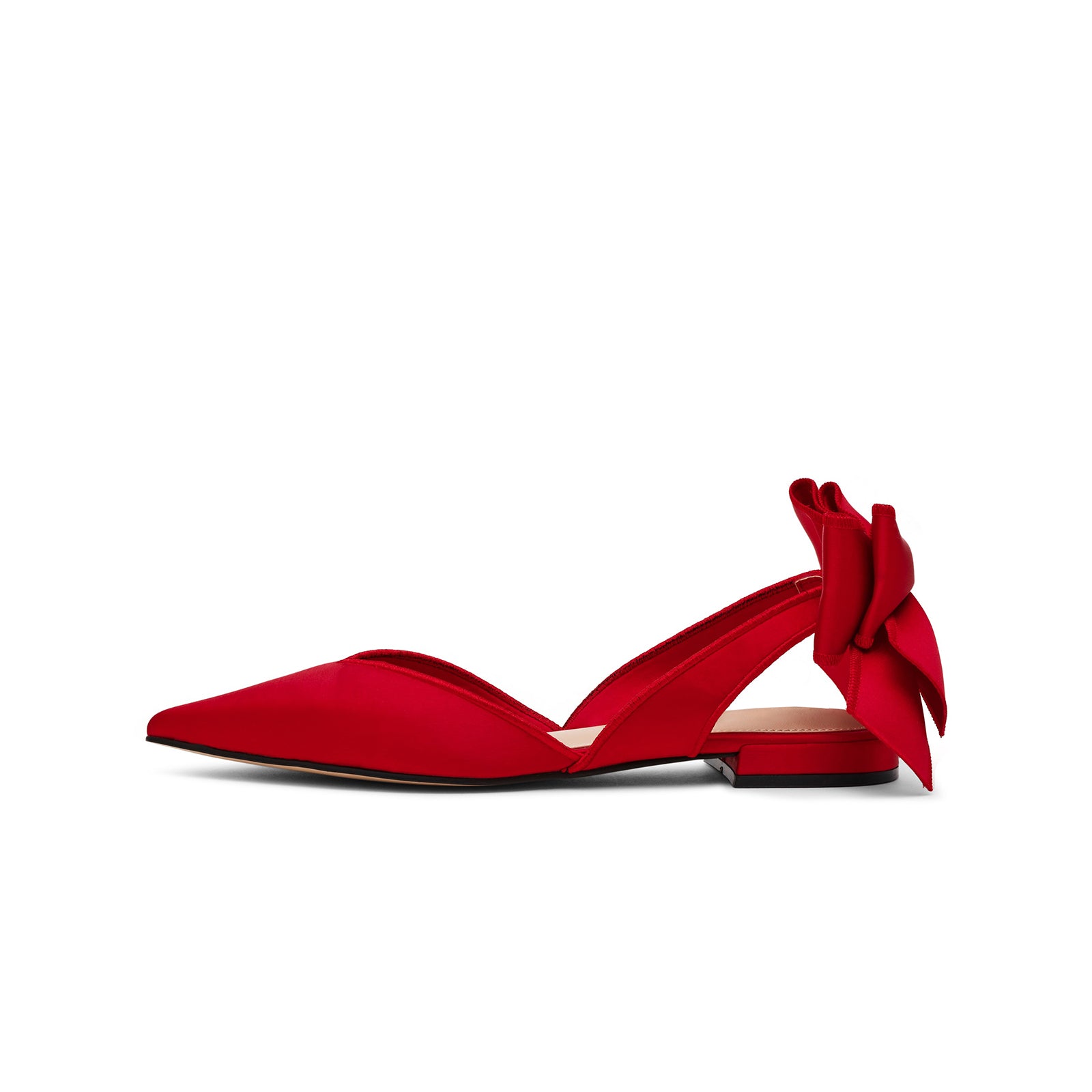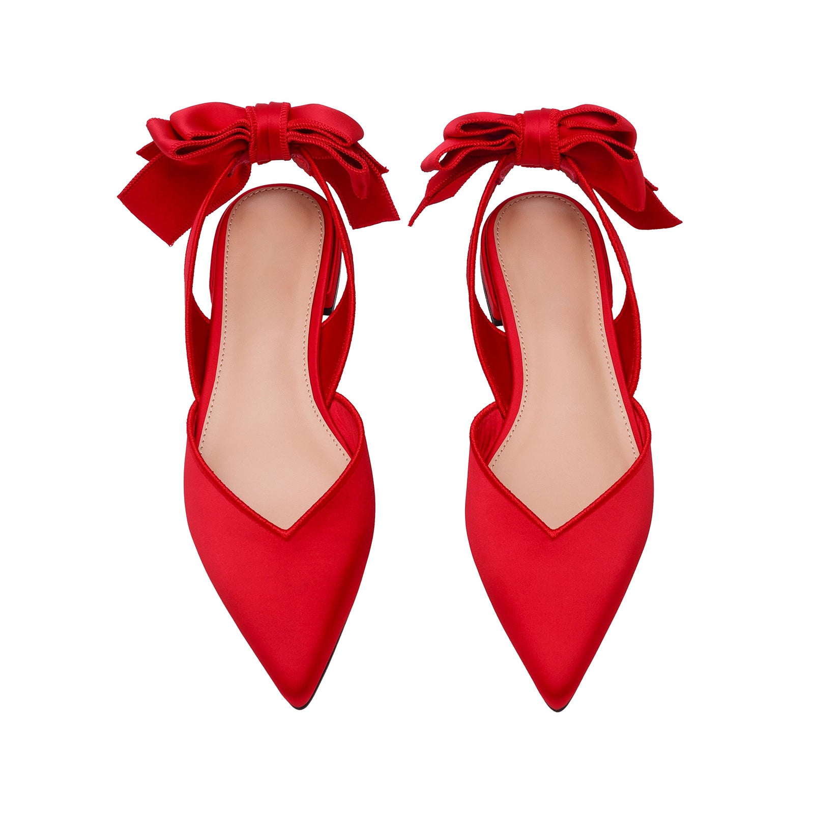 Red Satin Pointed-Toe Slingback Back Bow Flats.