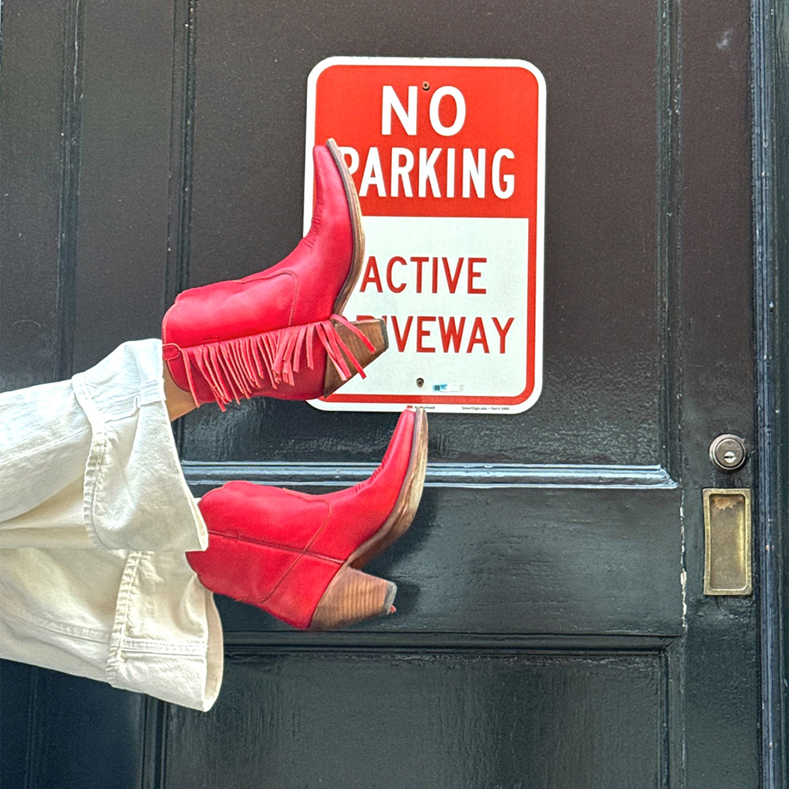 Red Snip-Toe Side Fringe Ankle Cowgirl Boots.