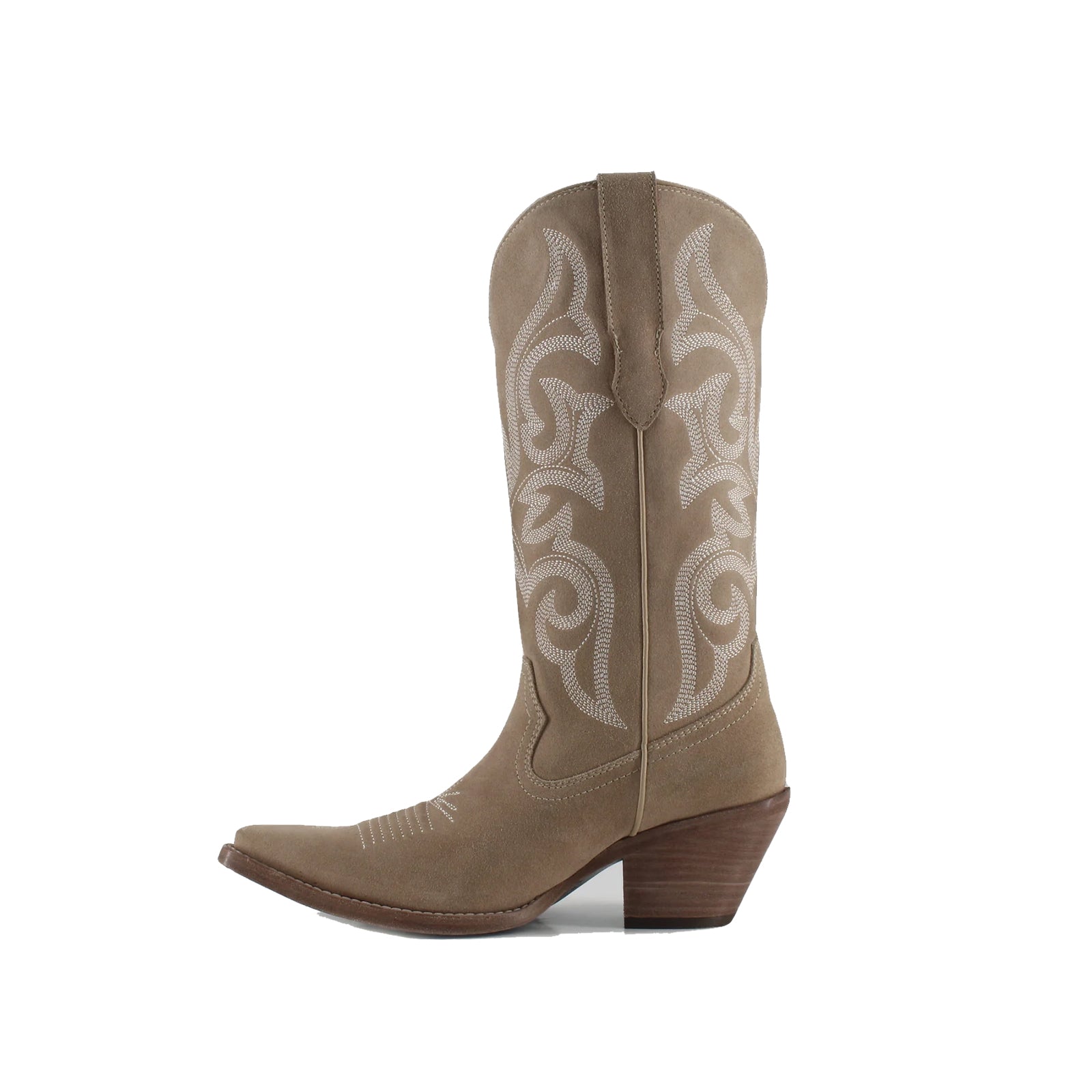Sand Faux Suede Snip-Toe Mid Calf Embroidery Cowgirl Boots.