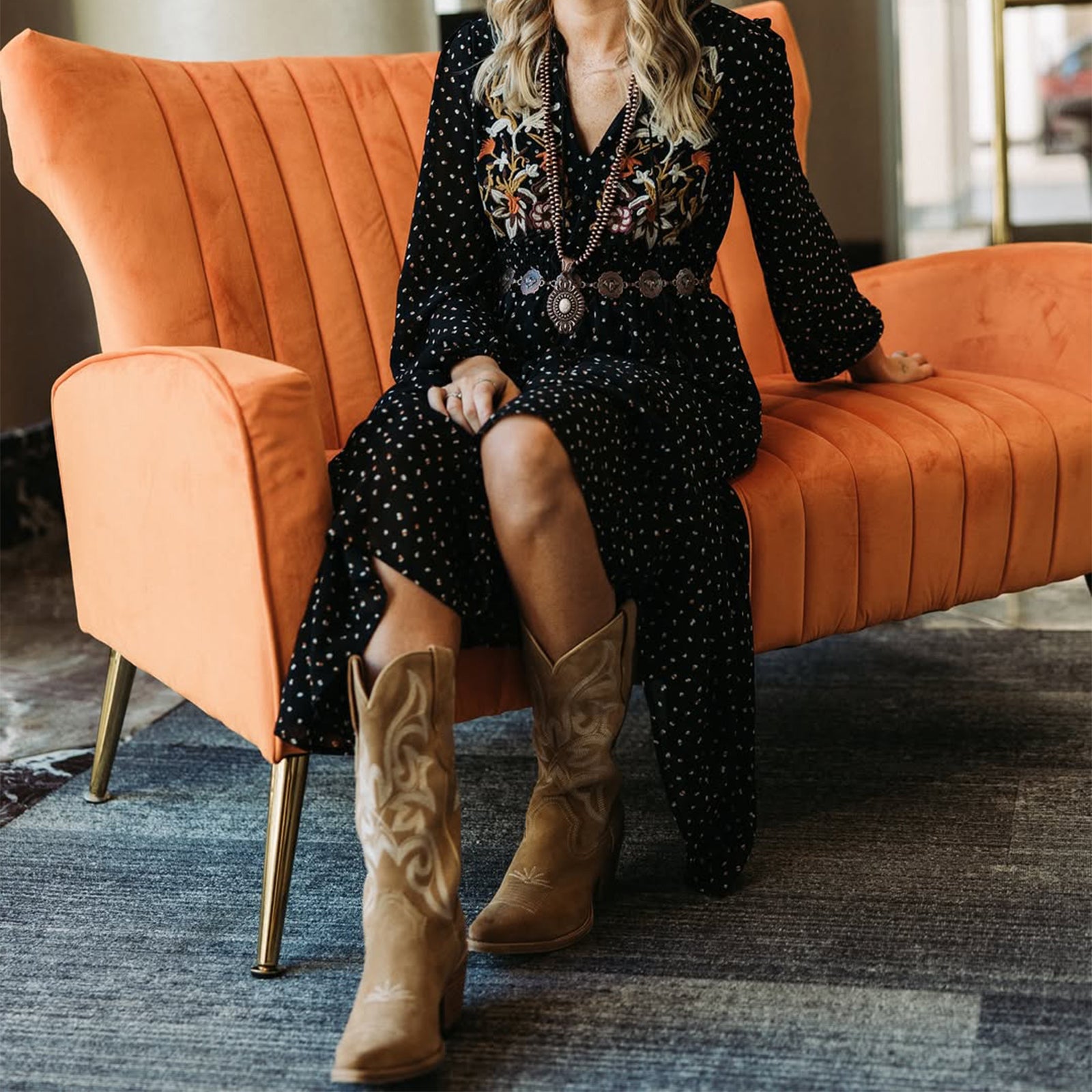 Rugged yet refined, these boots combine a faux suede finish with timeless embroidery, offering a bold Western statement that’s effortlessly stylish.