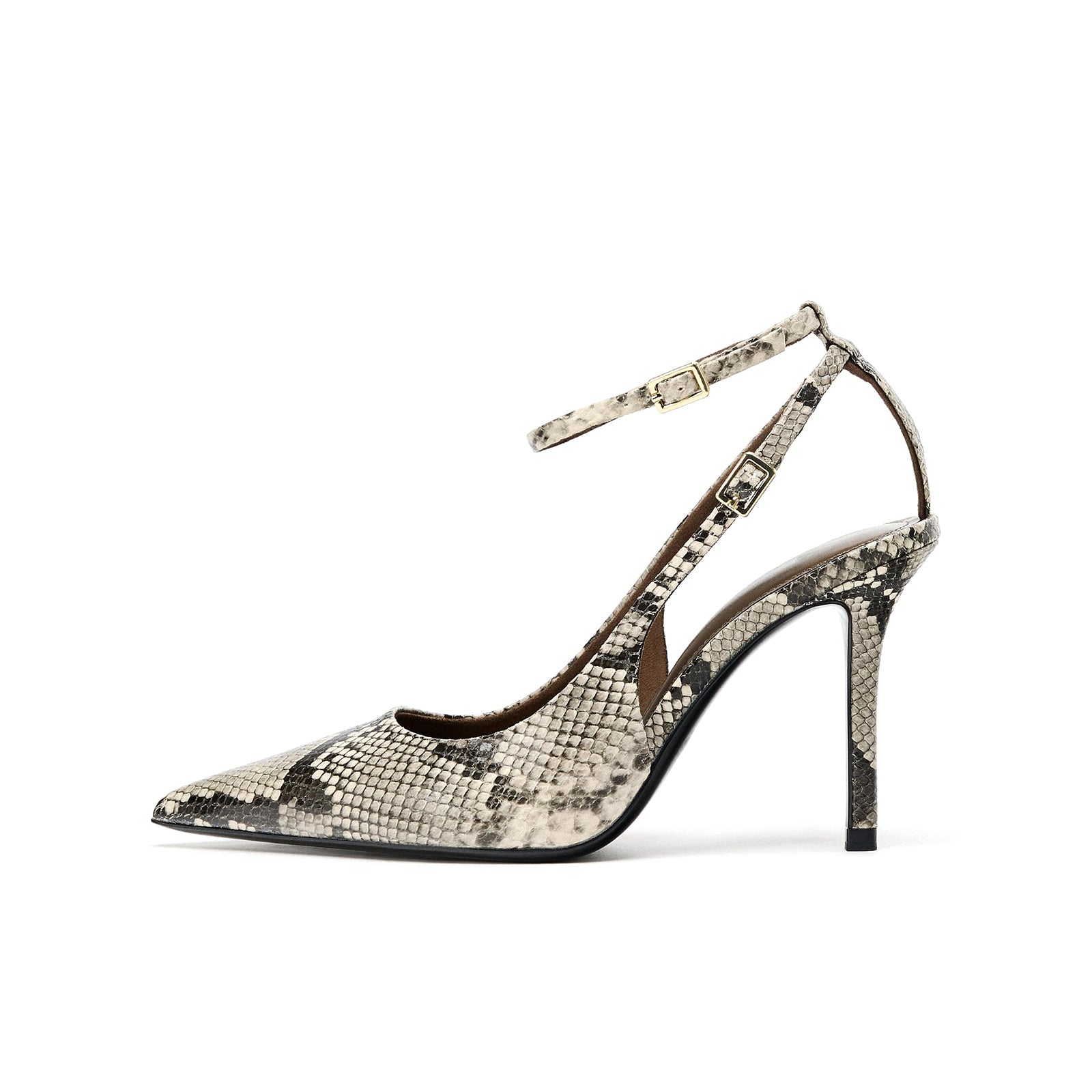 Snakeskin Pointed-Toe Ankle Strap Slingback High Heels.