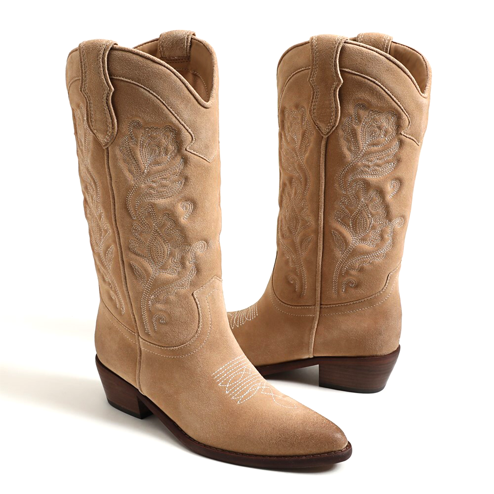 Tan Faux Suede Almond-Toe Flowers Embroidery Mid Calf Cowgirl Boots.