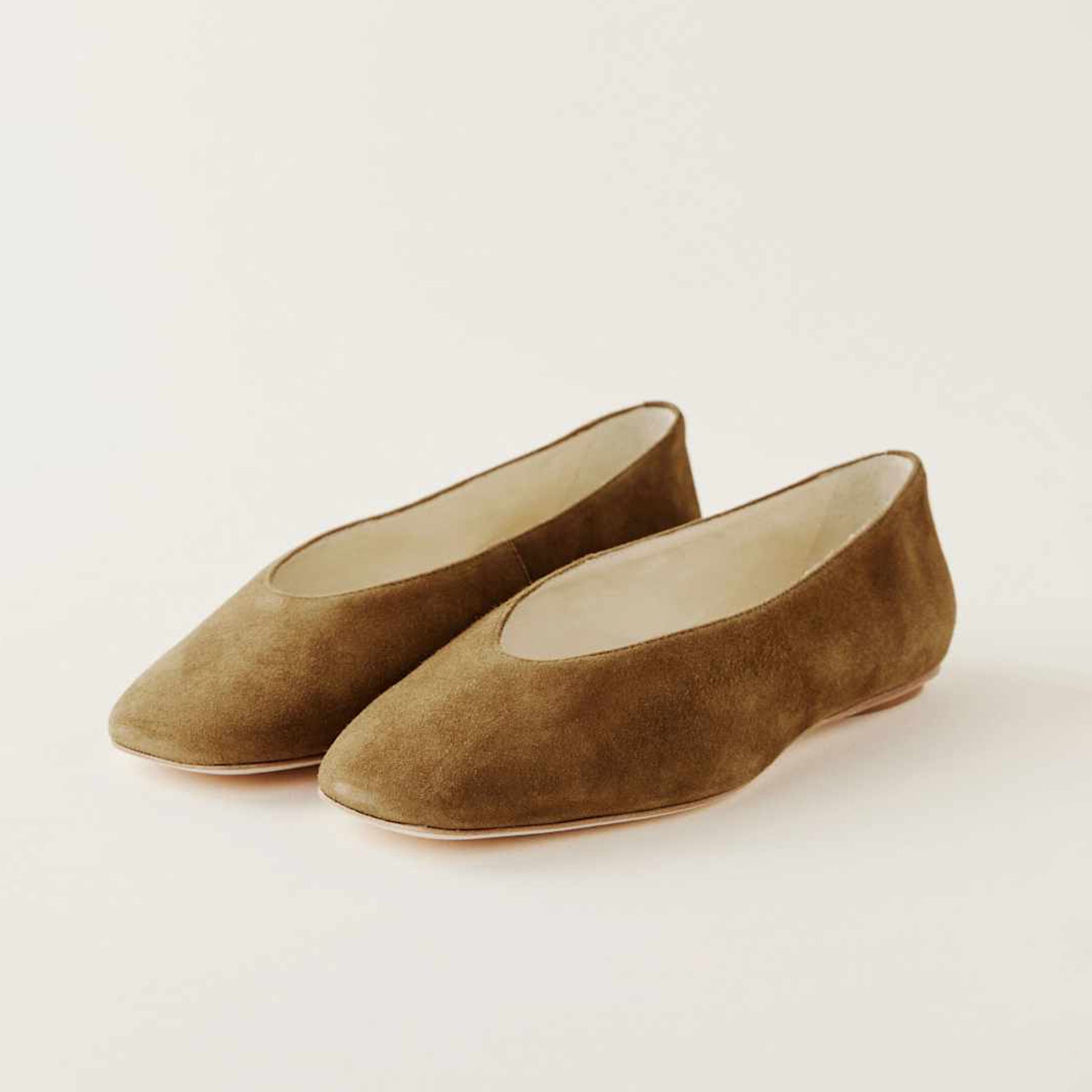 Tan Faux Suede Square-Toe Classic Ballet Slip-On Flats.