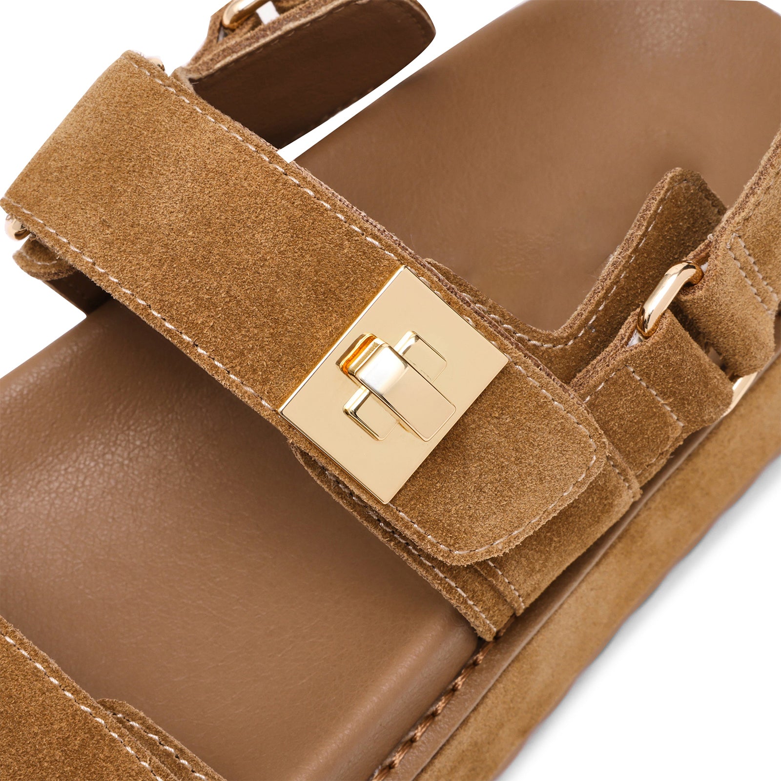 Tan Faux Suede Square-Toe Three Straps Sandals Flats.