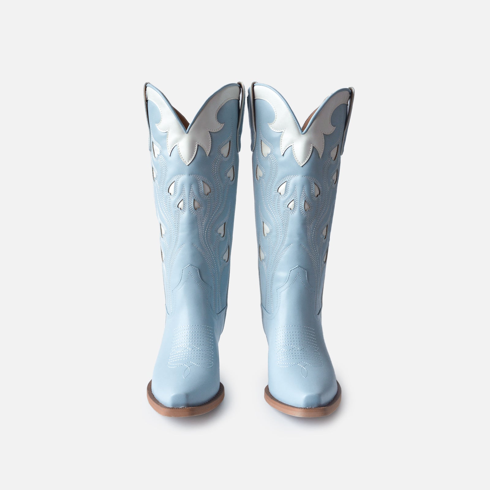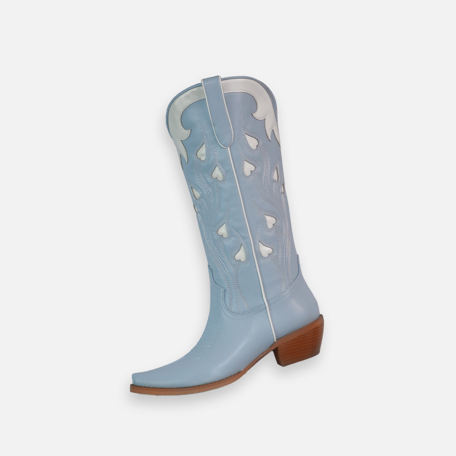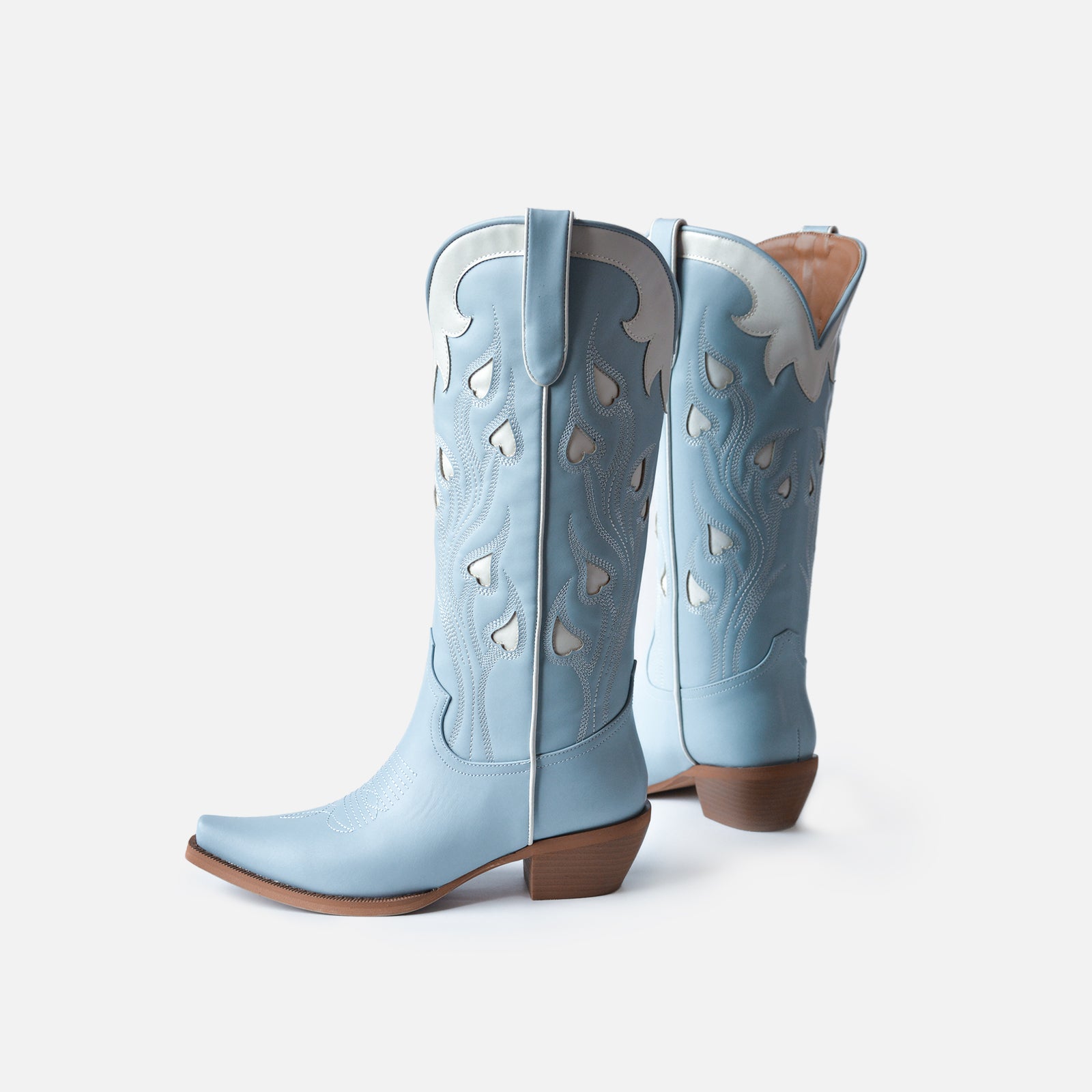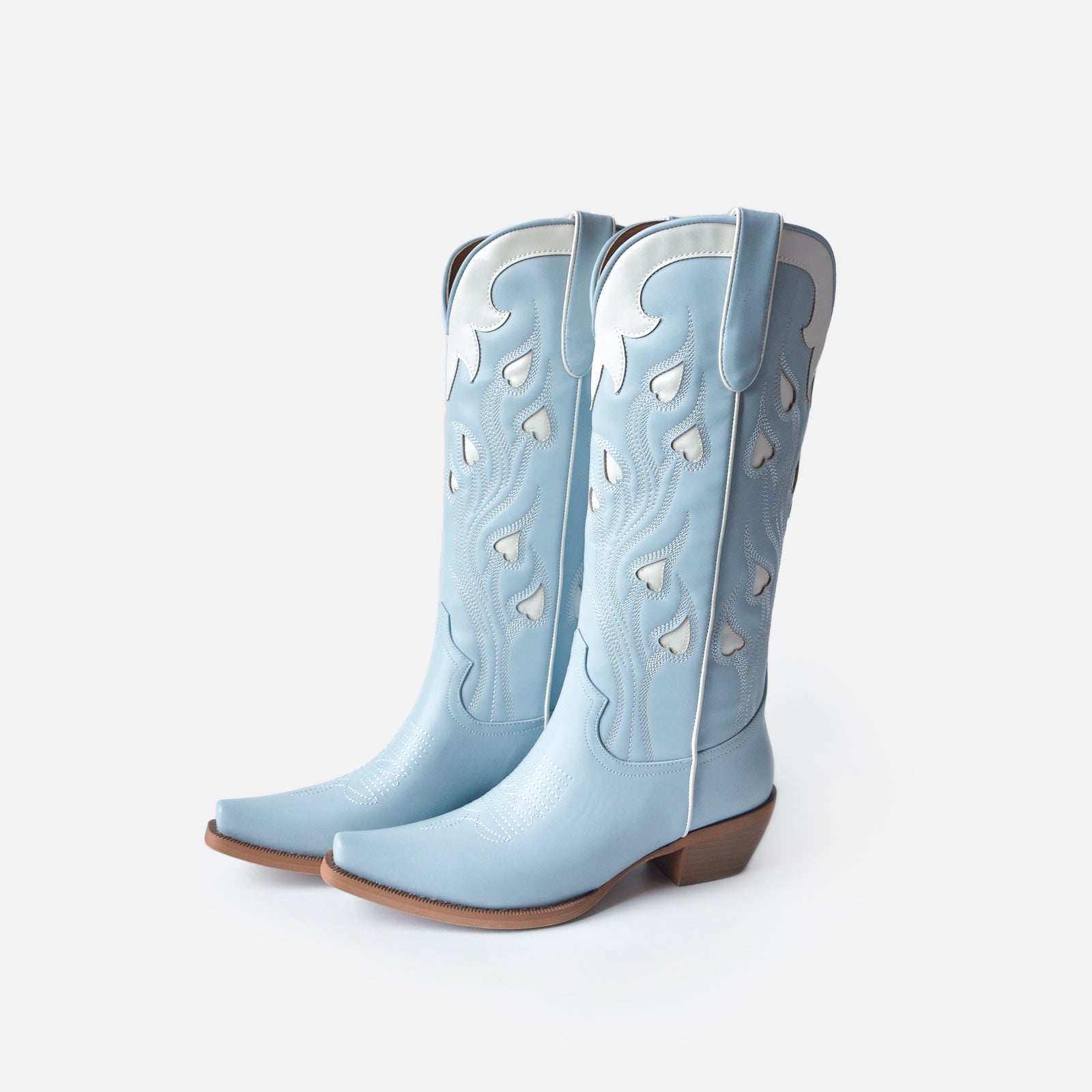 Blue Snip-Toe Embroidery White Heart Inlays Mid Calf Cowgirl Boots.