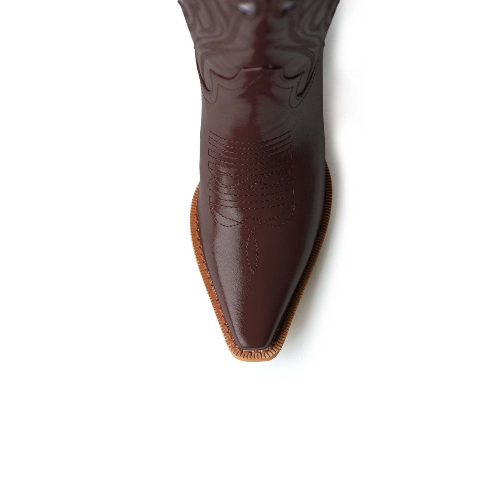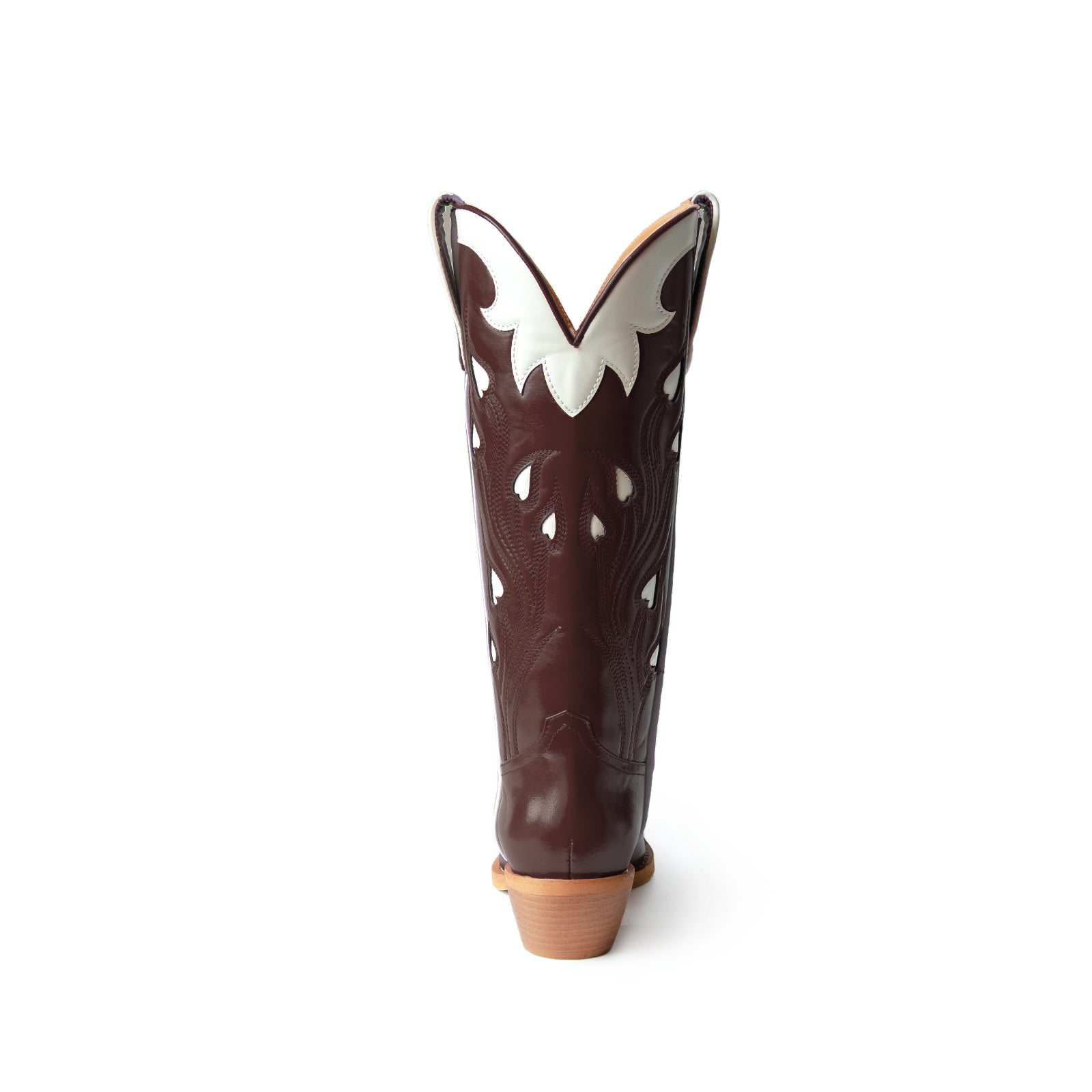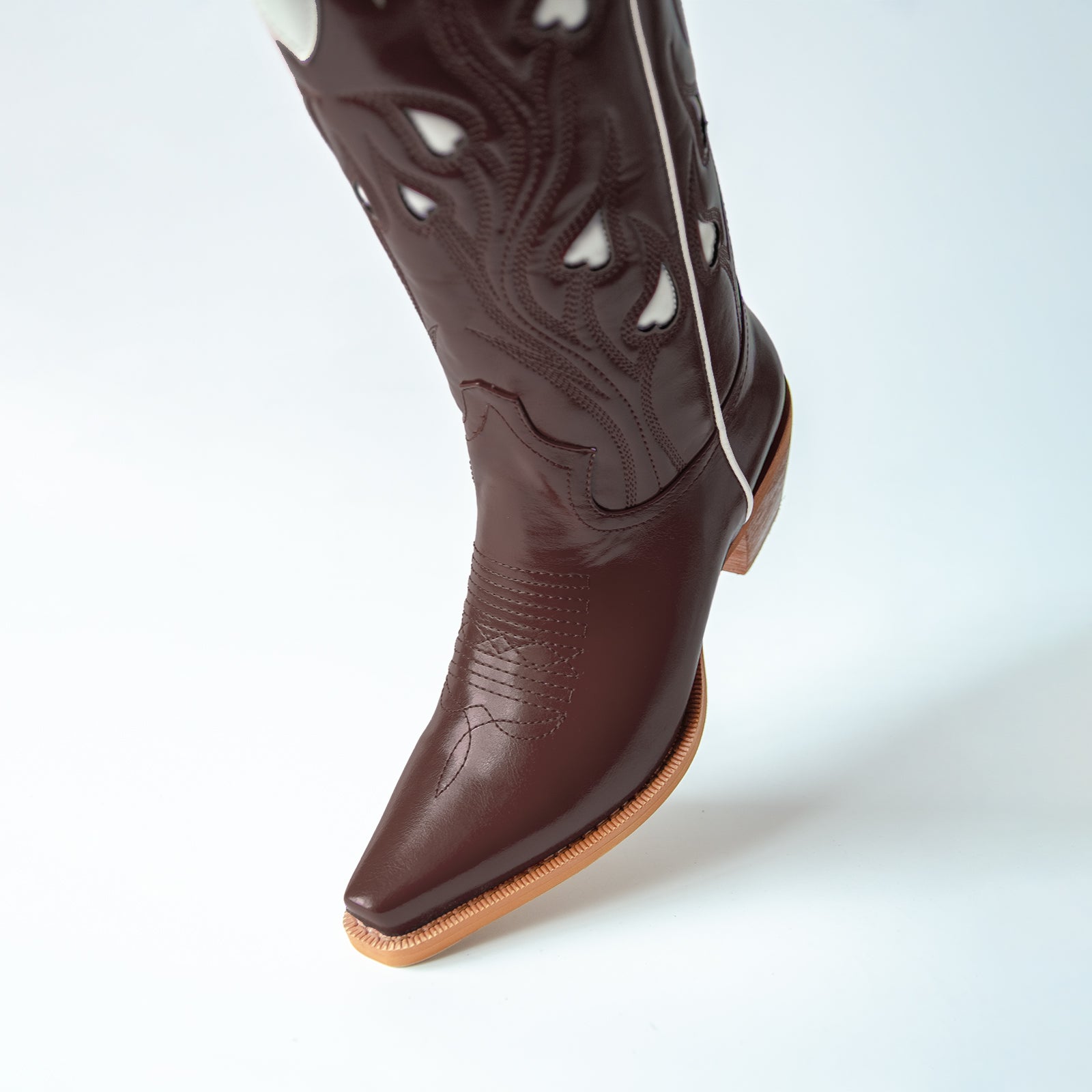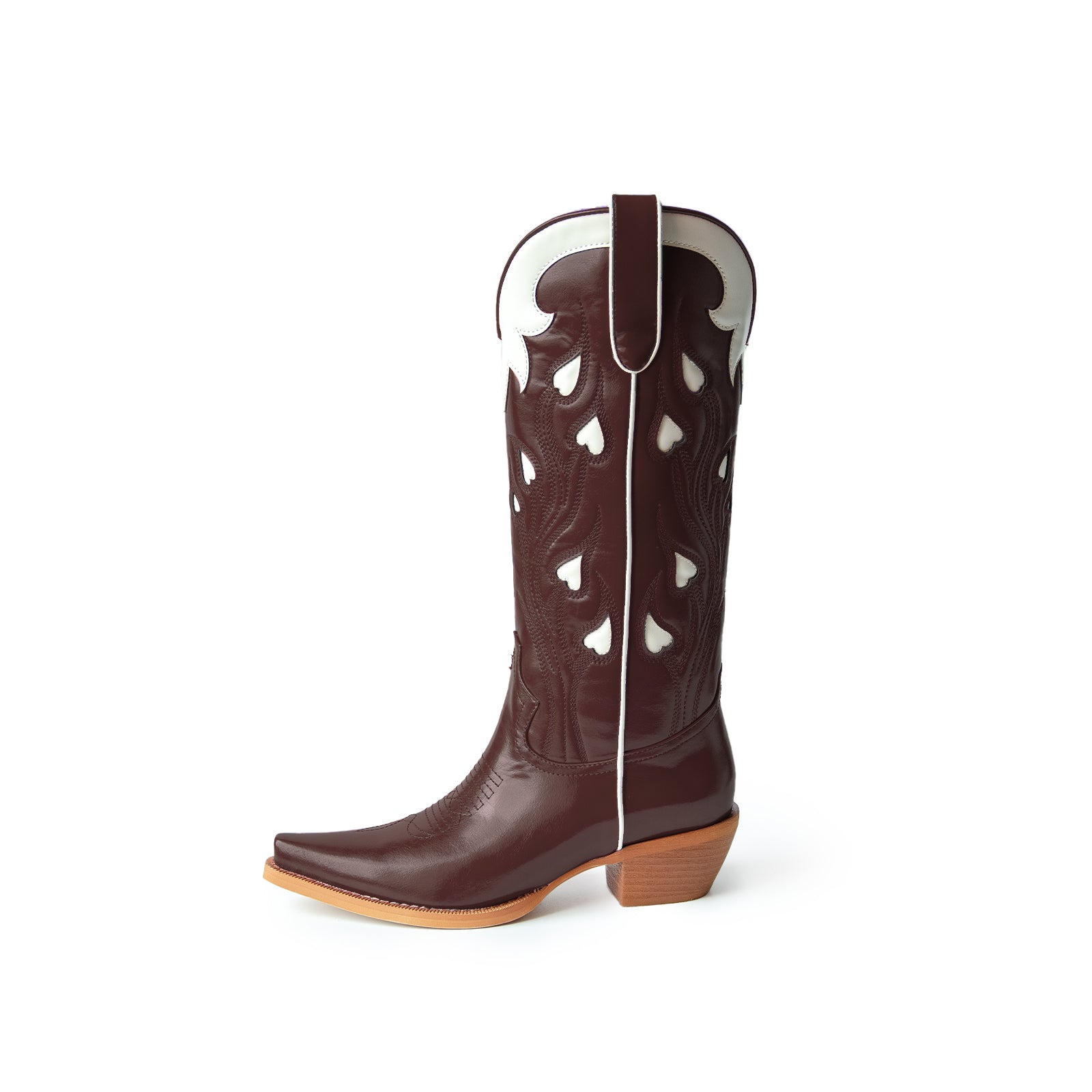 Chocolate Snip-Toe Embroidery White Heart Inlays Mid Calf Cowgirl Boots.