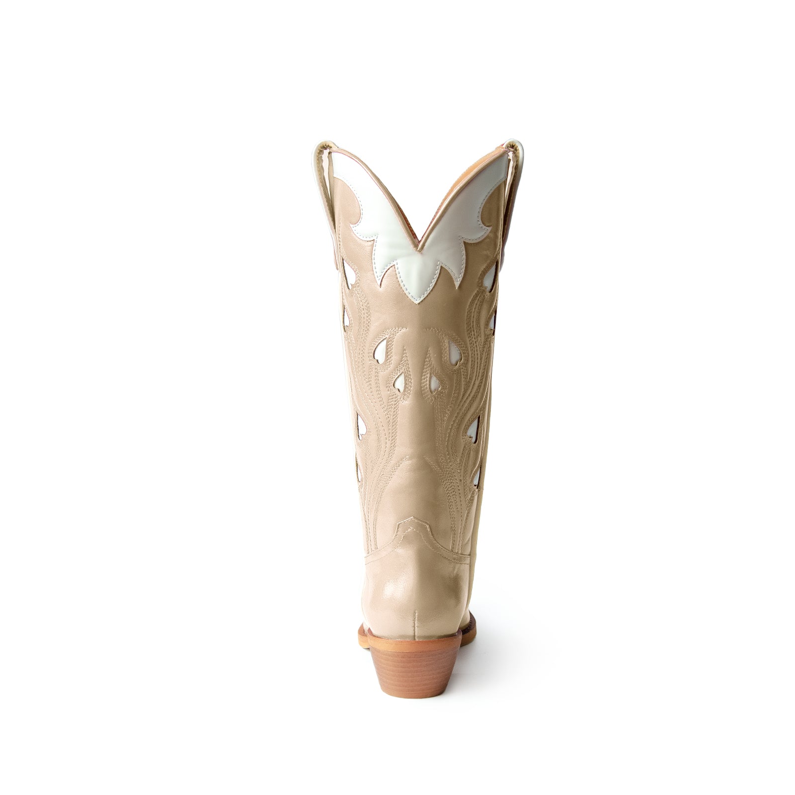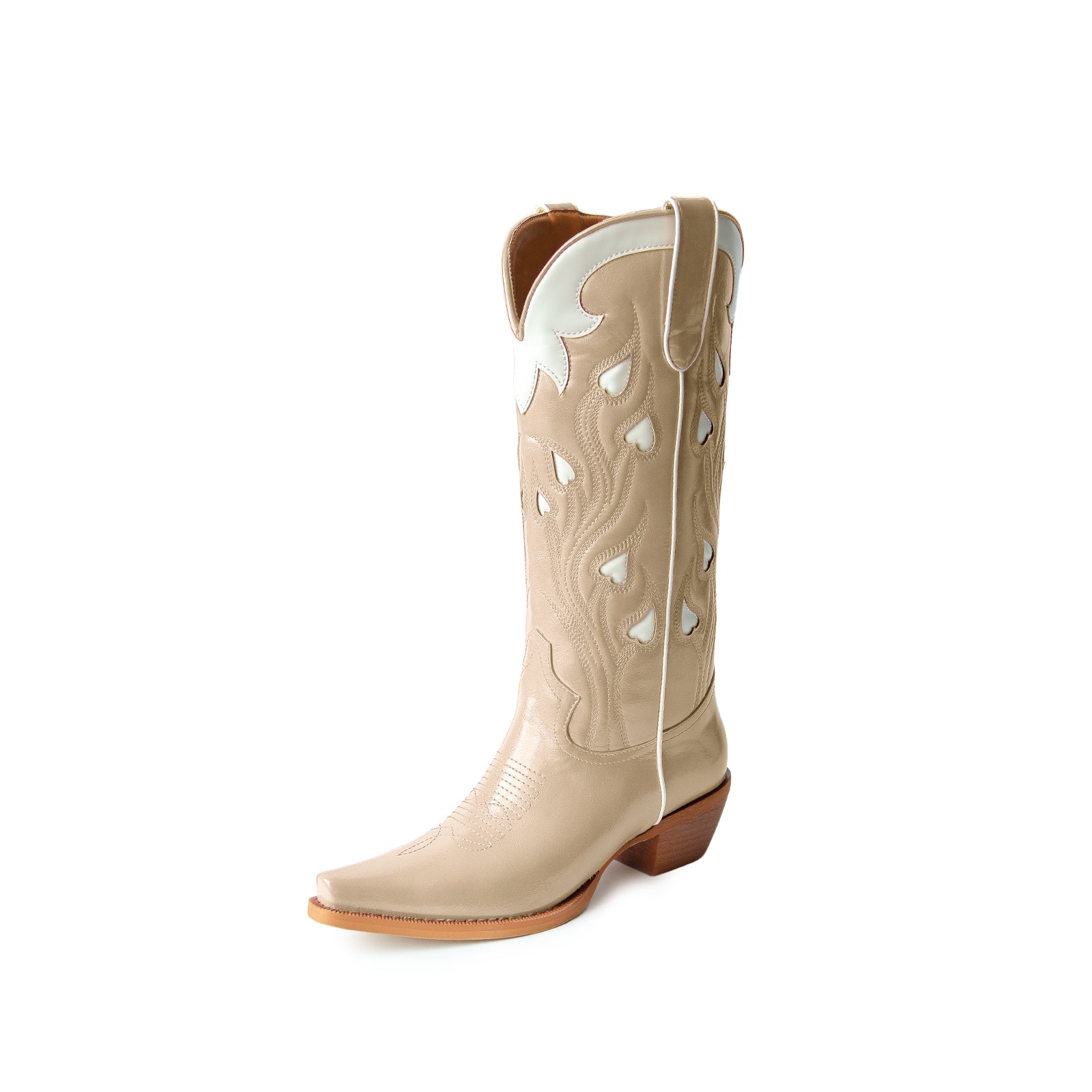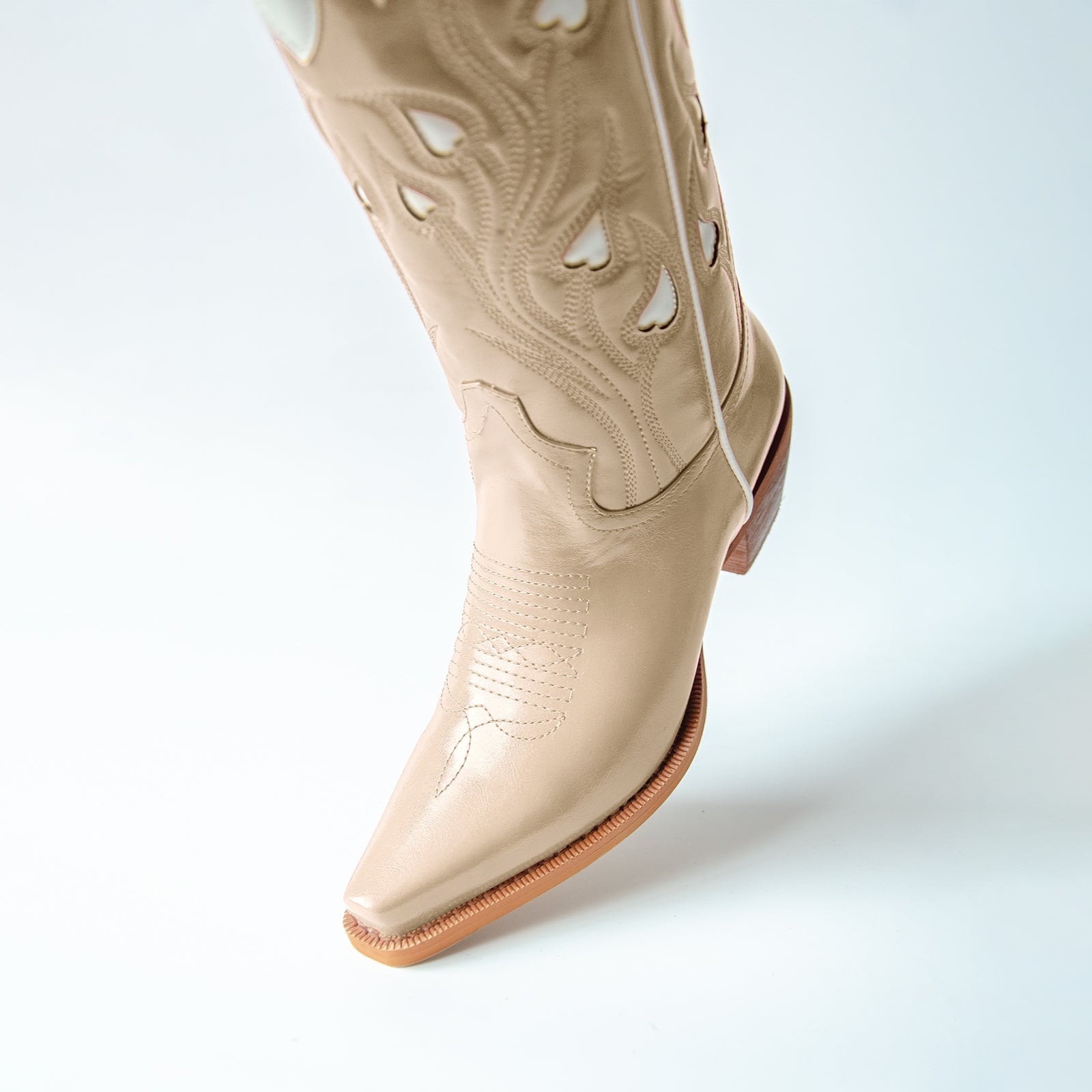 Cream Snip-Toe Embroidery White Heart Inlays Mid Calf Cowgirl Boots.
