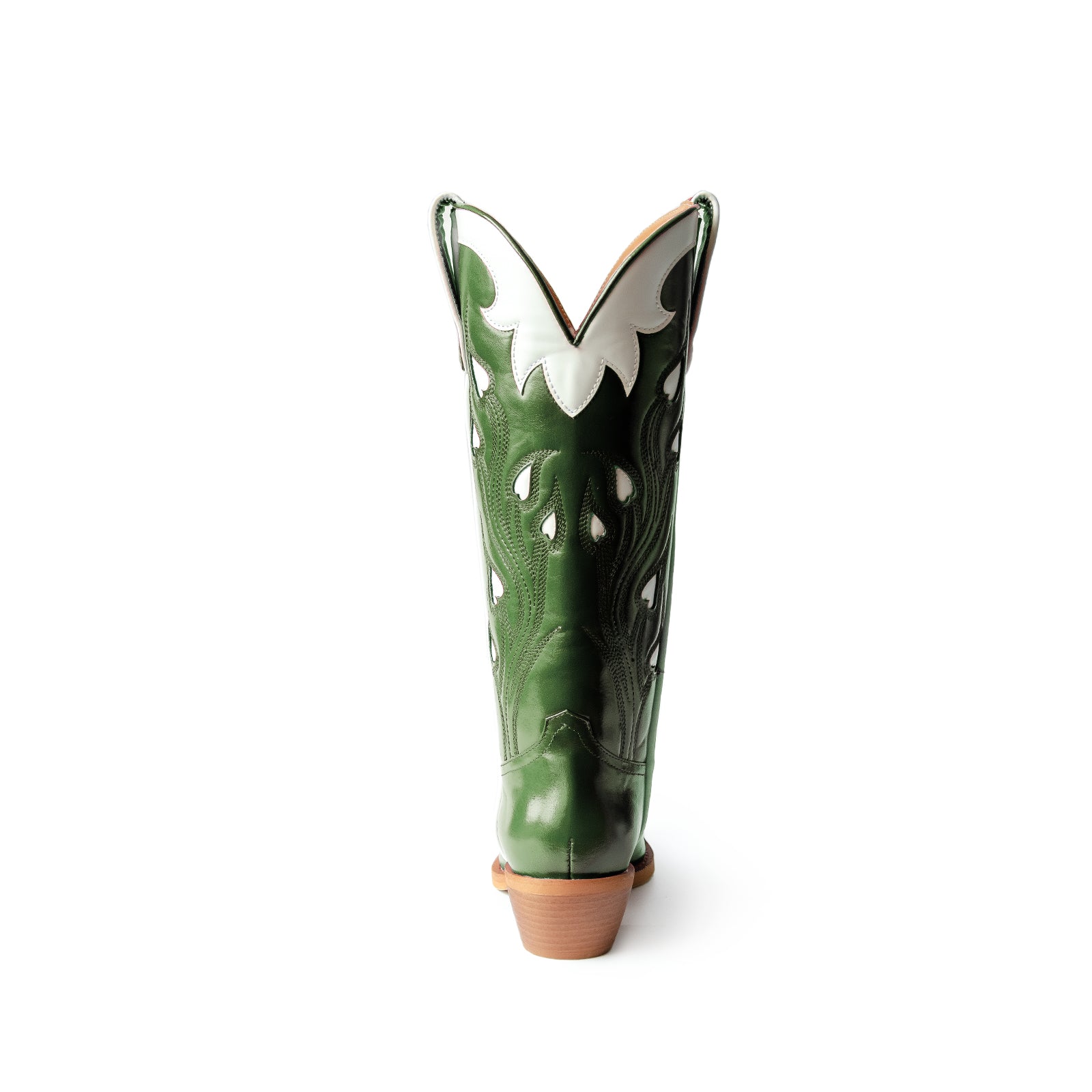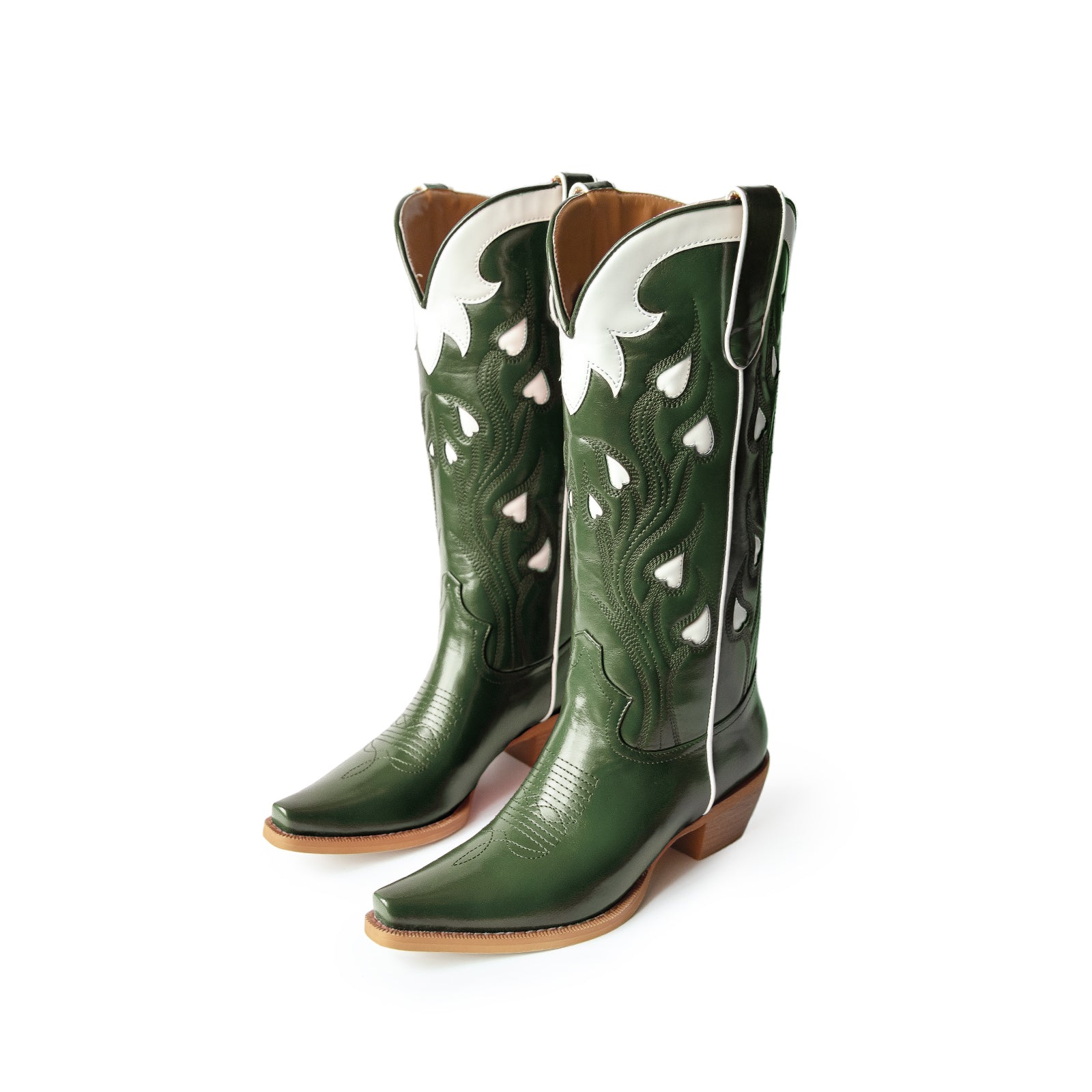 Grass Green Snip-Toe Embroidery White Heart Inlays Mid Calf Cowgirl Boots.
