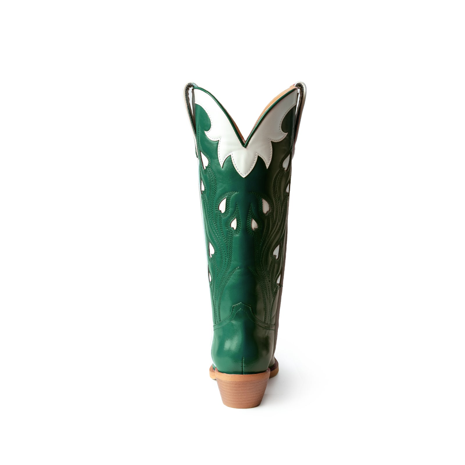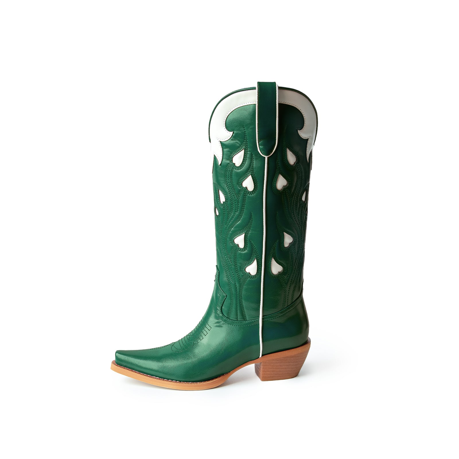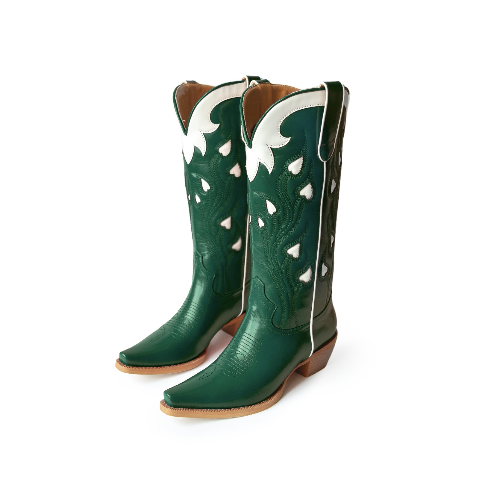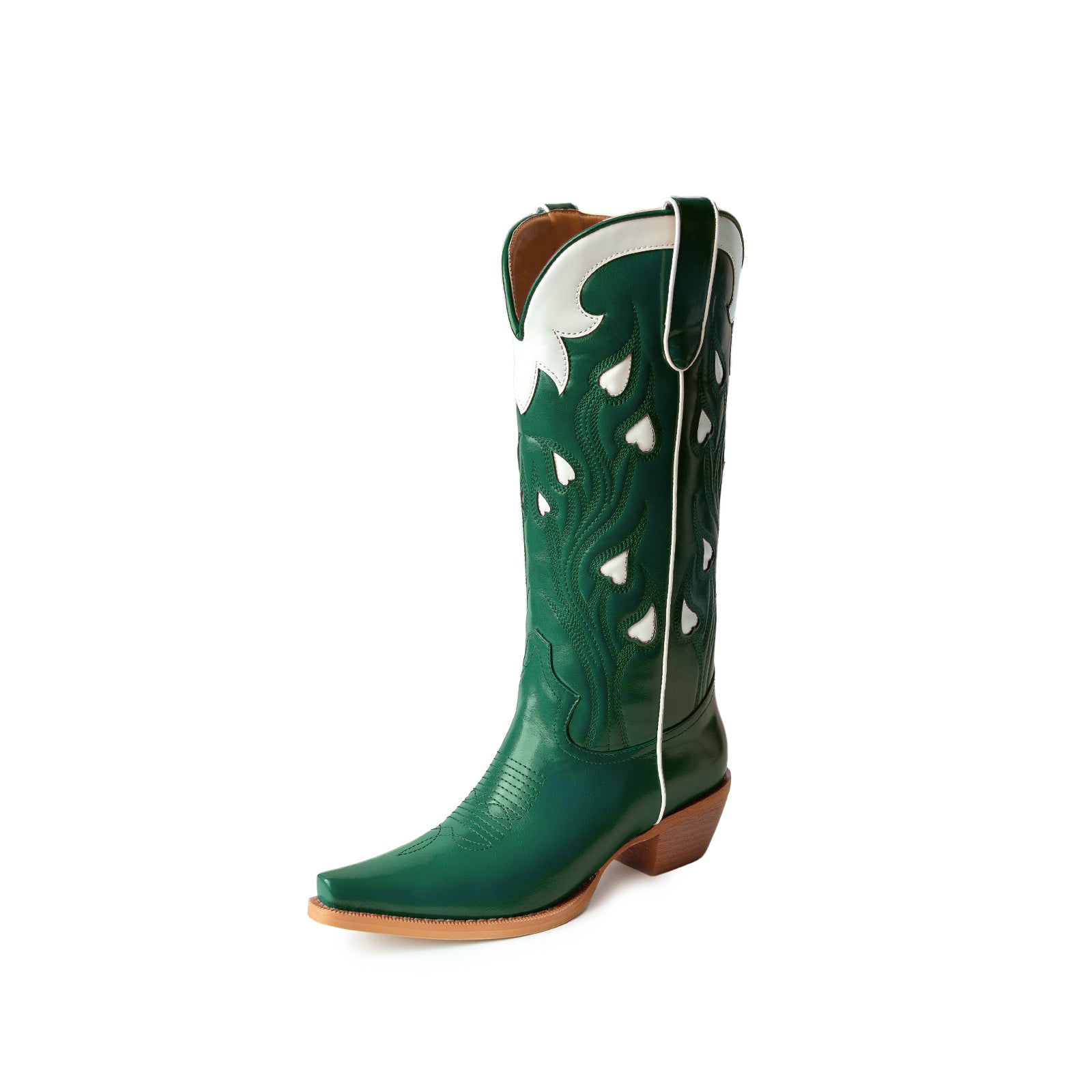 Green Snip-Toe Embroidery White Heart Inlays Mid Calf Cowgirl Boots.