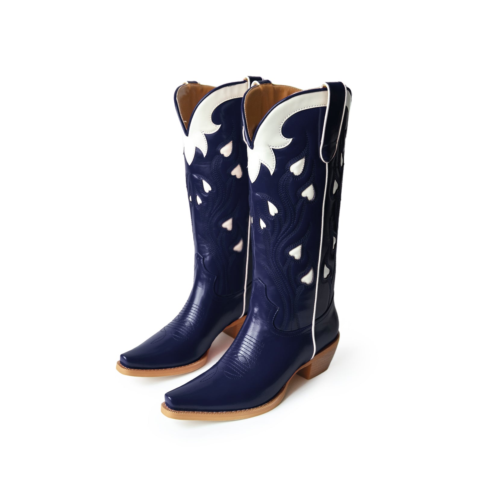 Purplish Blue Snip-Toe Embroidery White Heart Inlays Mid Calf Cowgirl Boots.