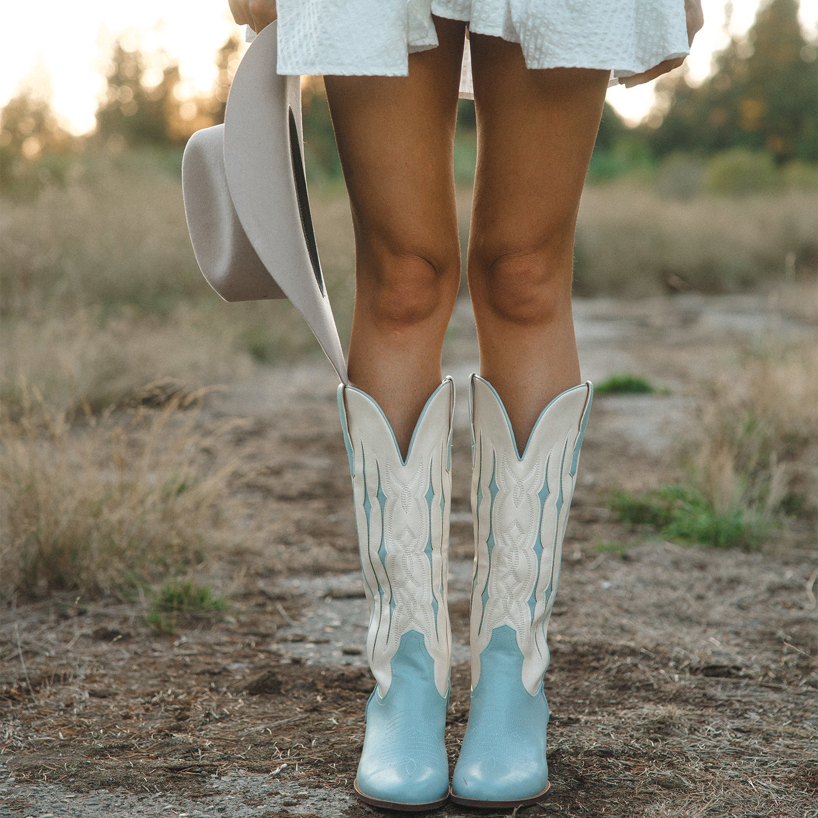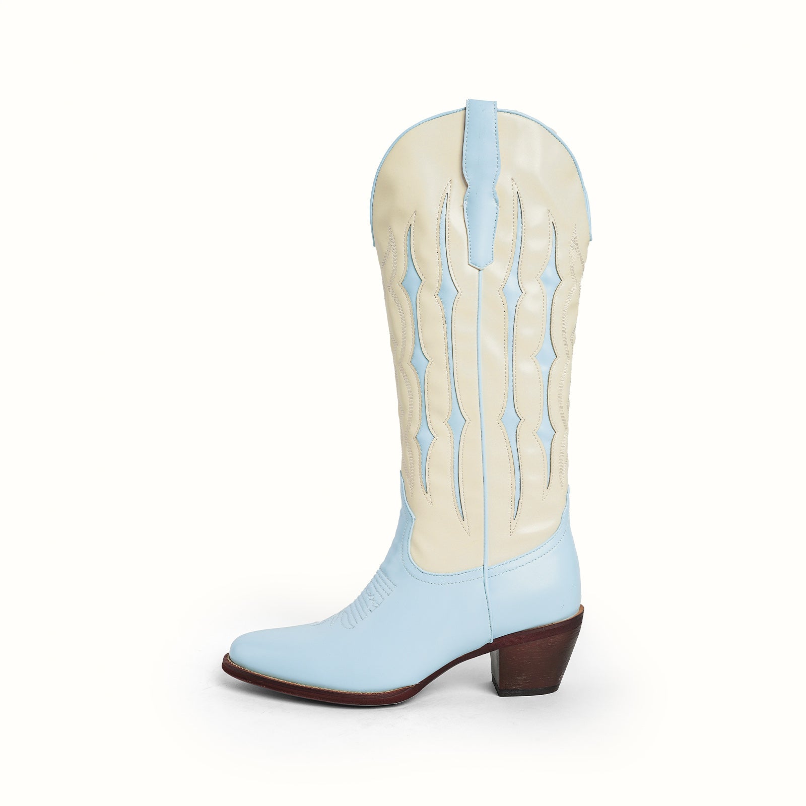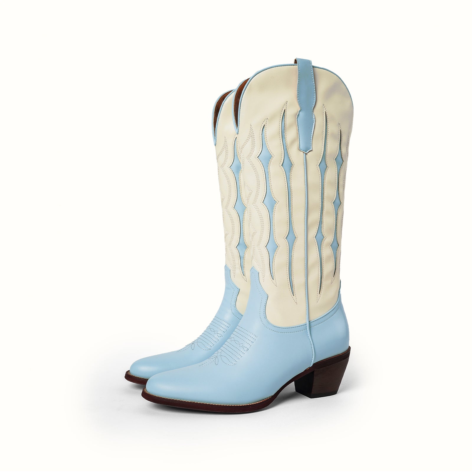 Mid-calf embroidery inlay vegan leather Western boots contrast blue and white.