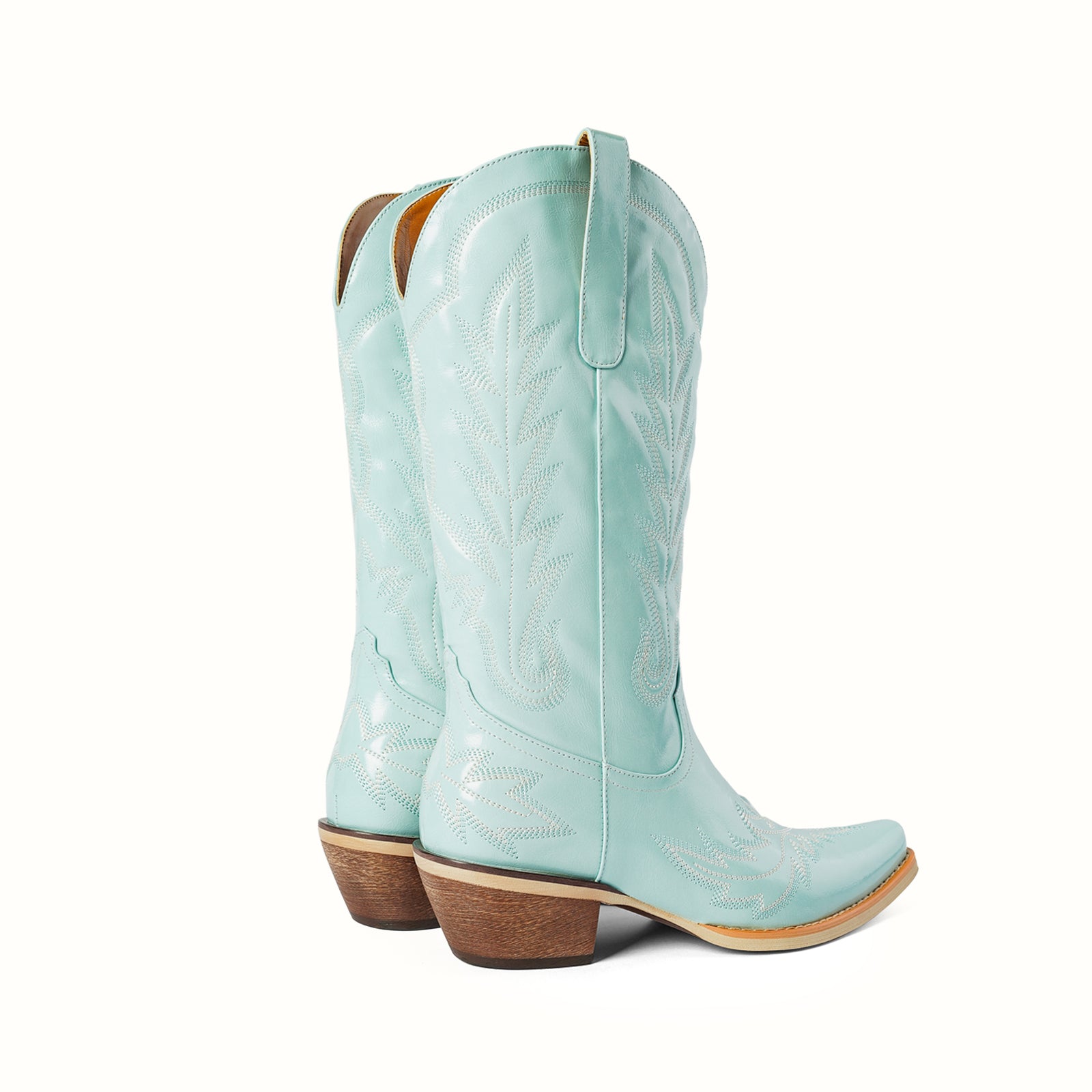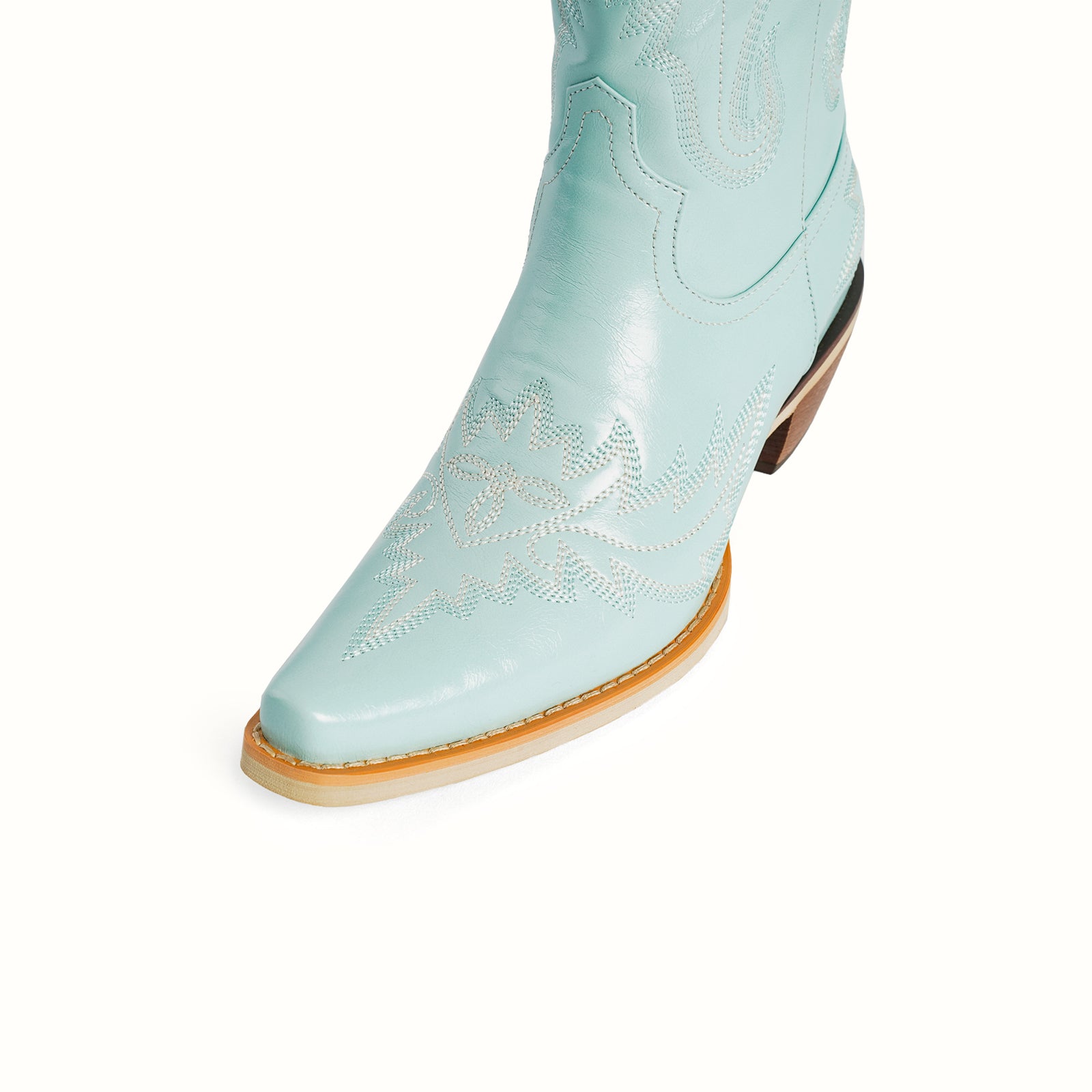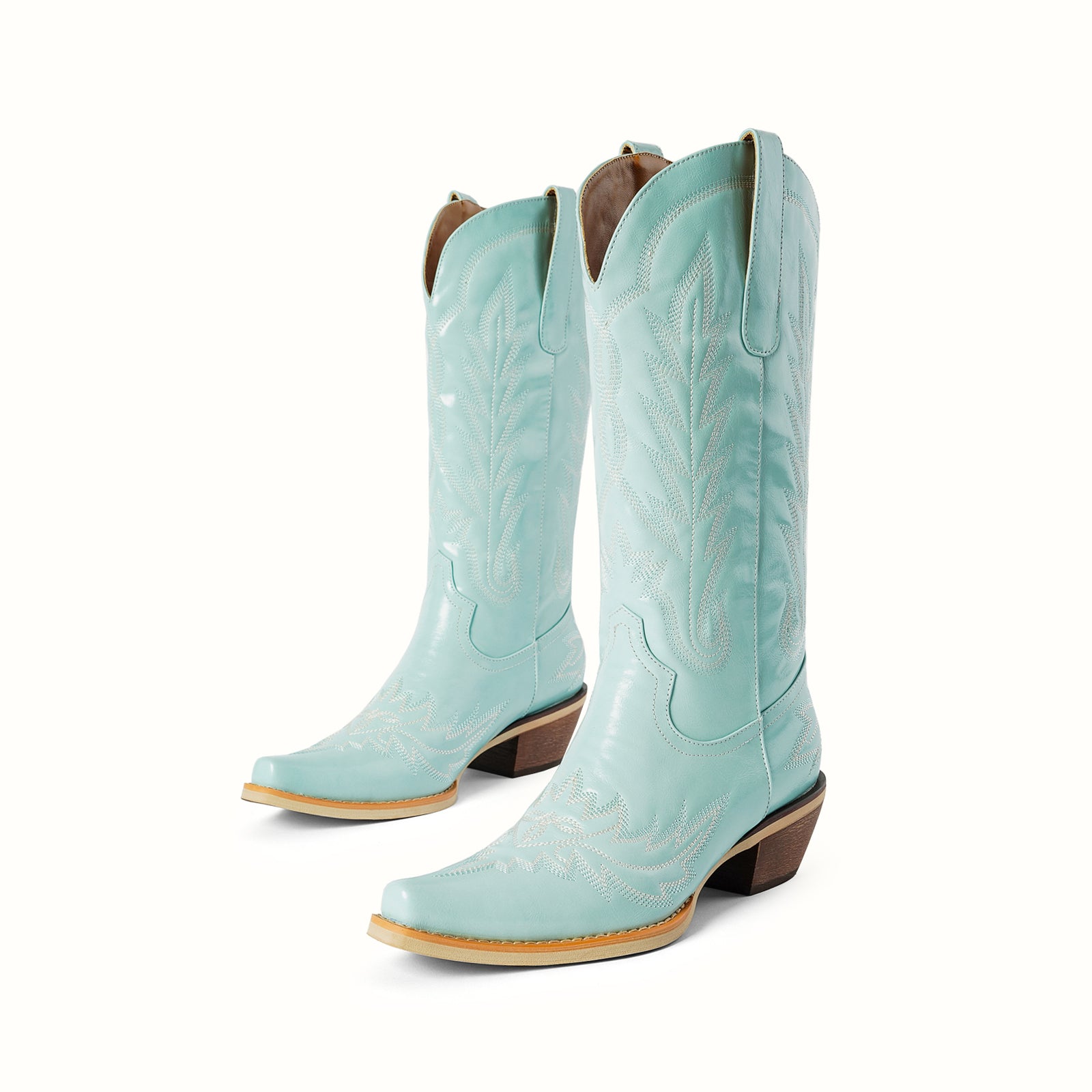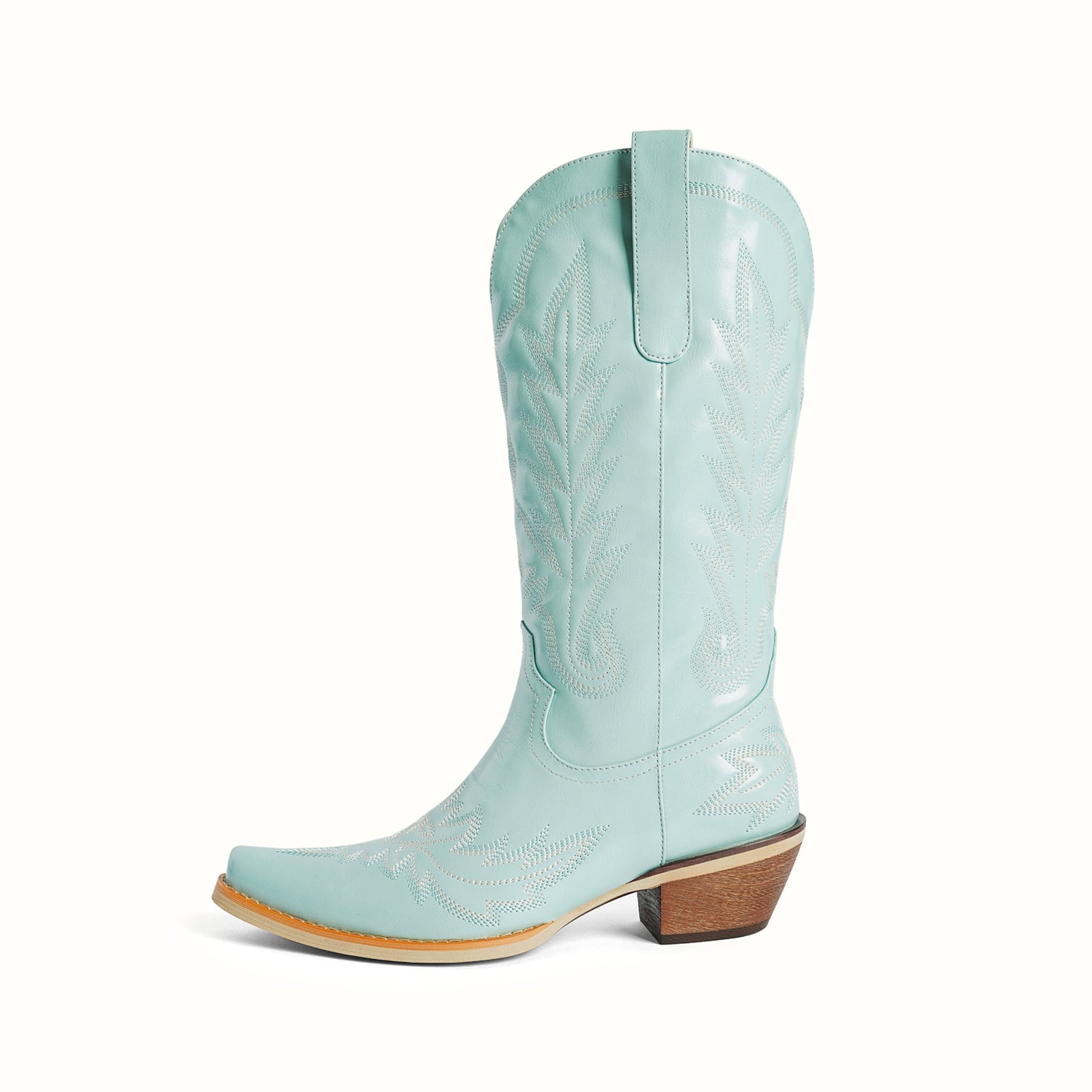 Mid-calf classic western embroidery vegan leather Cowgirl boots in blue.