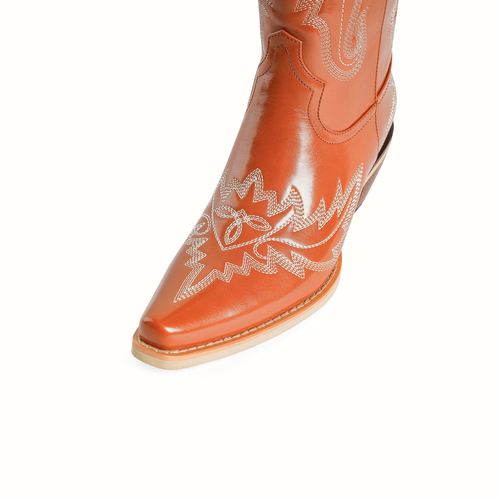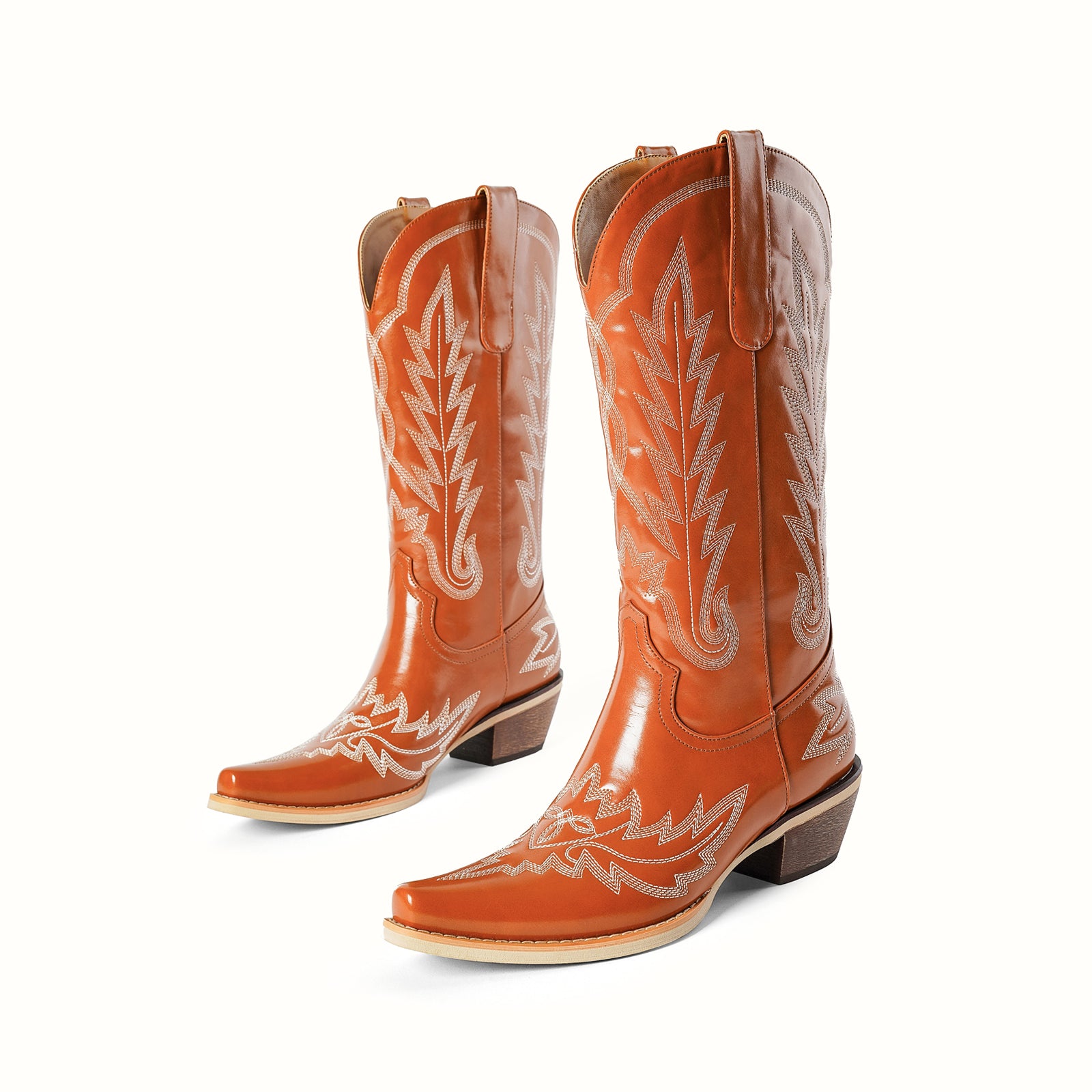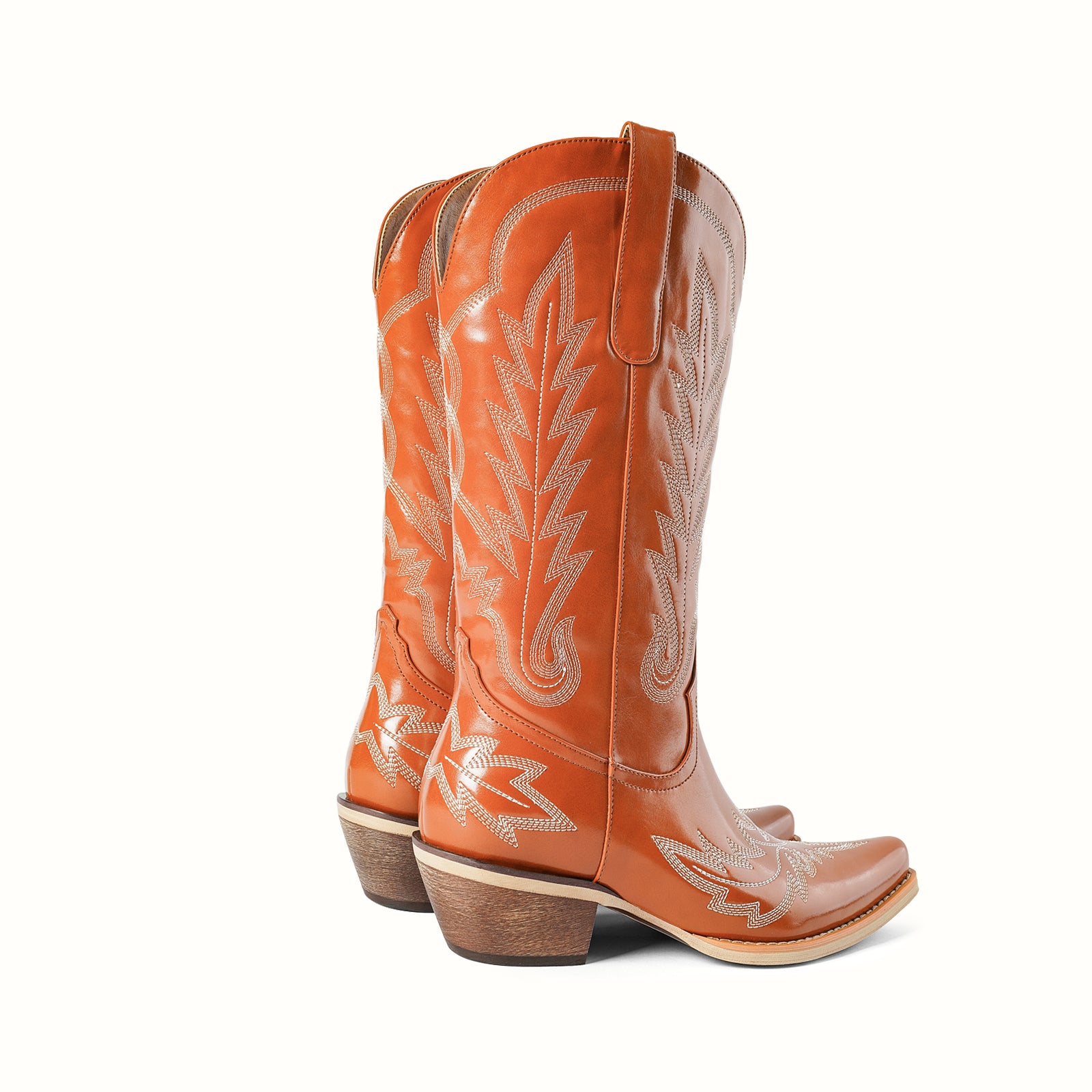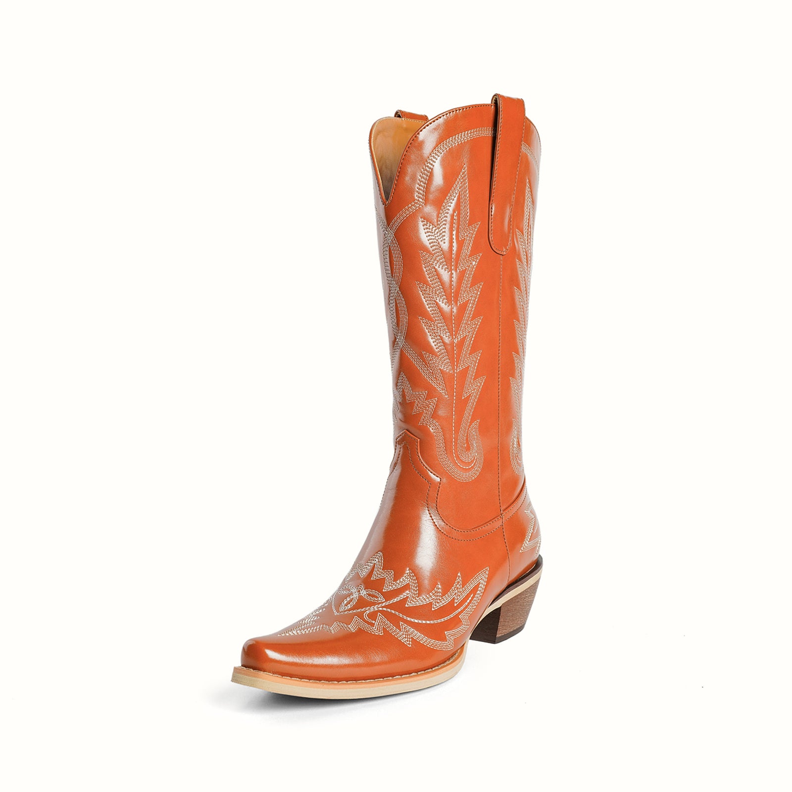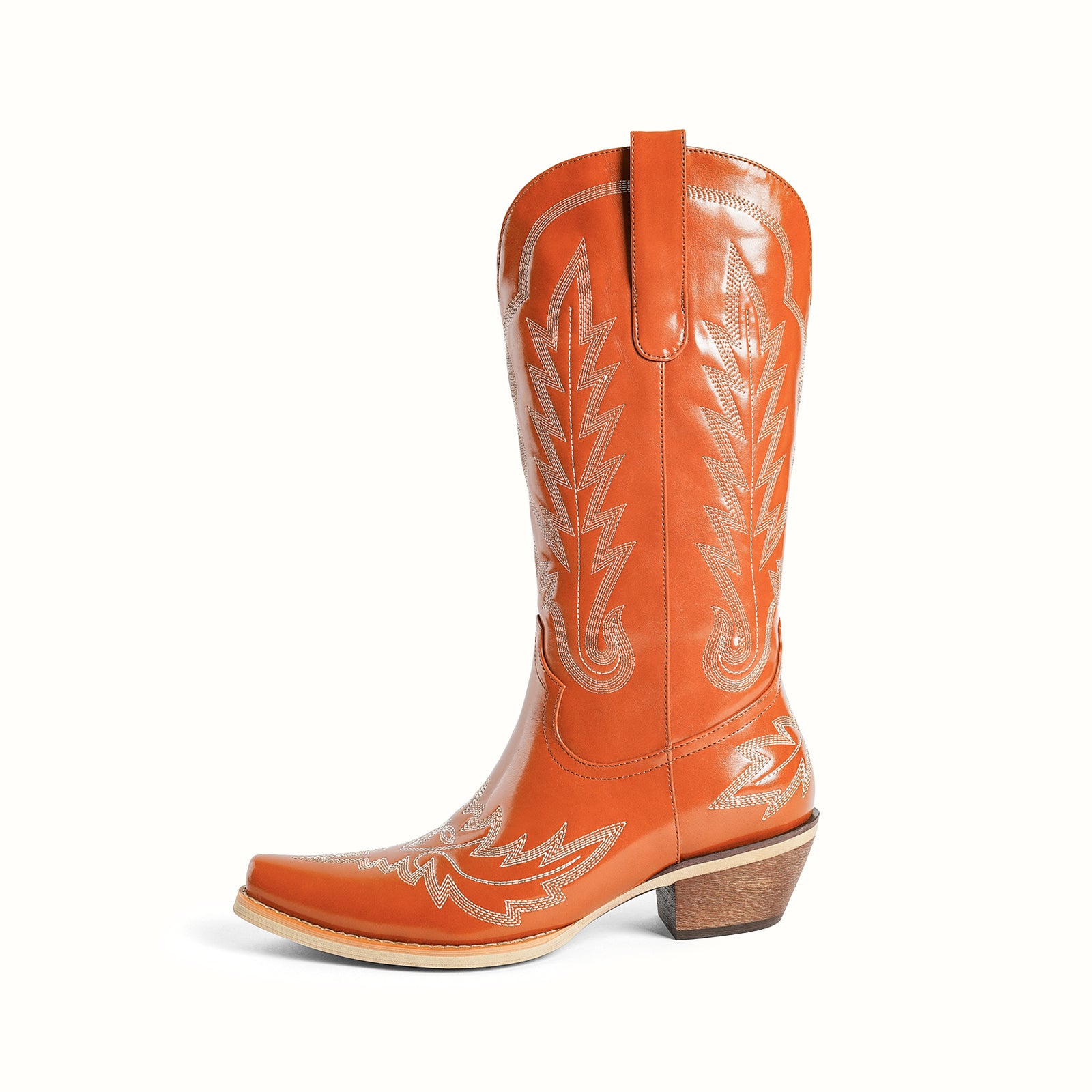 Mid-calf classic western embroidery vegan leather Cowgirl boots in orange.