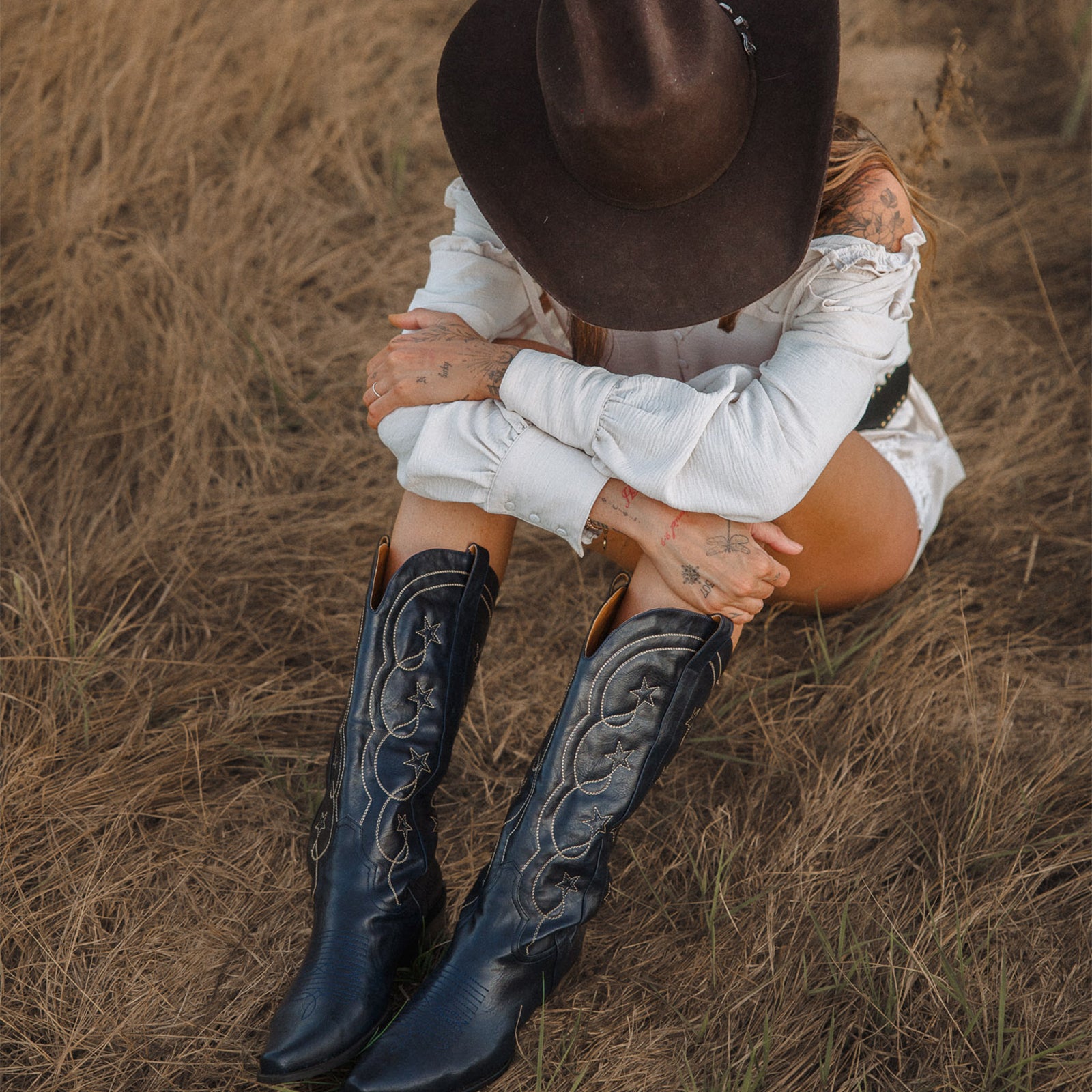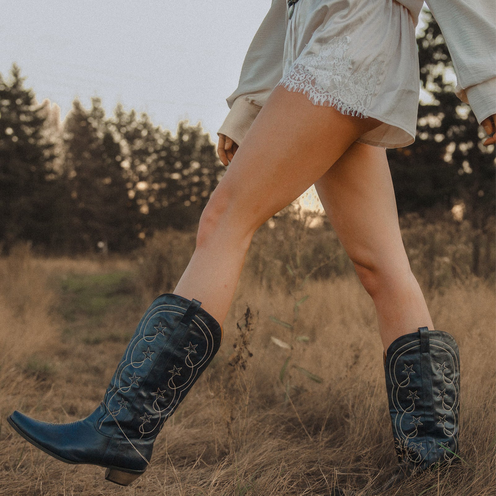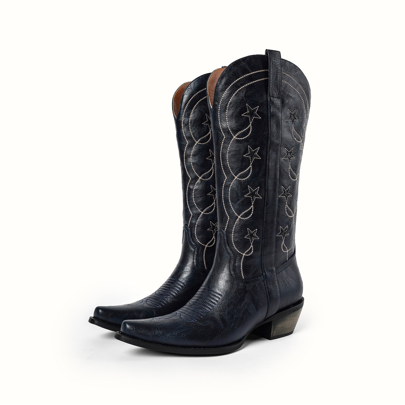Mid-calf star-embroidered and star-inlay vegan leather WESTERN boots in dark blue.