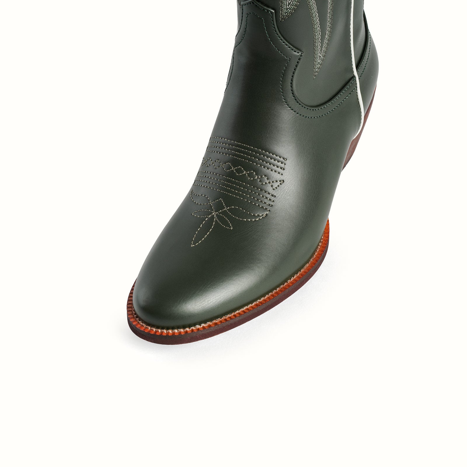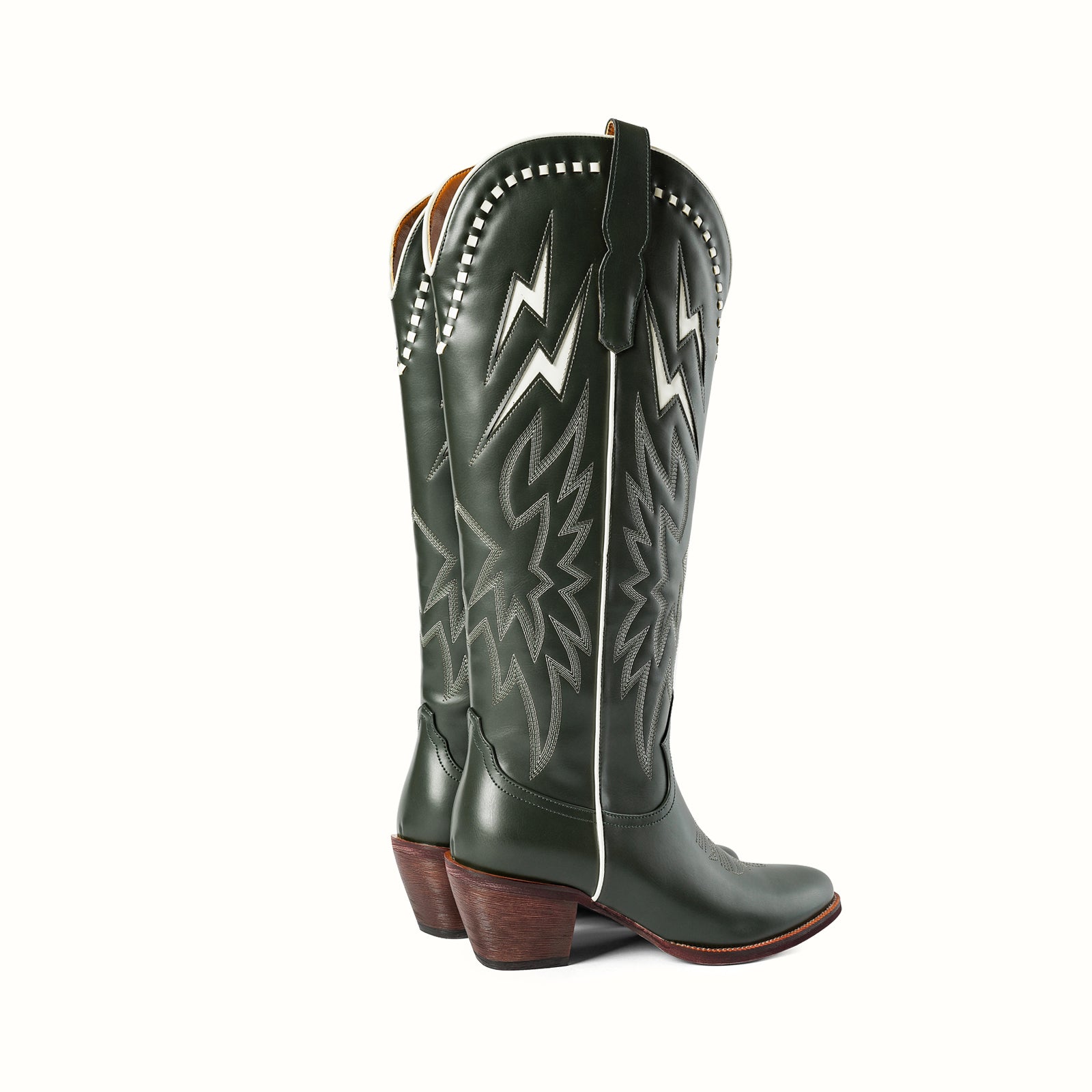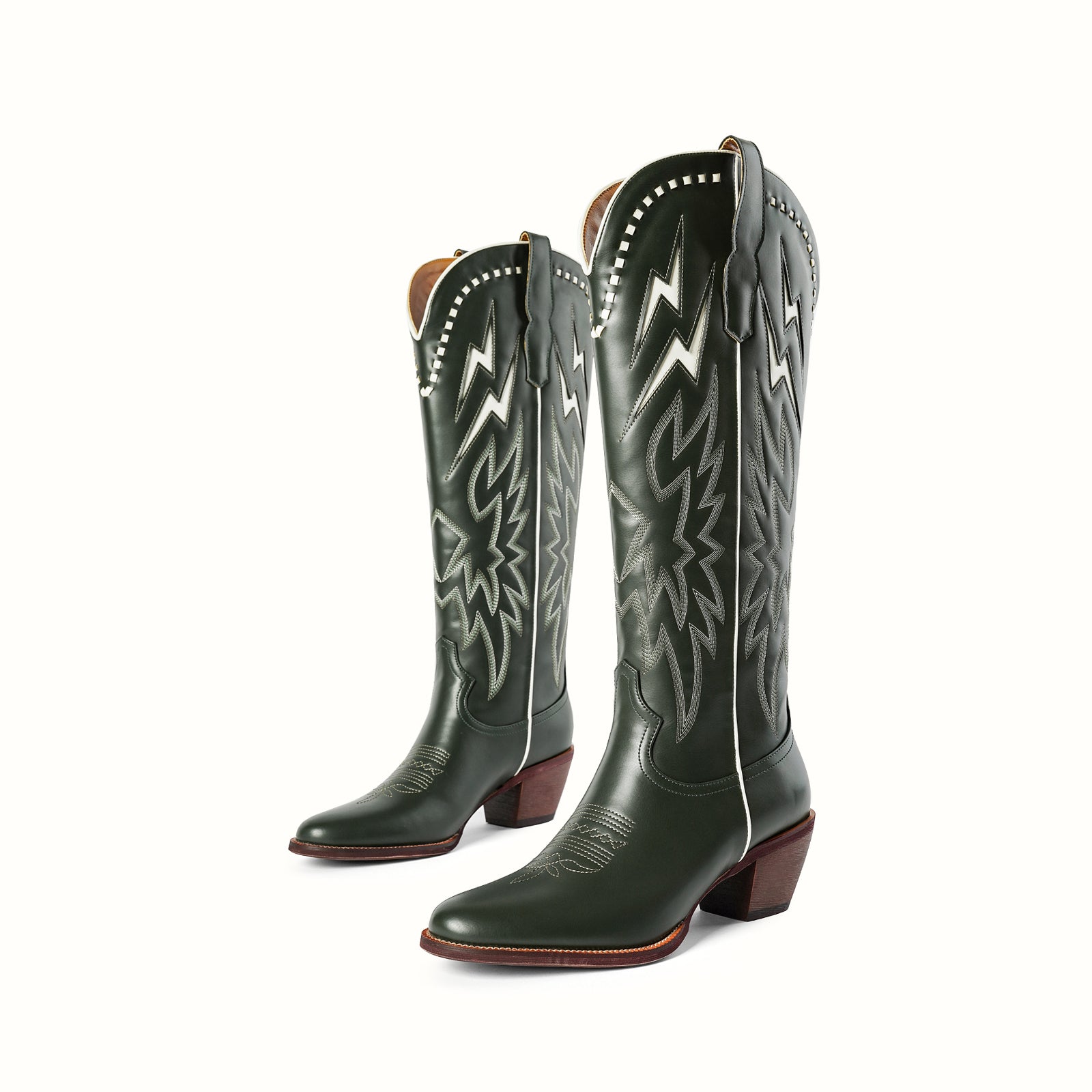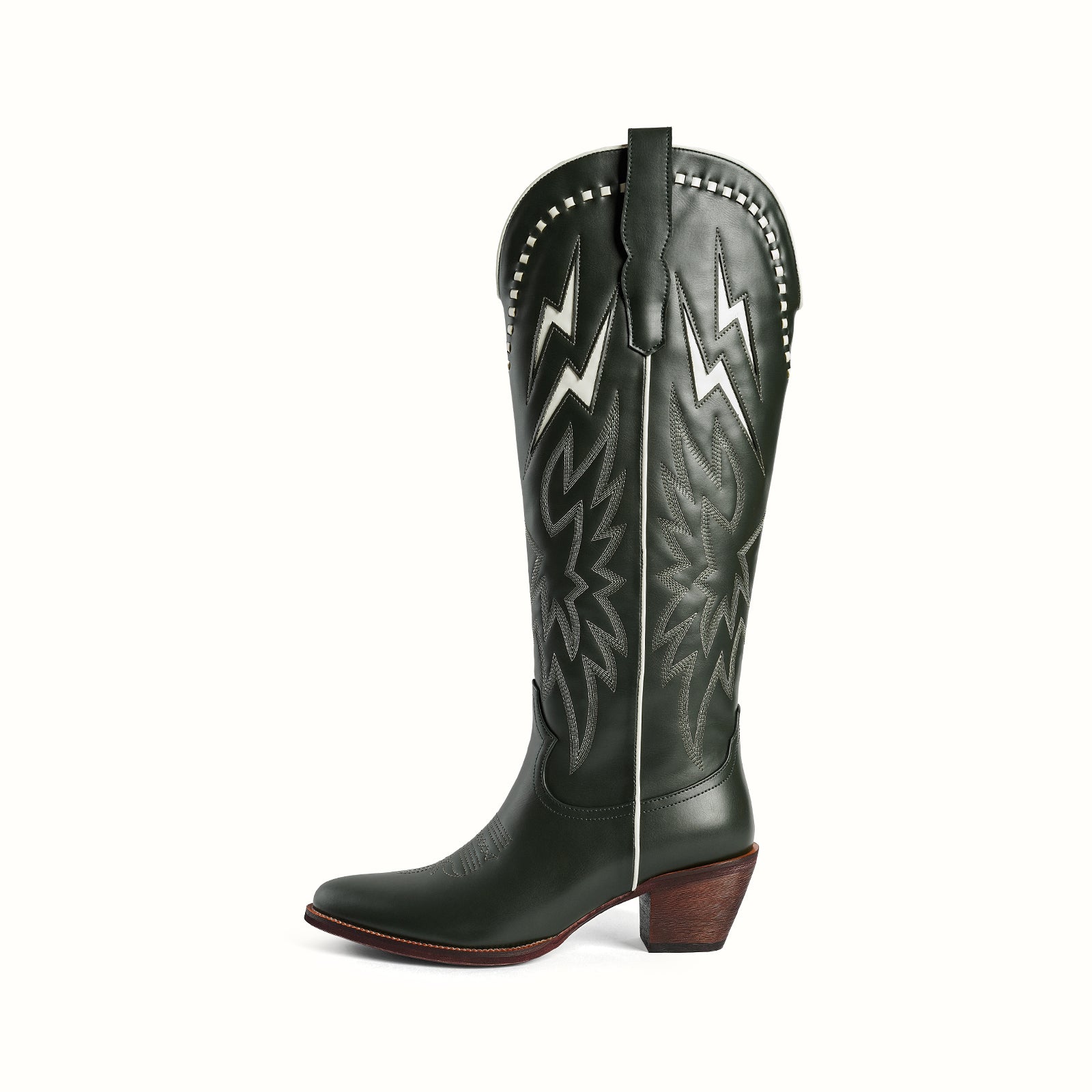 Knee-high tall lightning inlay and running stitch vegan leather Western boots in green.