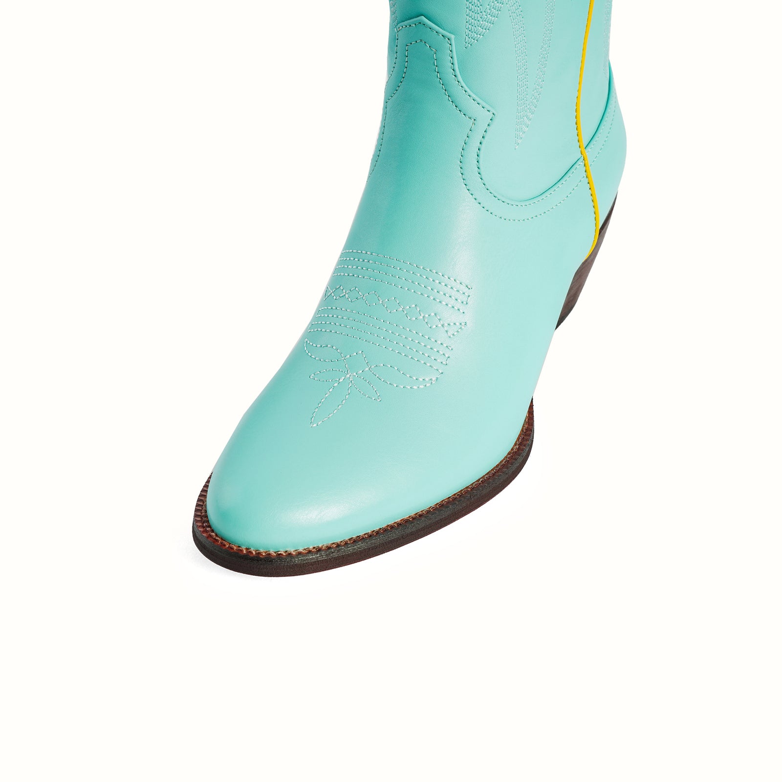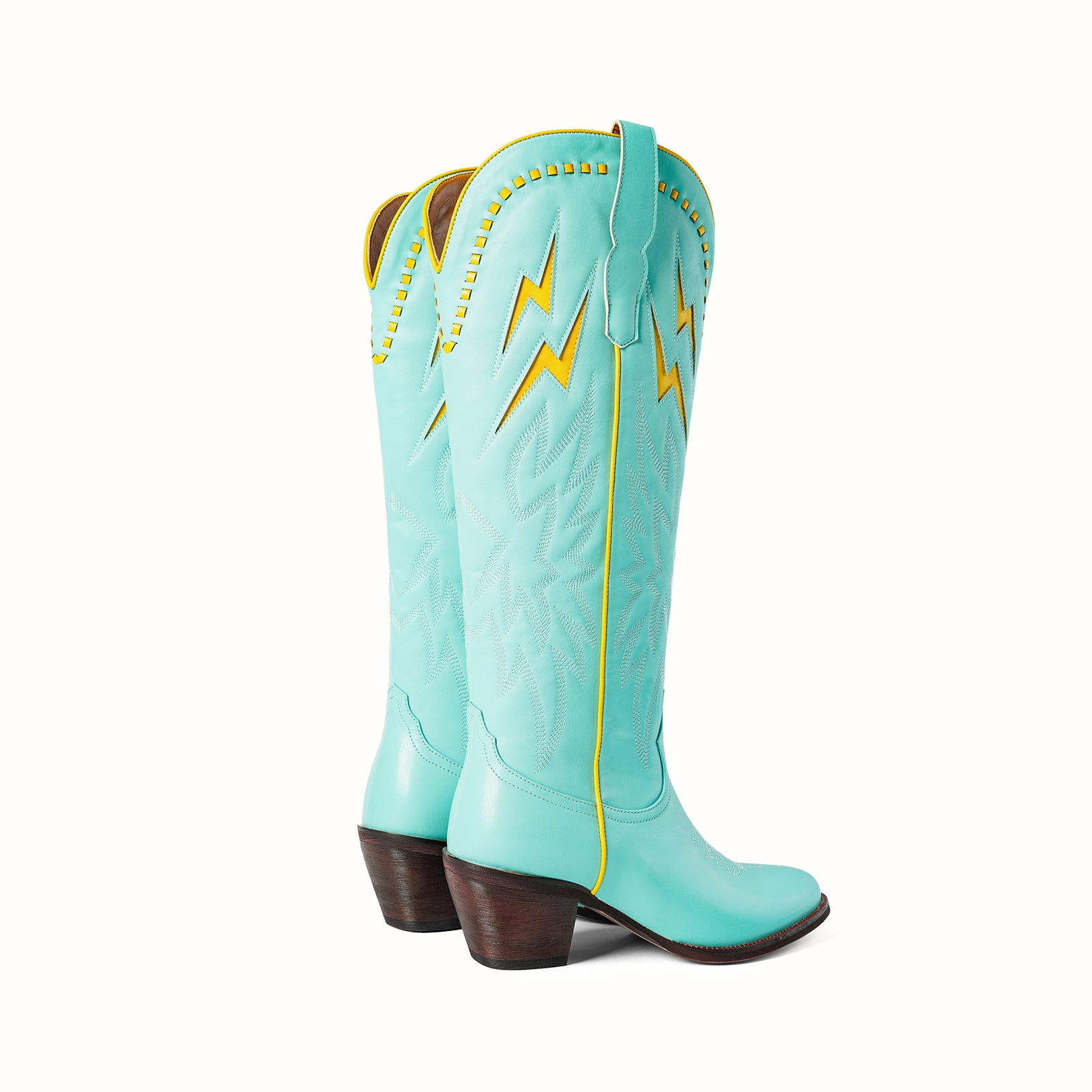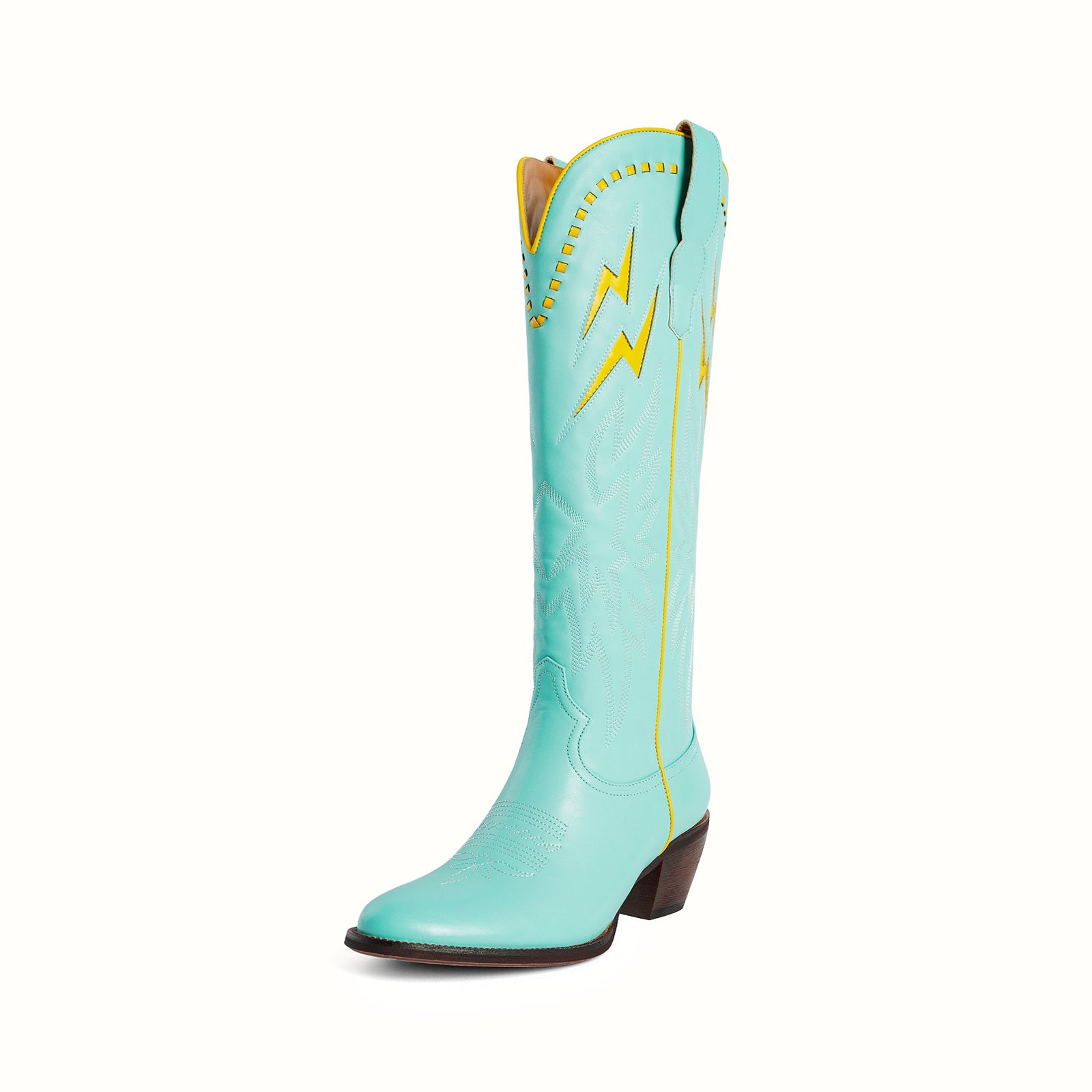 Knee-high tall lightning inlay and running stitch vegan leather Western boots in turquoise.